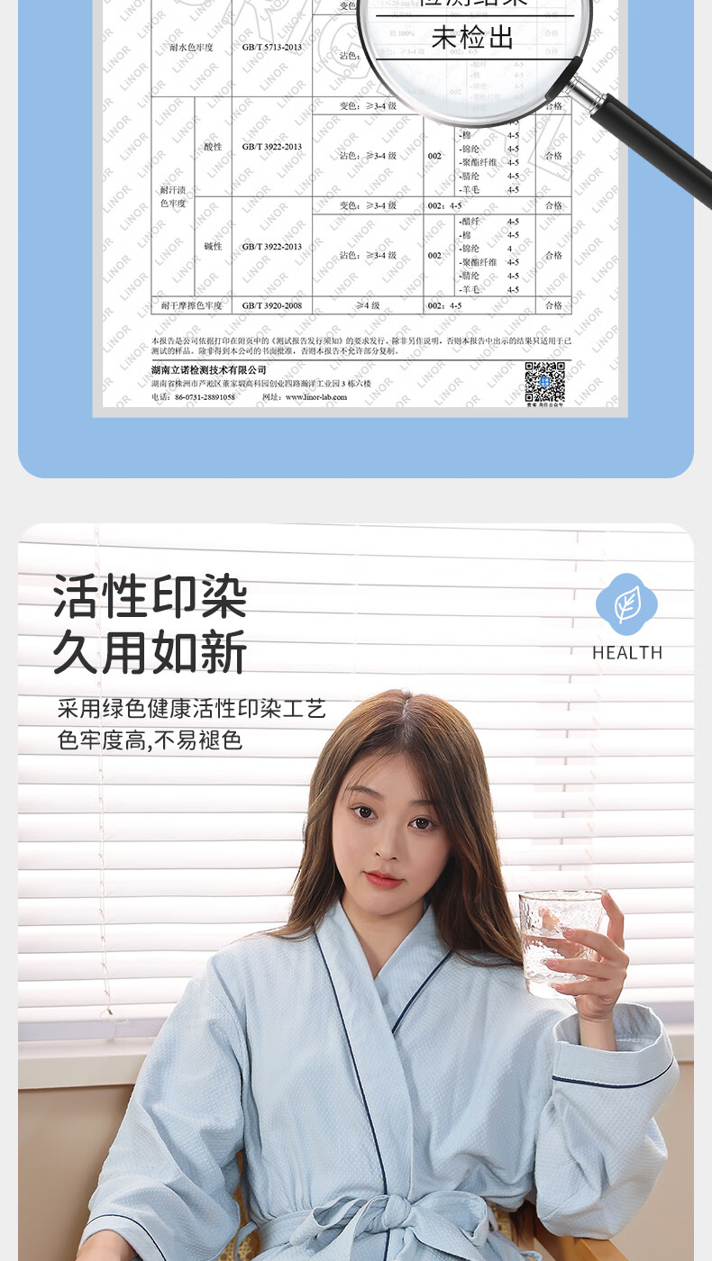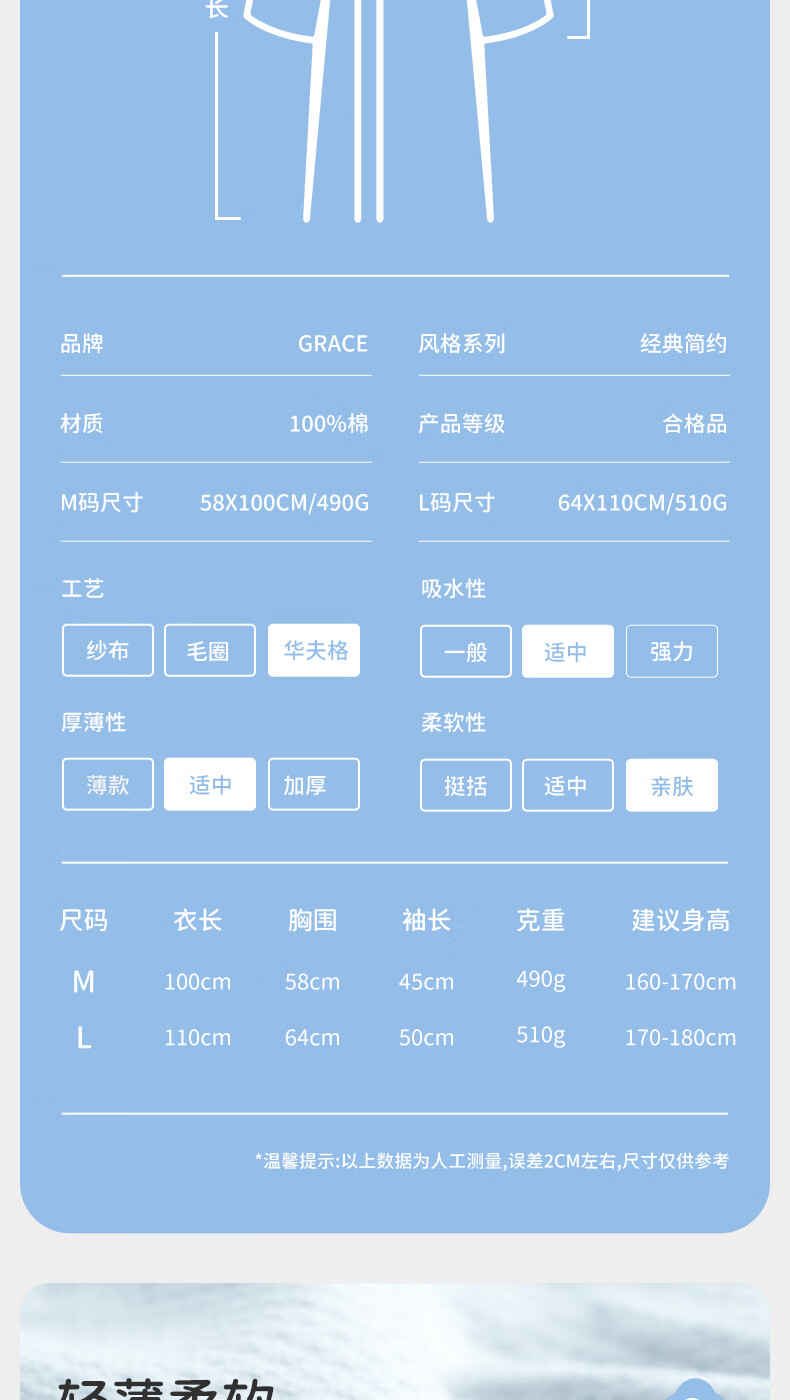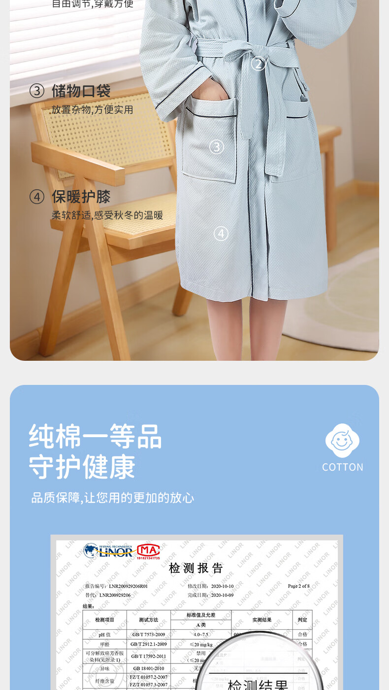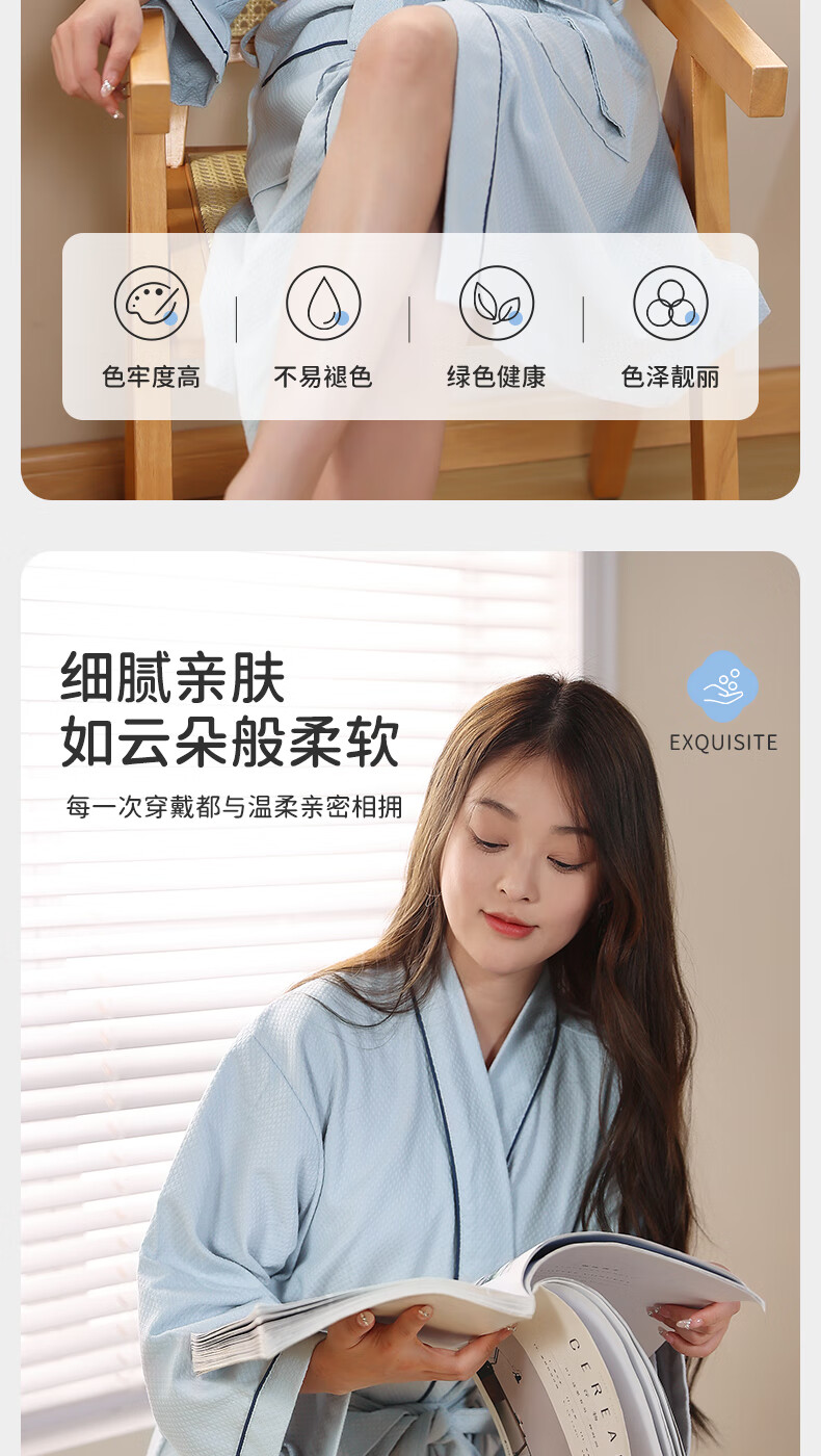 洁丽雅 五星级酒店浴袍情侣纯棉柔软吸水浴衣全棉汗蒸服男女通用月灰 L