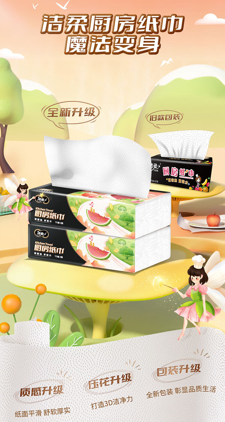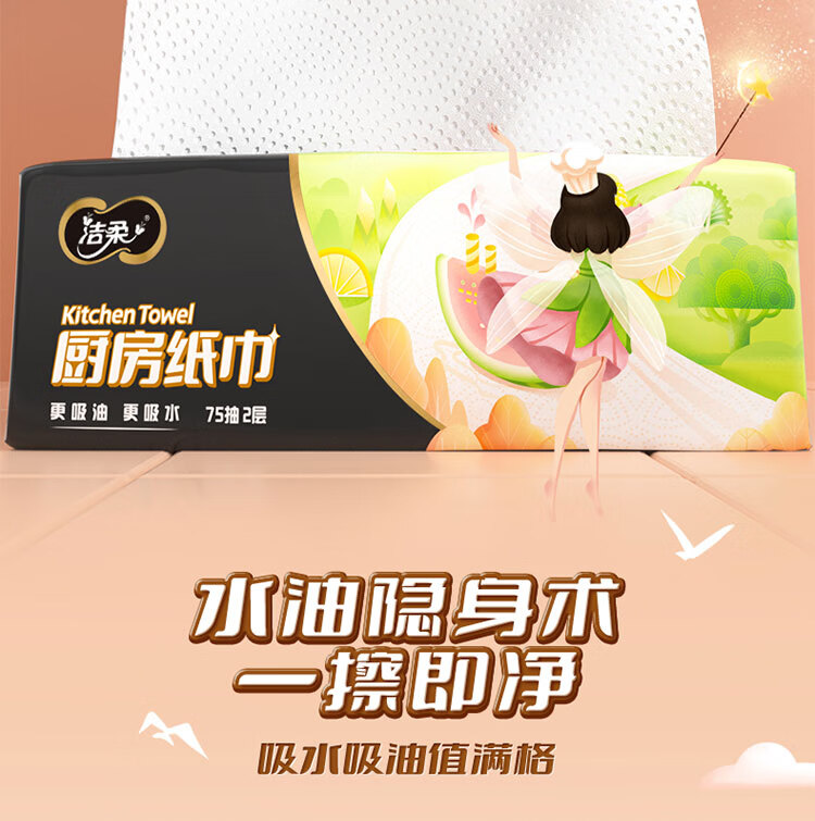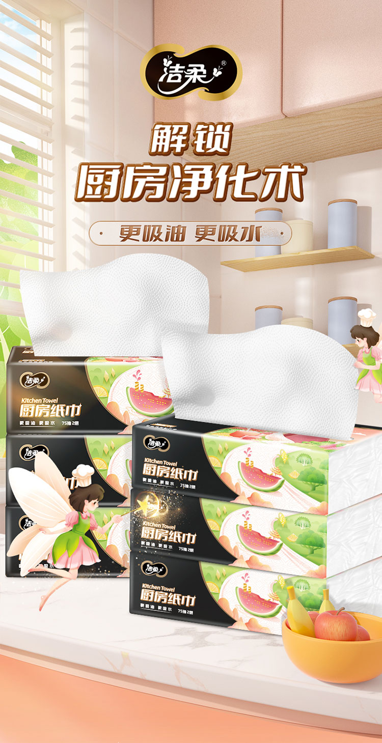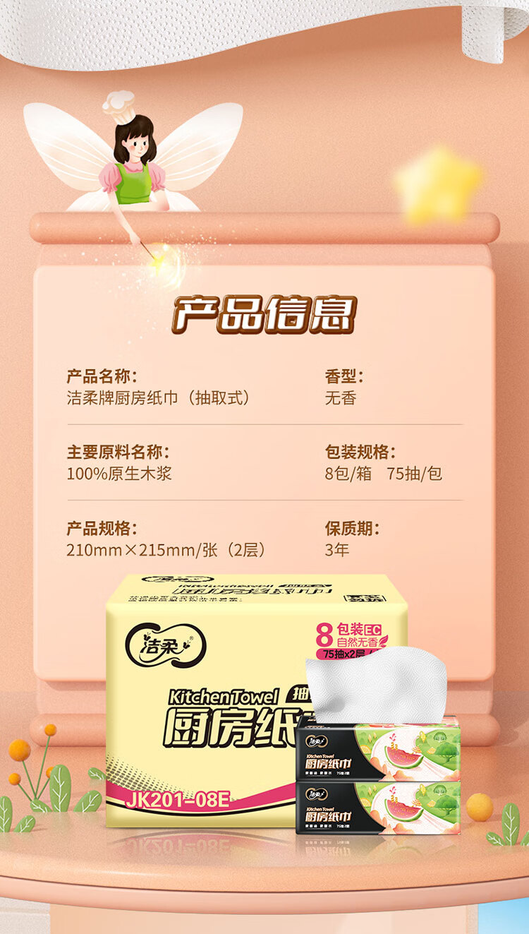 洁柔厨房抽纸 双层加厚75抽*8包 XL号大规格 轻松去油污 代替抹布