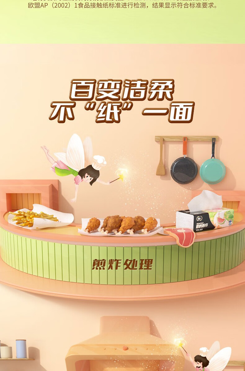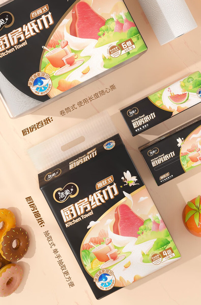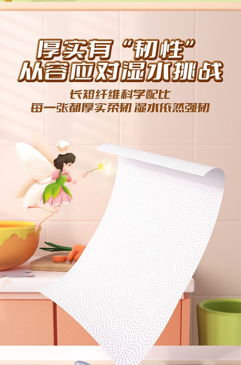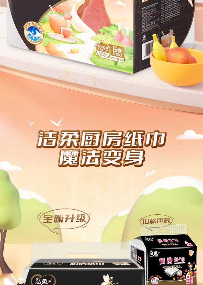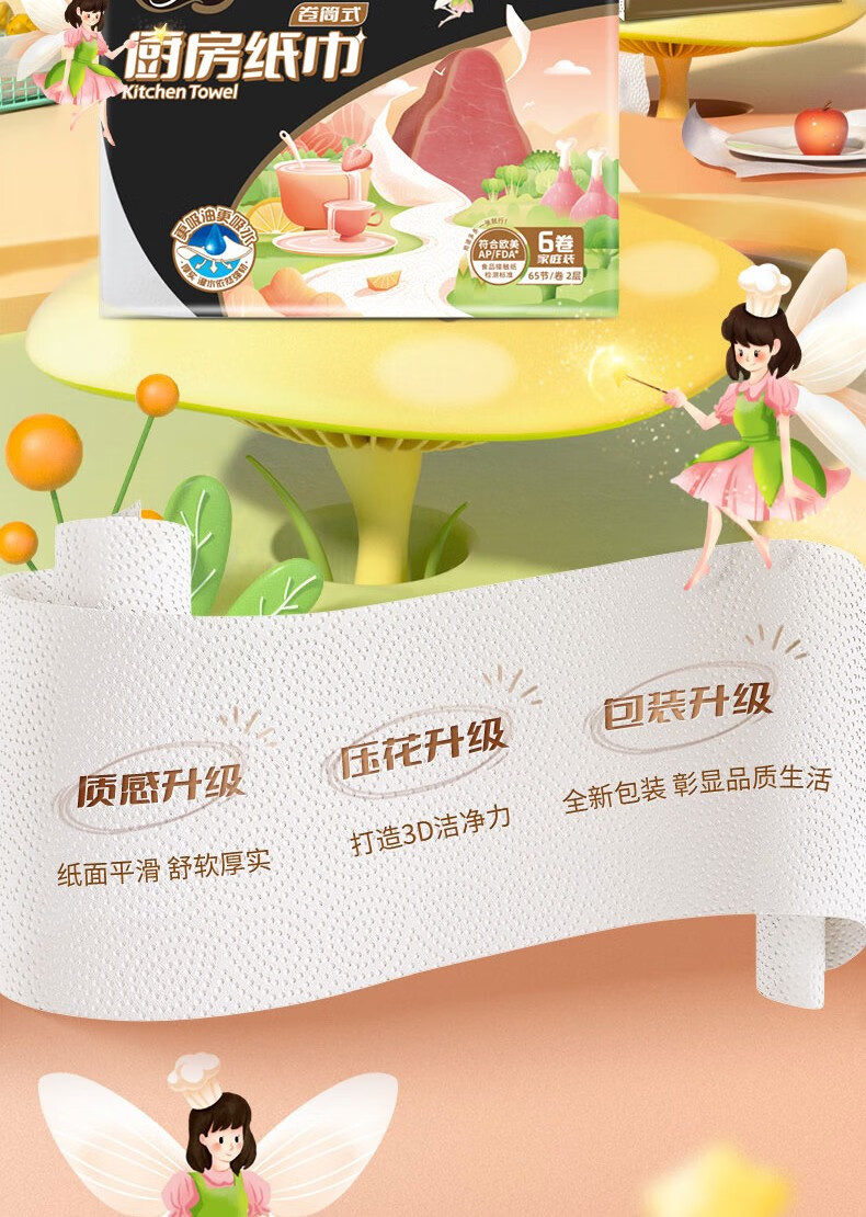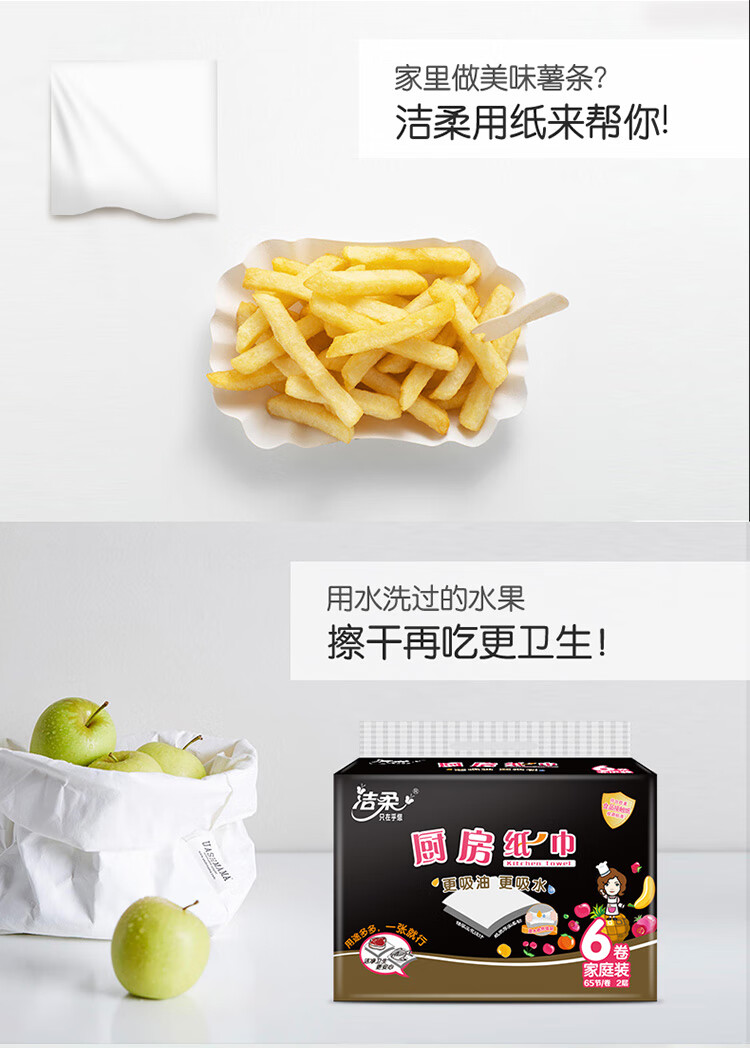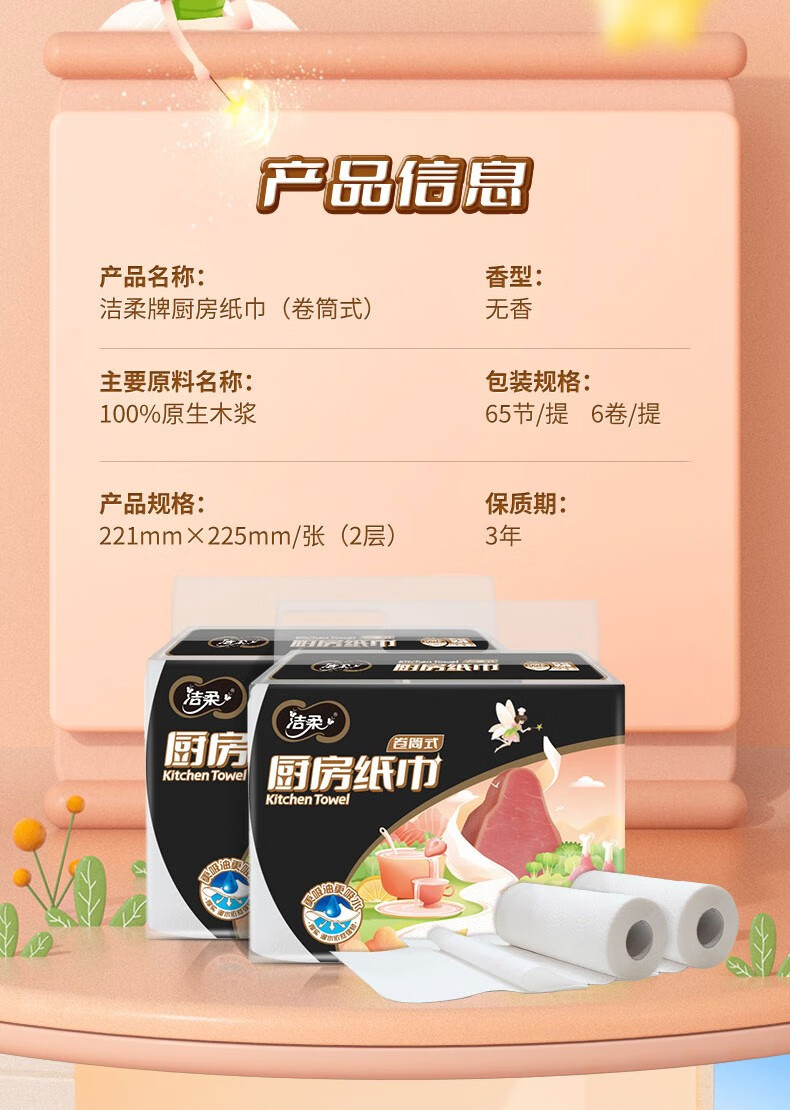 洁柔厨房卷纸 加厚双层65节*6卷 料理用纸 3D花纹 可直接包裹食物