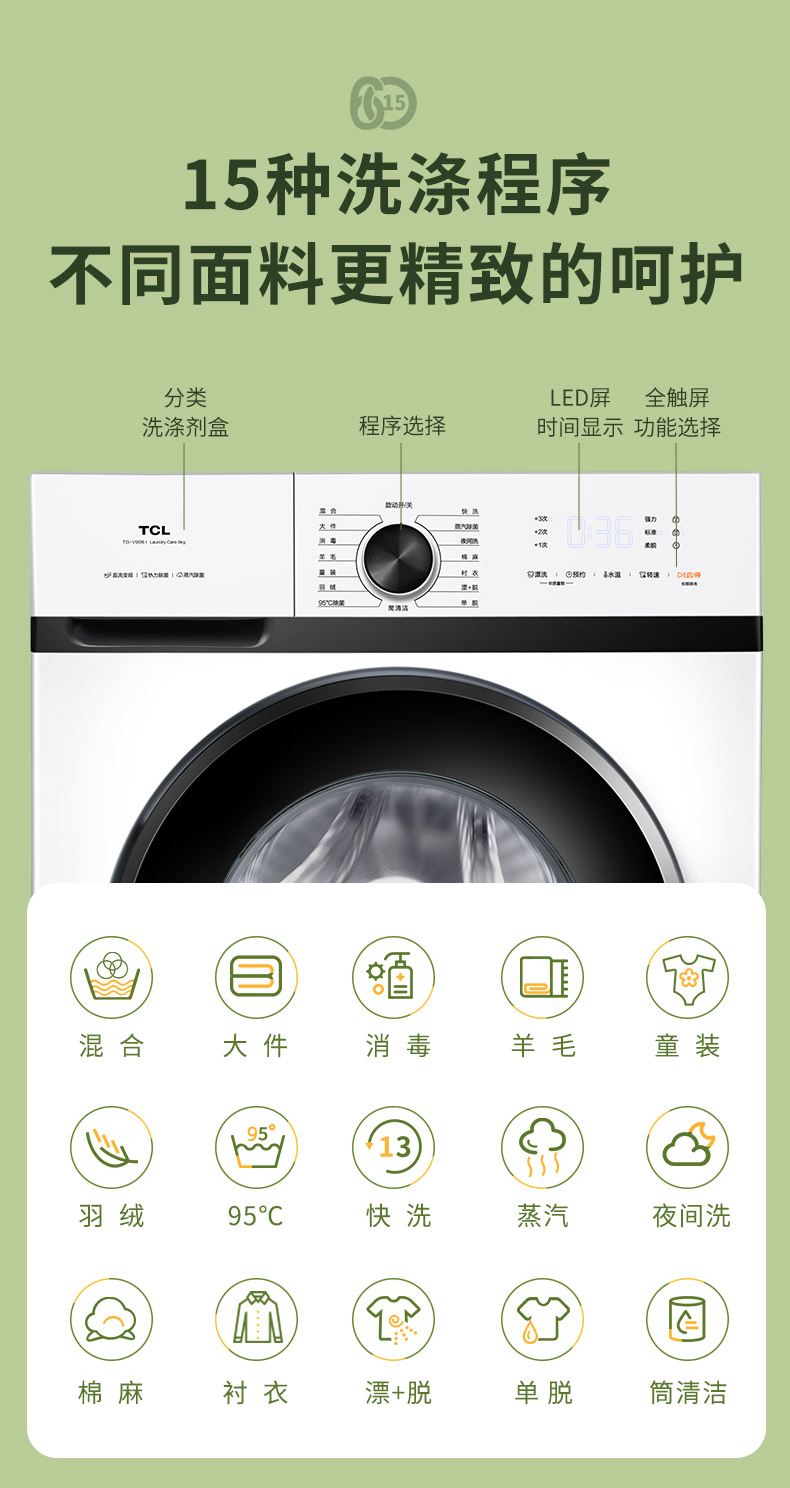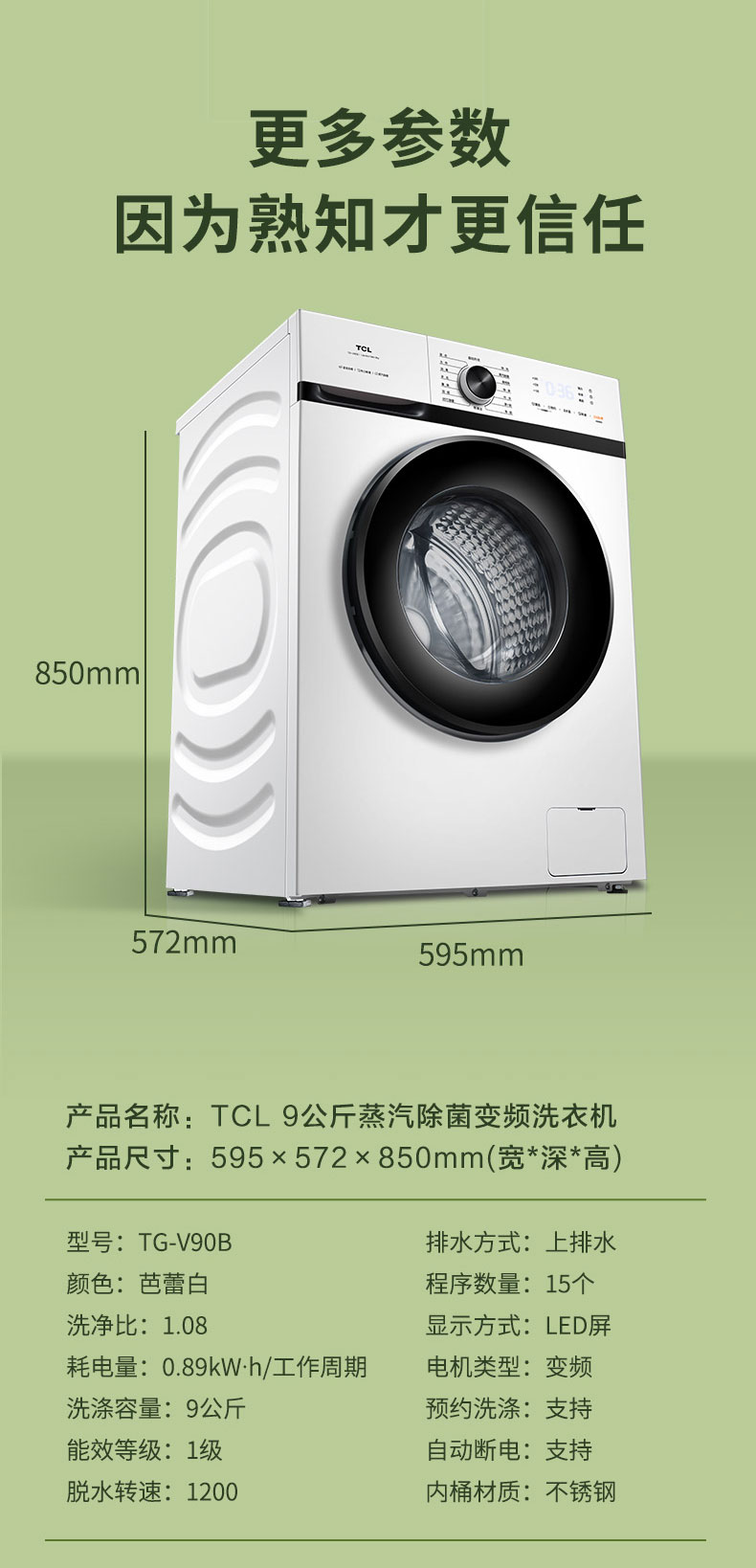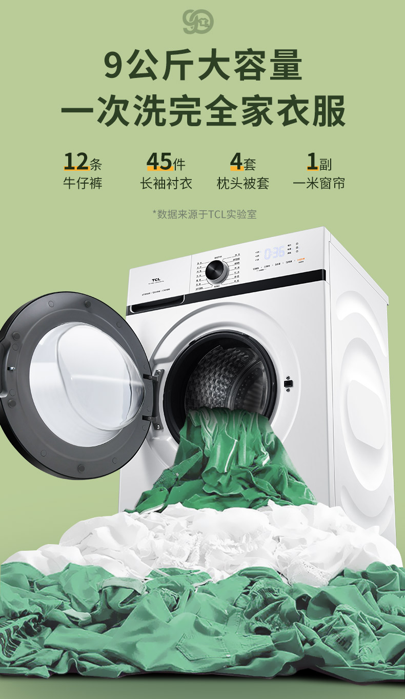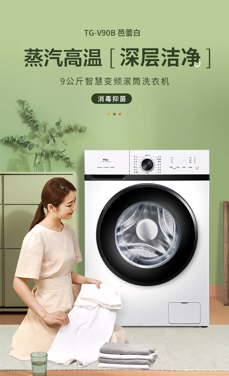 TCL一级能效 变频电机 6sense智慧感知 15种洗涤程序 9公斤全自动滚筒洗衣机 TG-V90B【企业采购】