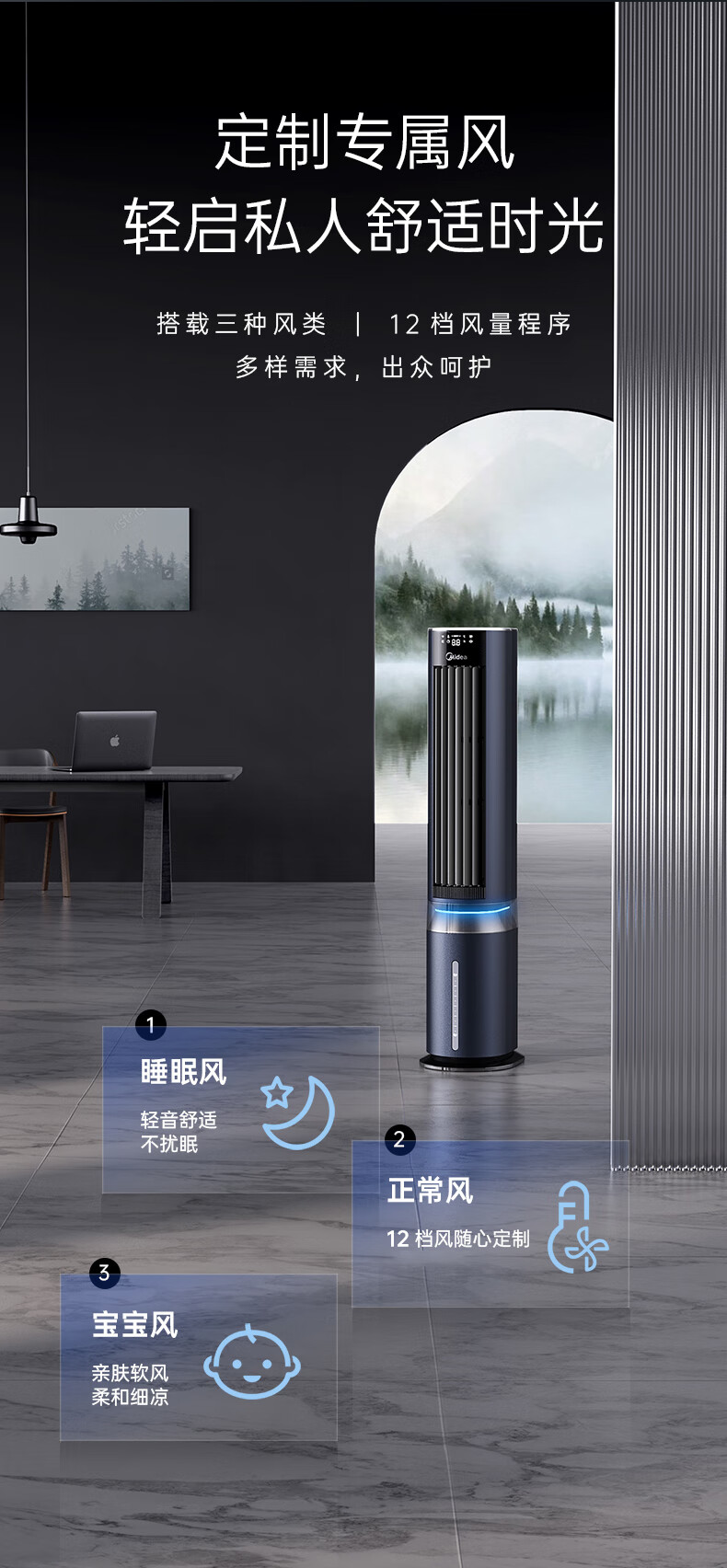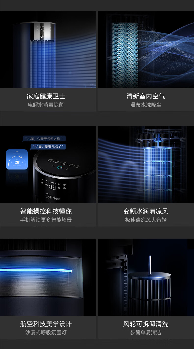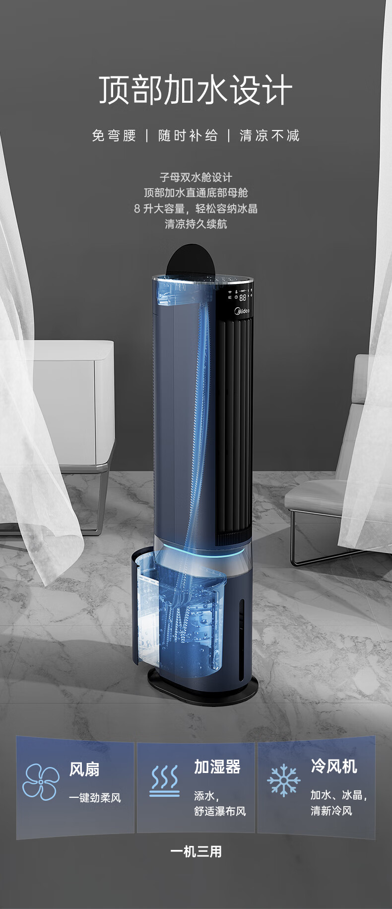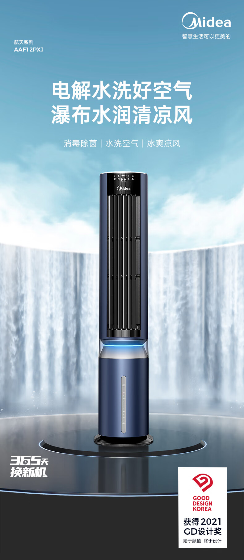美的(Midea)冷风空调扇风机电解水降温净滤加湿易拆洗大风量遥控轻音双水箱风随温变AAF12PXJ(线下同款)
