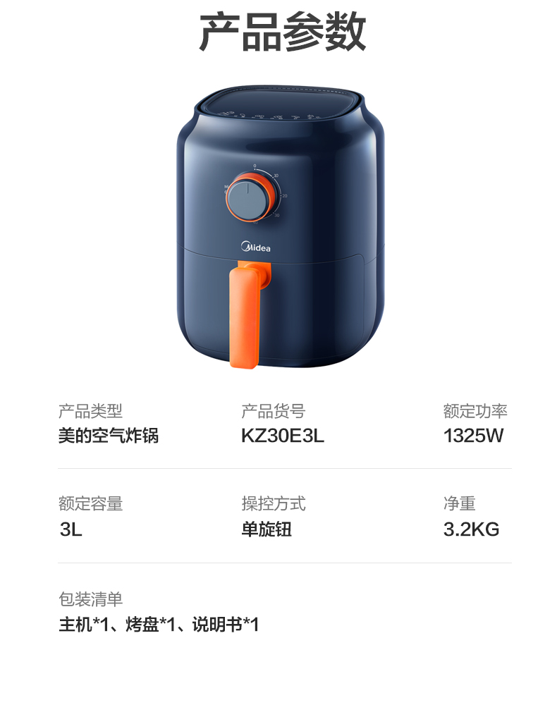 美的(Midea)无油空气炸锅家用大容量全自动多功能深空蓝KZ30E3L【企采专享系列】