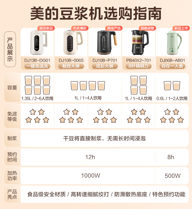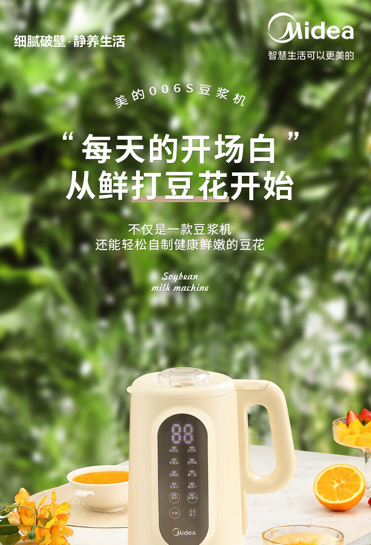 美的(Midea)豆浆机家用多功能破壁料理机双层防烫可做豆花免滤预约DJ10B-006S