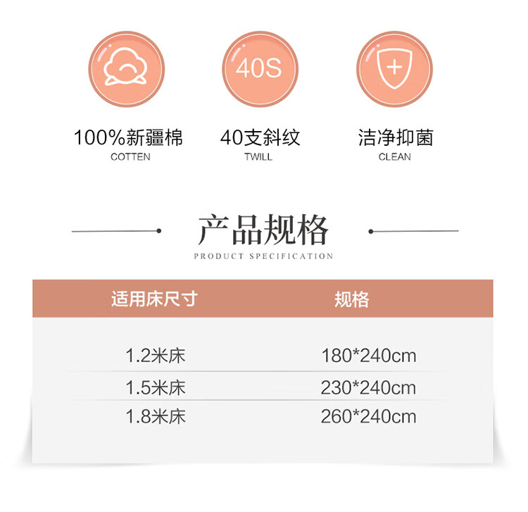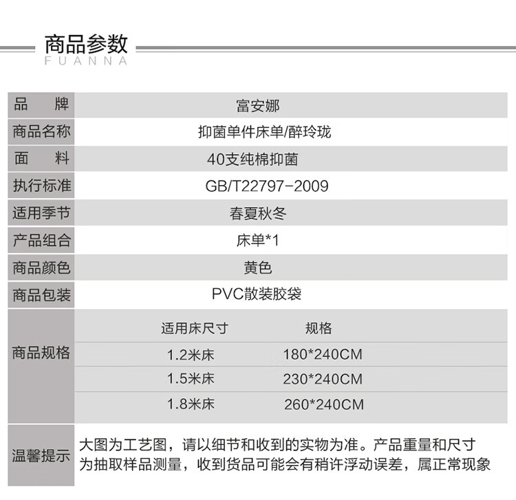 富安娜家纺纯棉床单全棉床品抗菌被单单件1米2/1米5床适用(180*240cm)