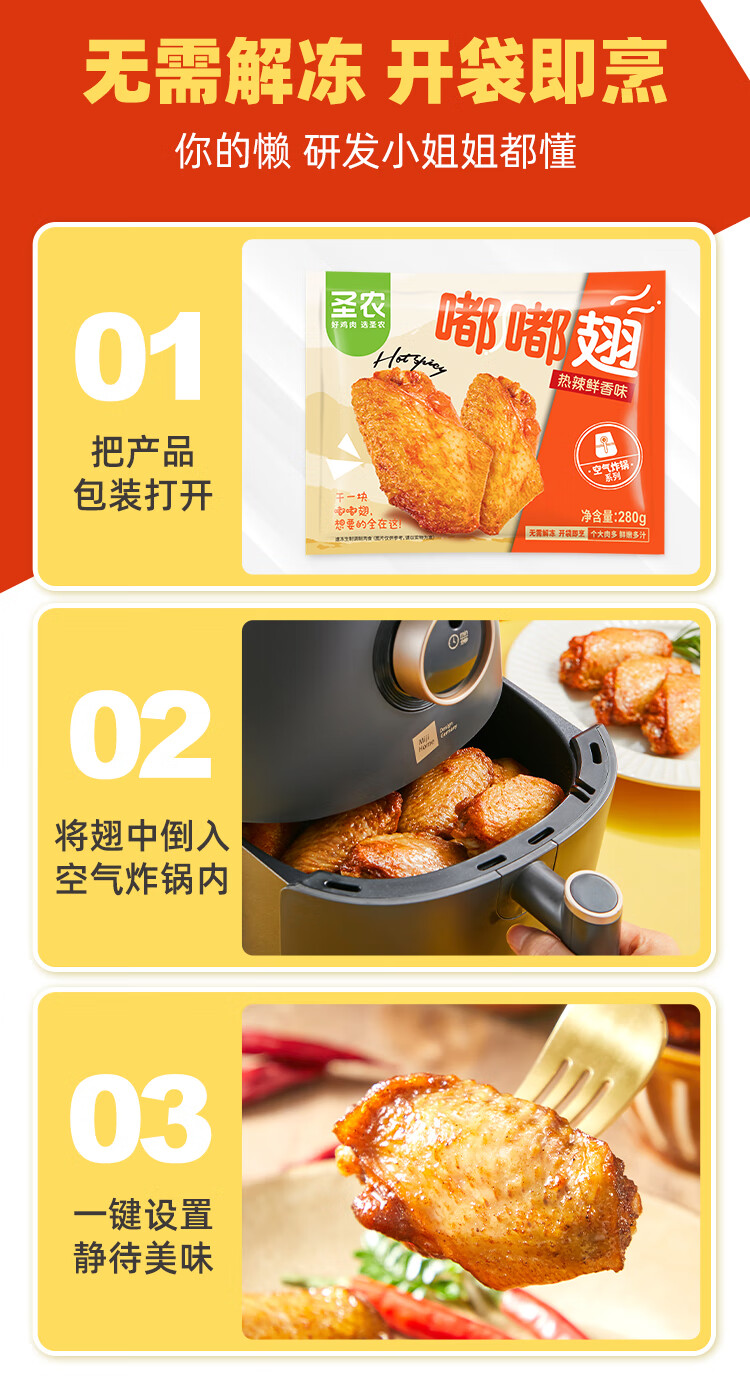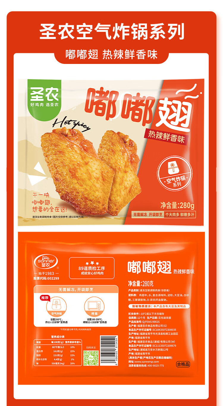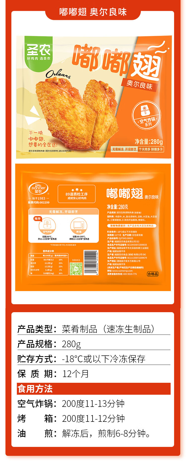 圣农 嘟嘟翅 翅中280g *2袋 奥尔良味 烤翅中 半成品鸡中翅 空气炸锅