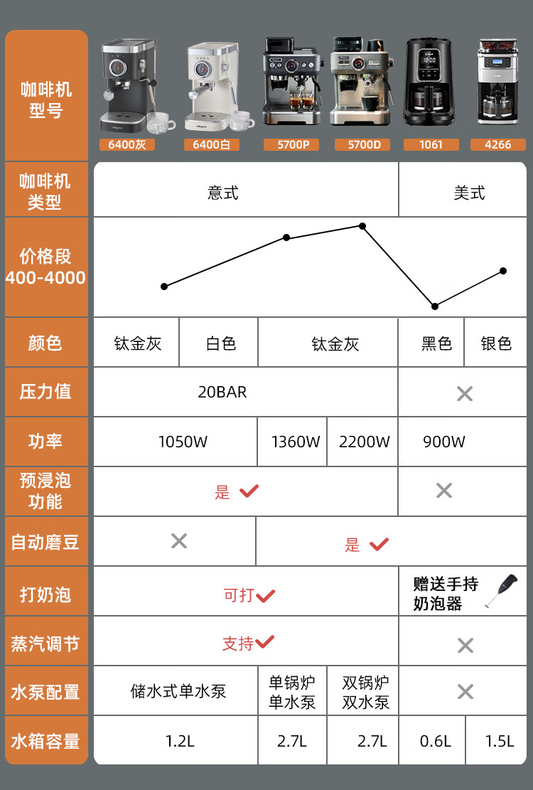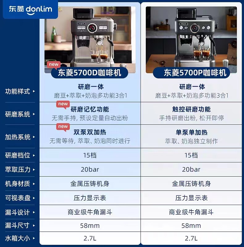 东菱(Donlim) 咖啡机 咖啡机家用 意式半自动 研磨一体机 20Bar高压萃取 蒸汽打奶泡 DL-5700P(钛金灰)