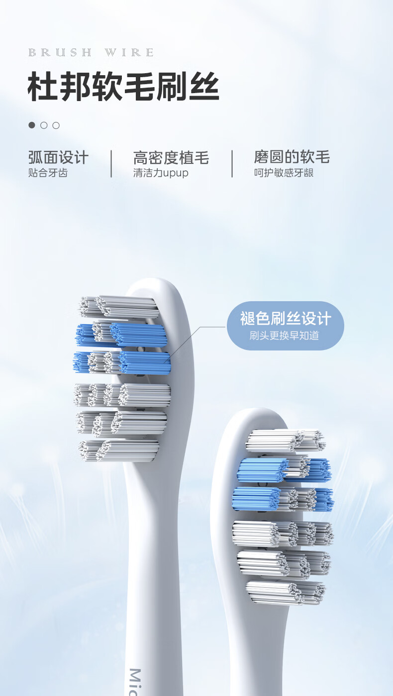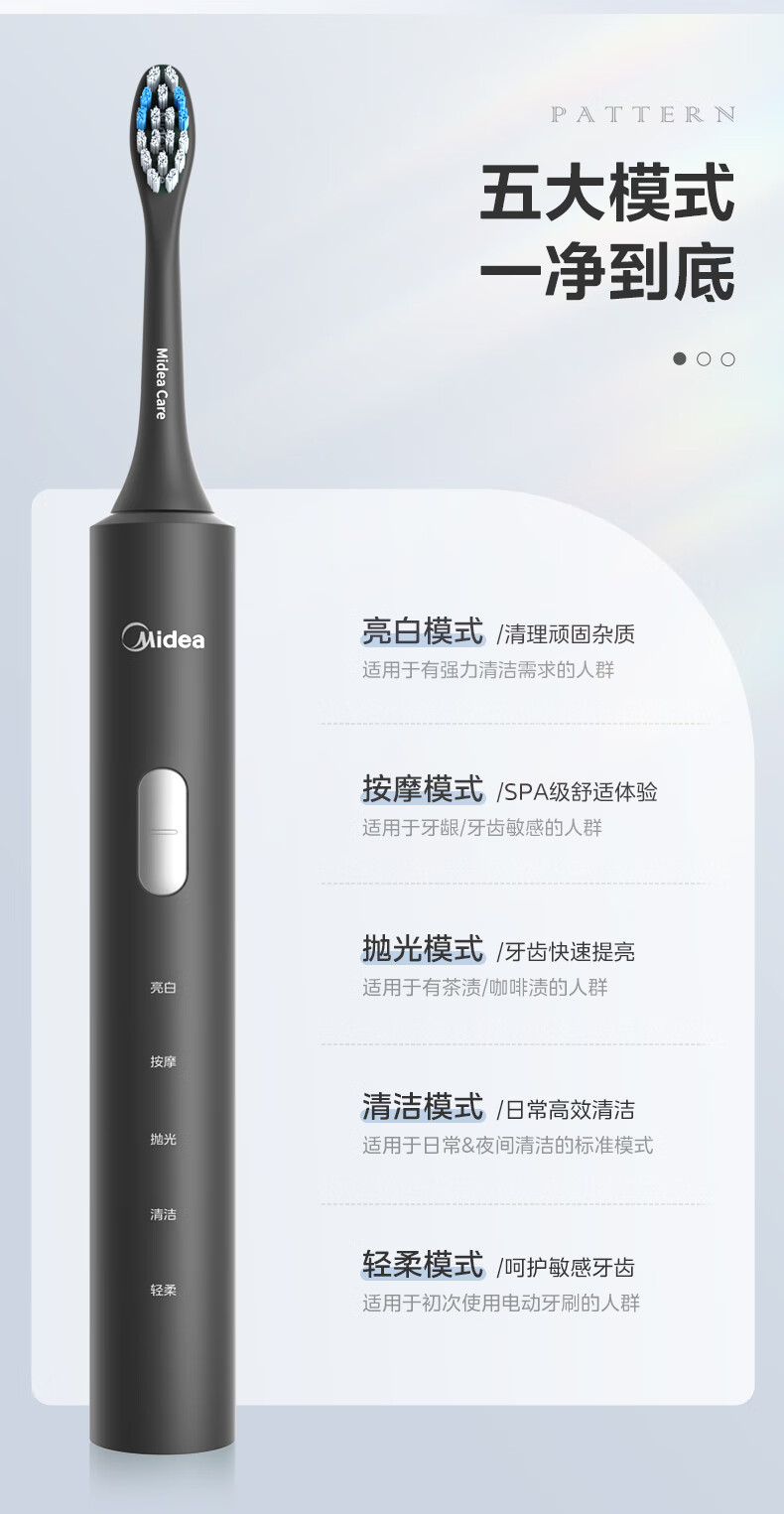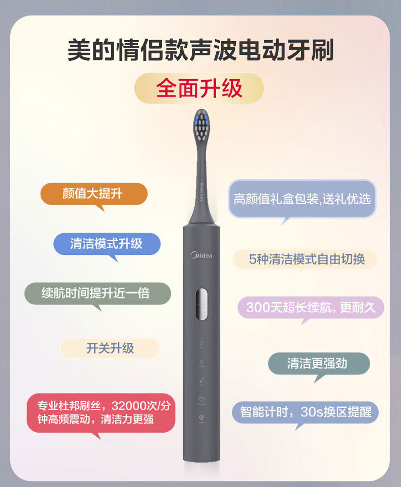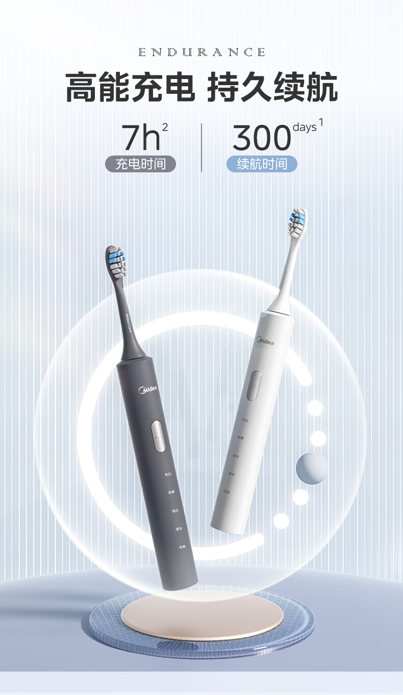 美的(Midea)电动牙刷成人/学生 声波震动 300天长续航 智能换区 软毛刷头*2 七夕情人节礼物 情侣款 小米白