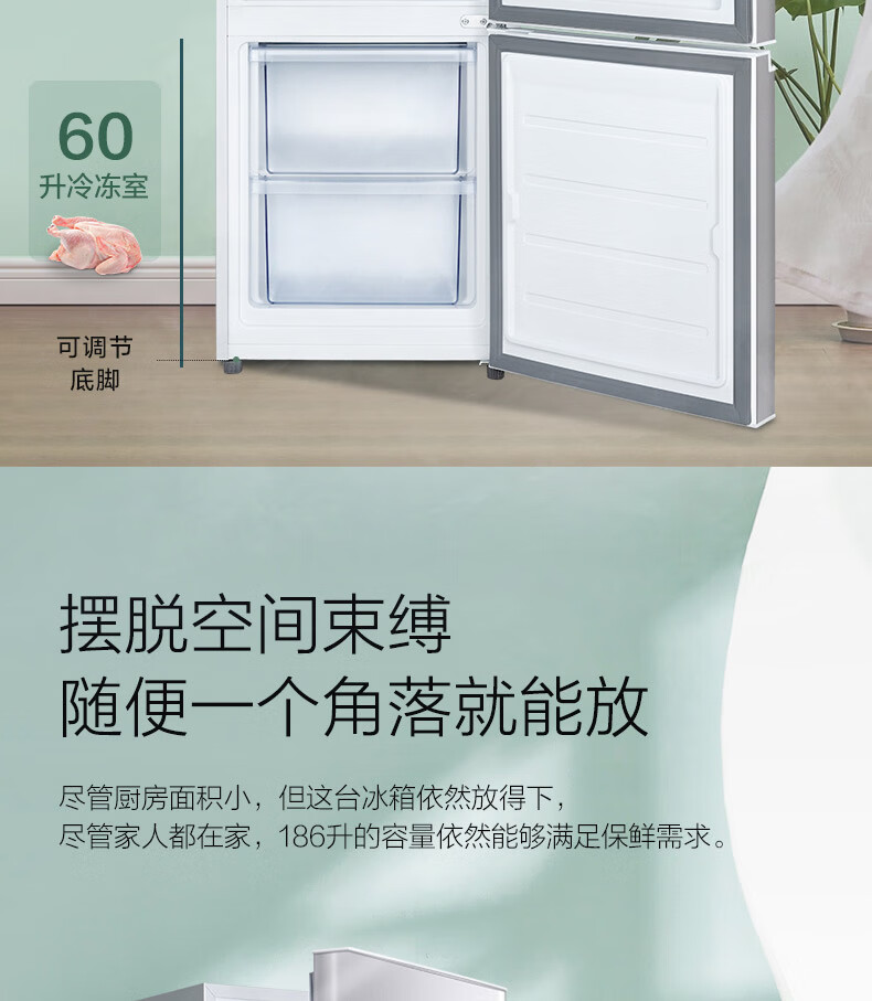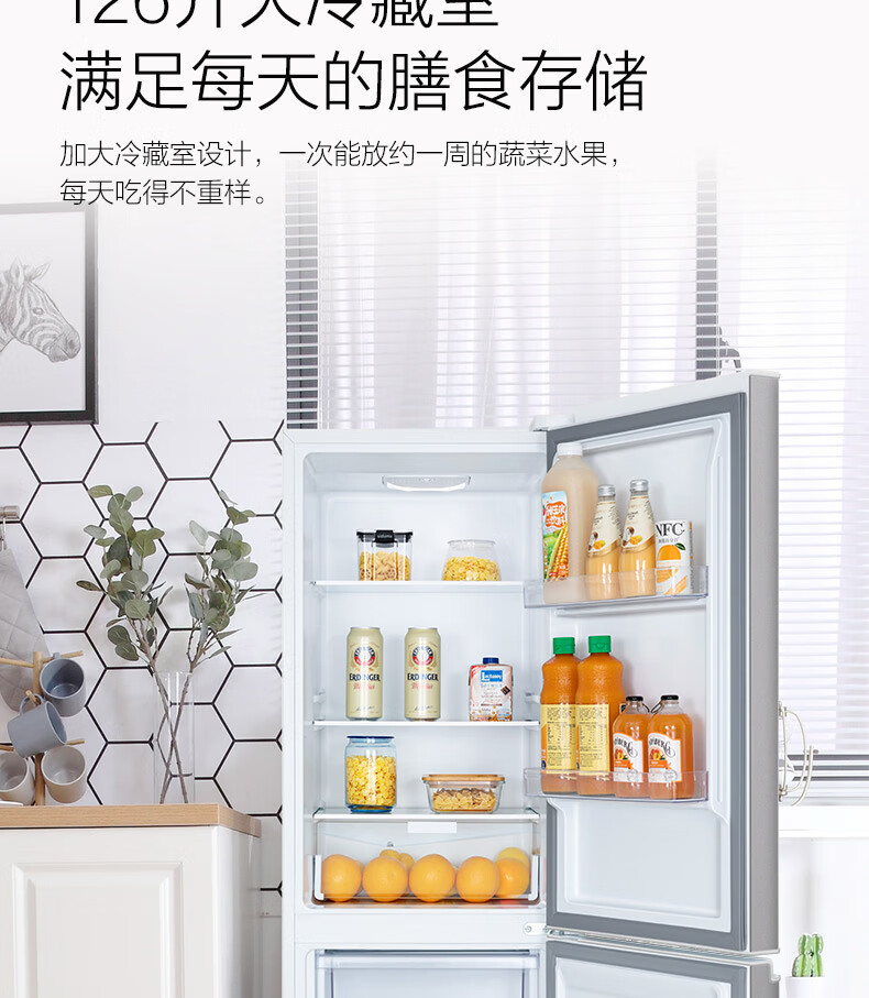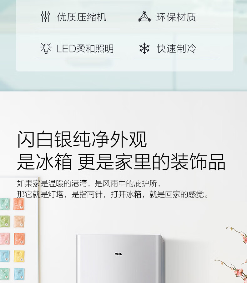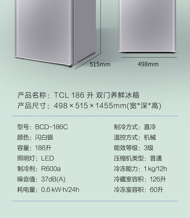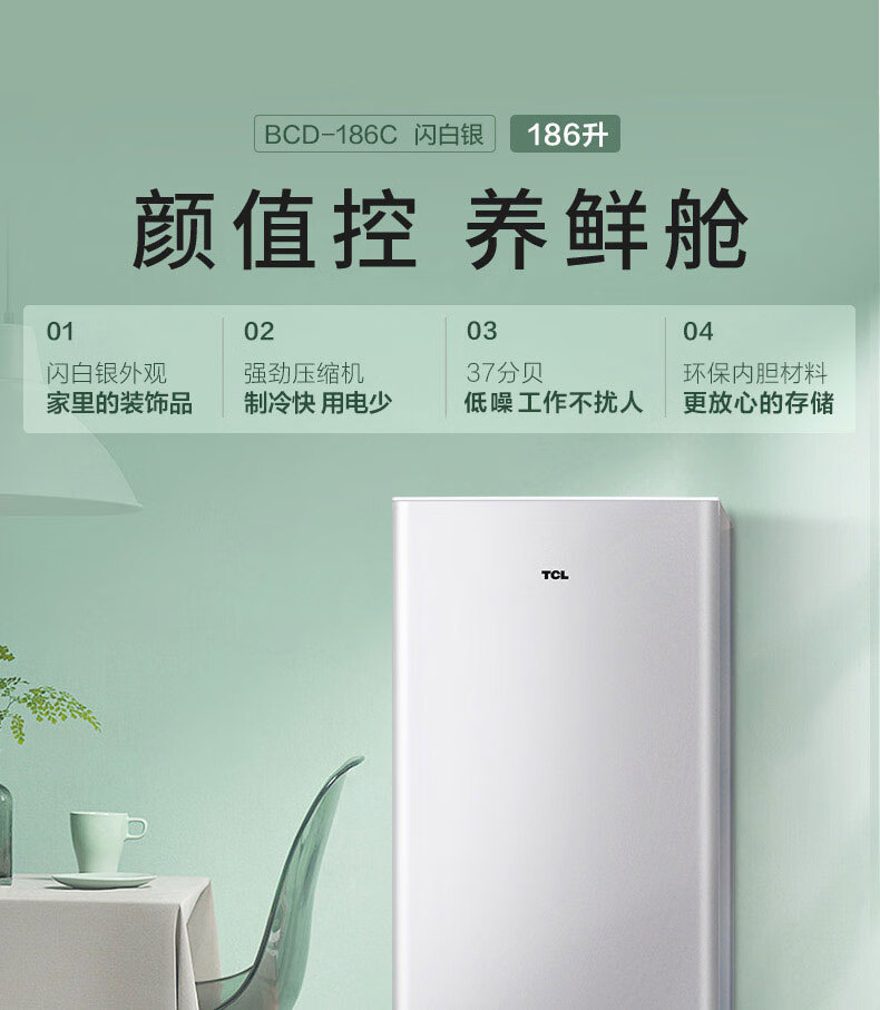 TCL冰箱186升大冷藏室 快速制冷环保材质小冰箱 强劲冷冻 BCD-186C闪白银