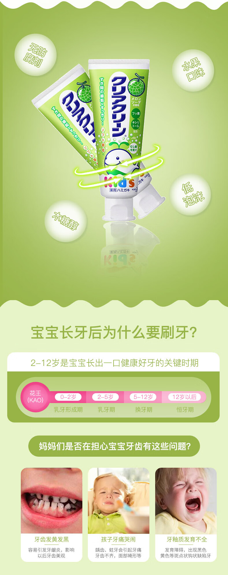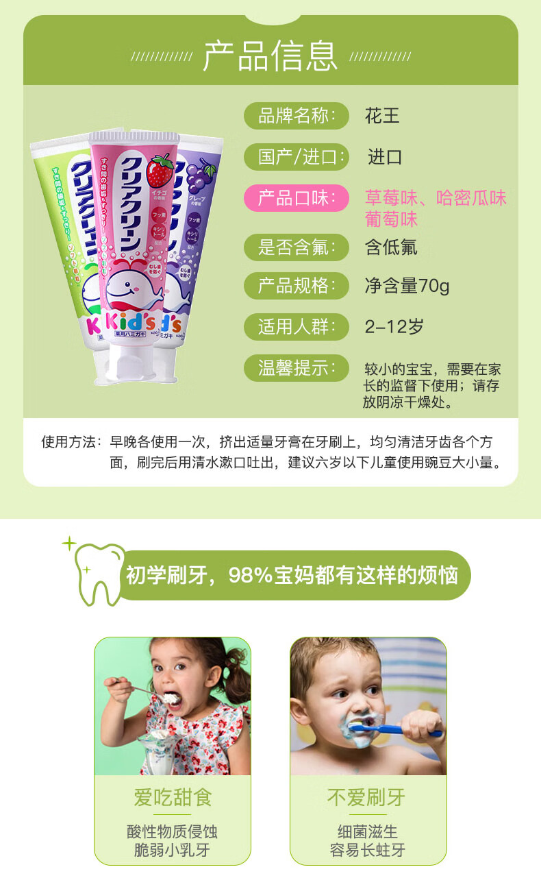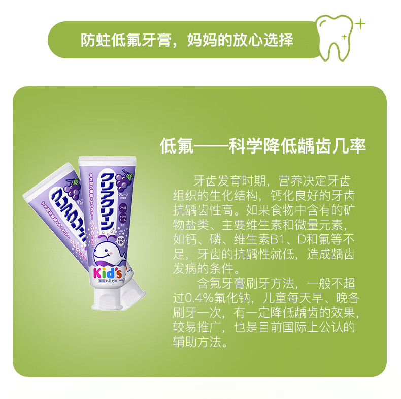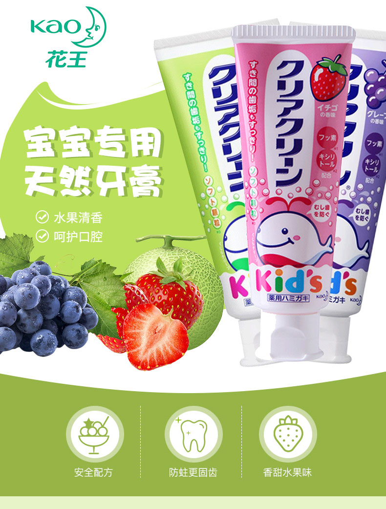 花王(KAO)日本原装进口 儿童牙膏木糖醇氟素含氟 宝宝牙膏防蛀 婴幼儿牙膏 2-12岁 葡萄味70g 单支装