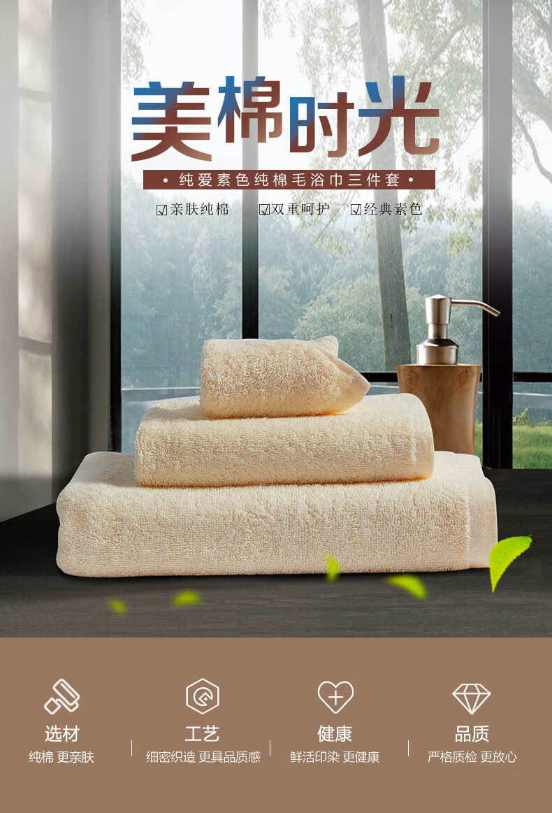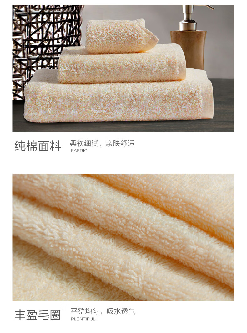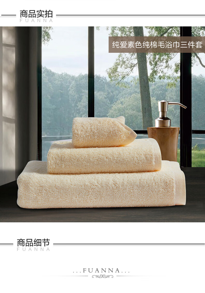 富安娜纯爱素色纯棉毛浴巾三件套/米色