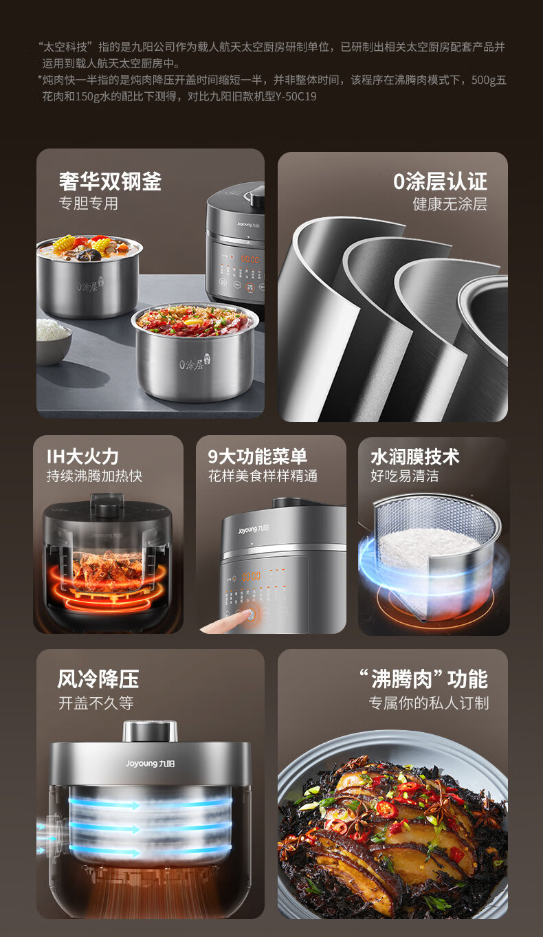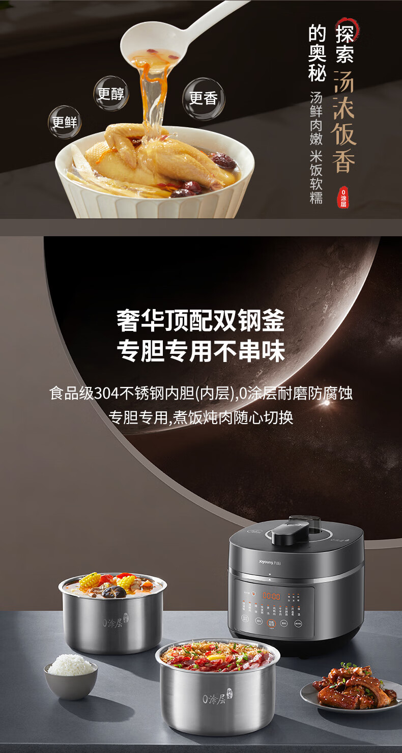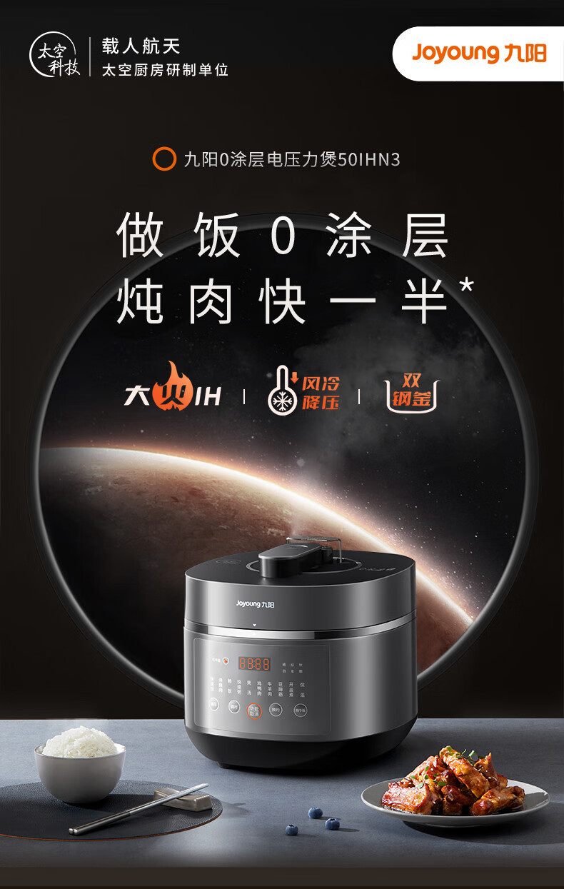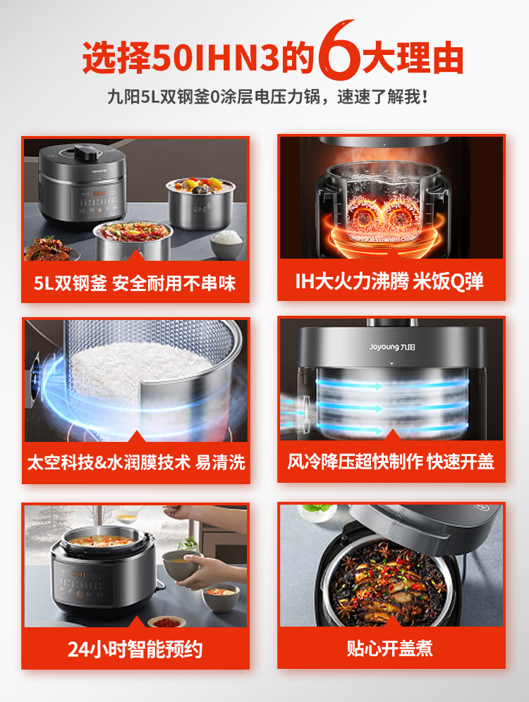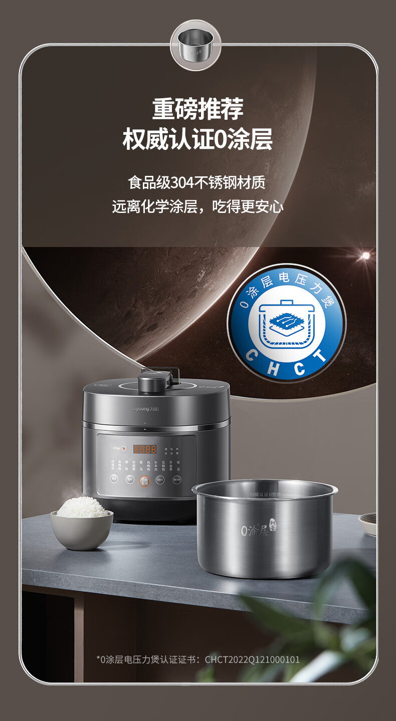 九阳(Joyoung)【0涂层】不锈钢双钢釜太空系列5升3-10人电压力锅高压锅无涂层1200WIH电磁加热5L压力煲50IHN3