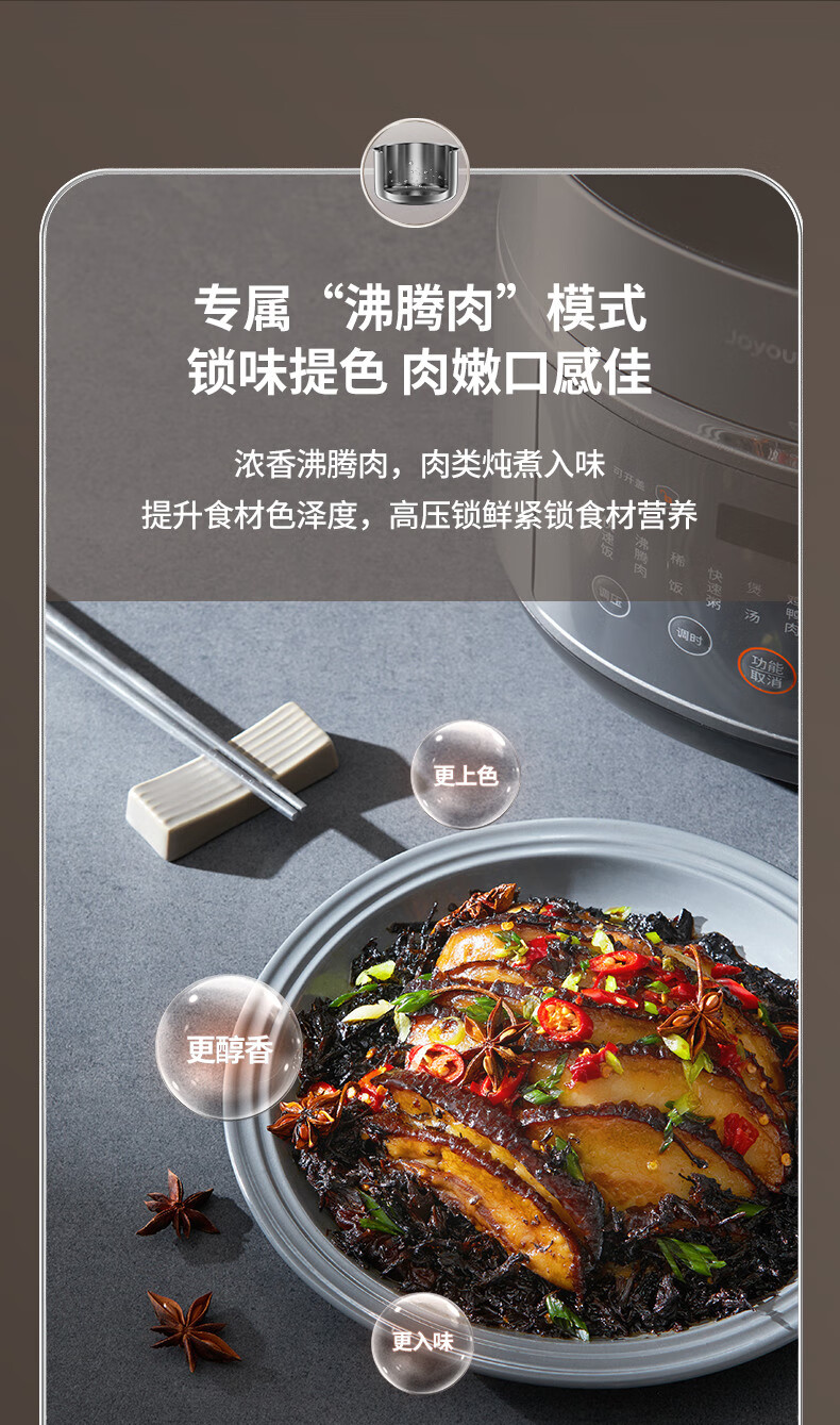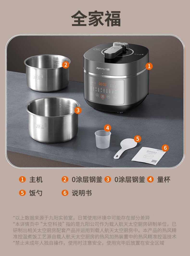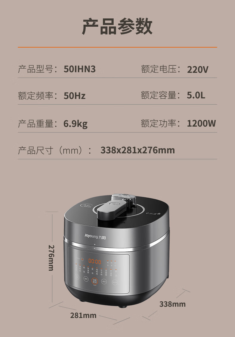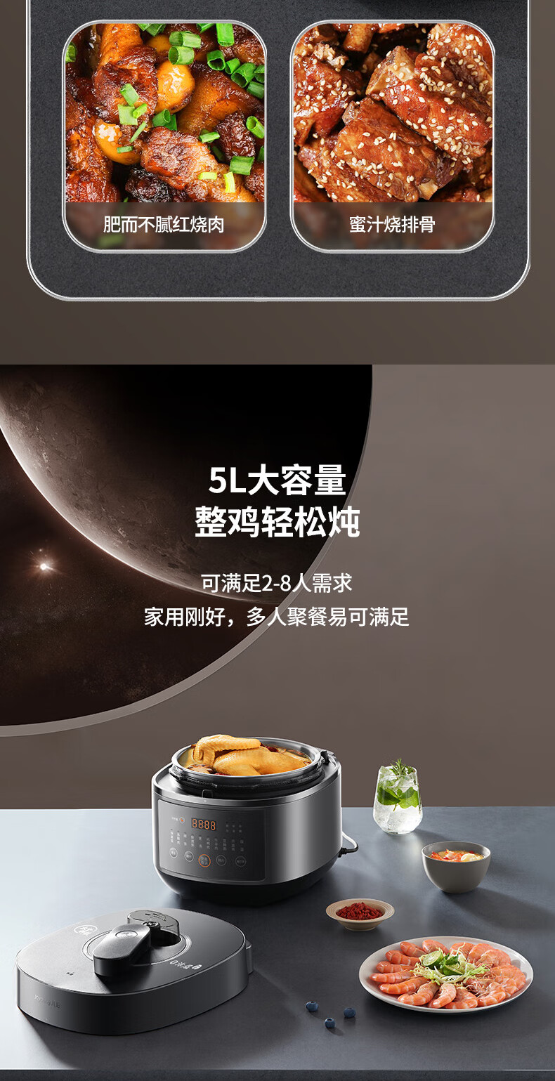 九阳(Joyoung)【0涂层】不锈钢双钢釜太空系列5升3-10人电压力锅高压锅无涂层1200WIH电磁加热5L压力煲50IHN3