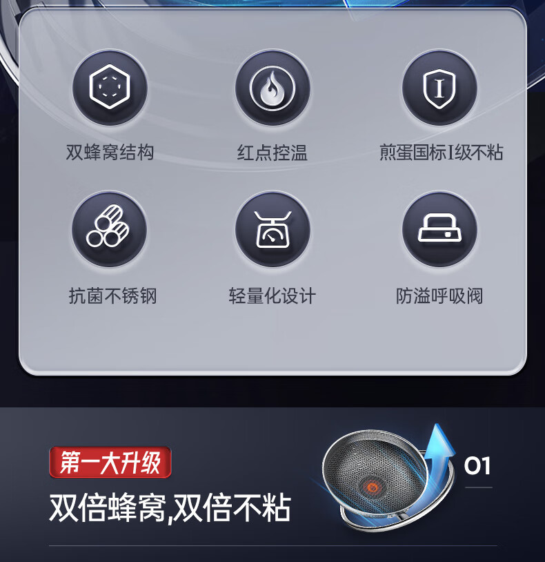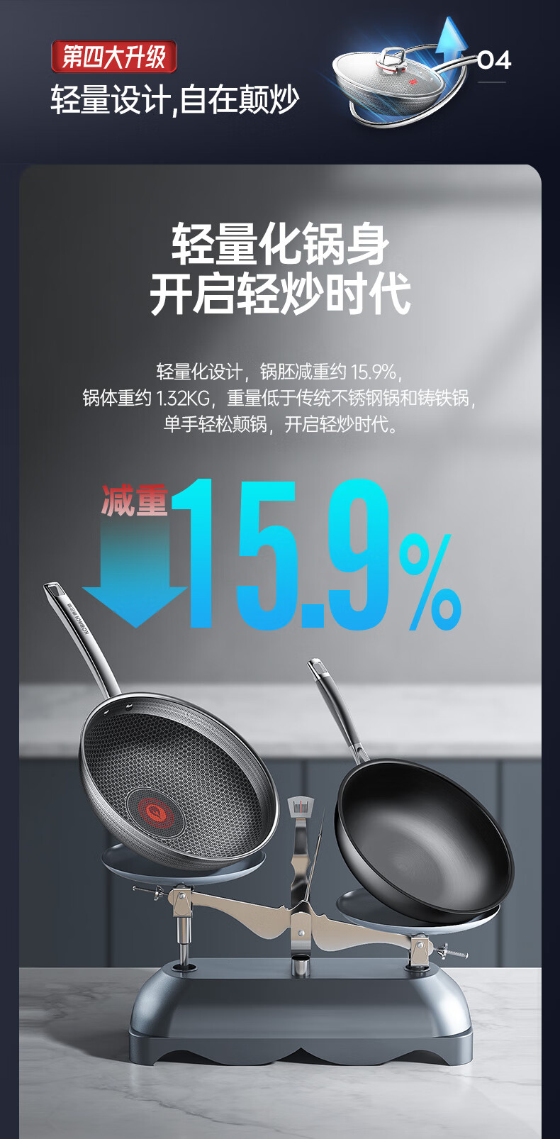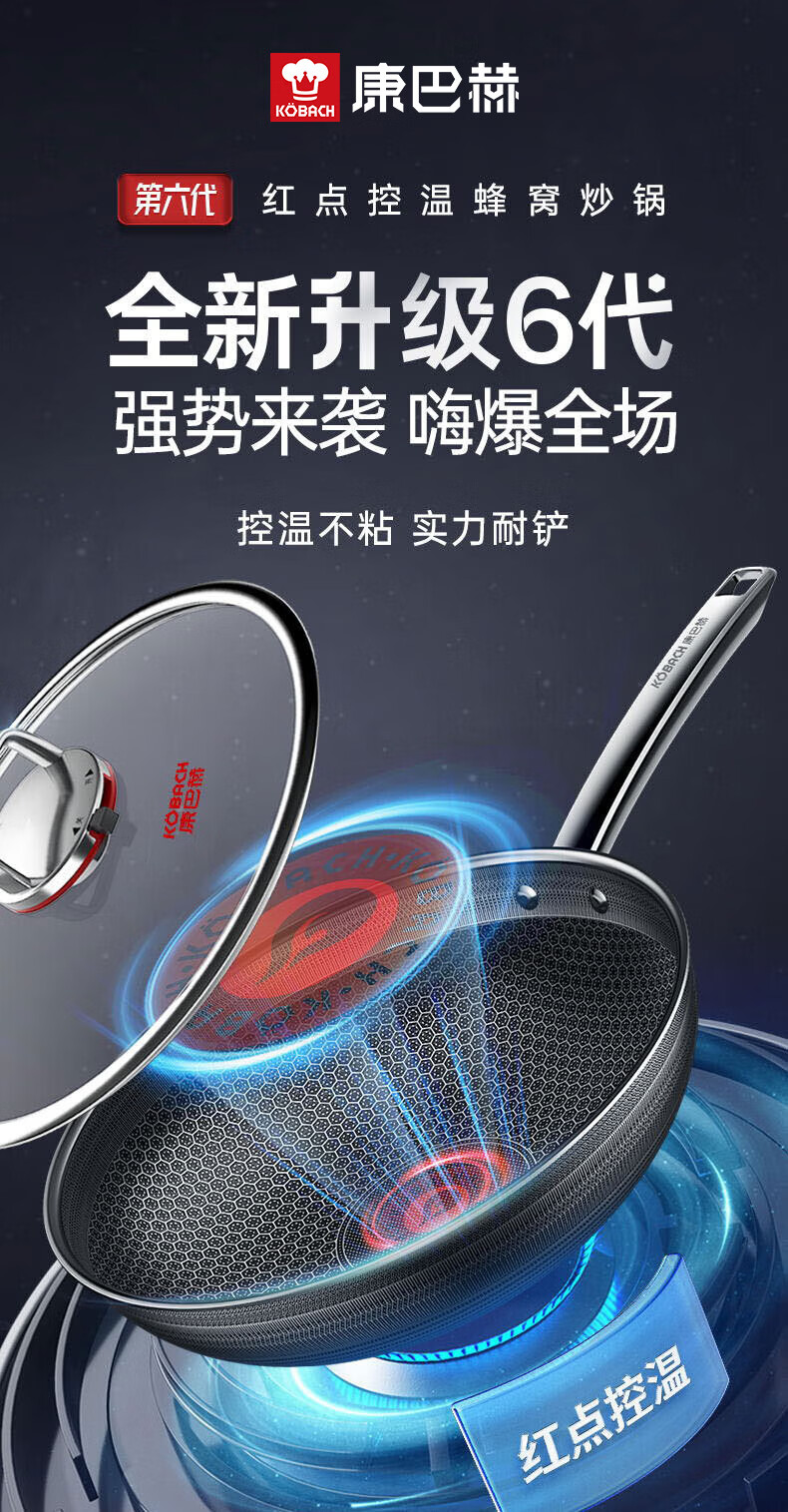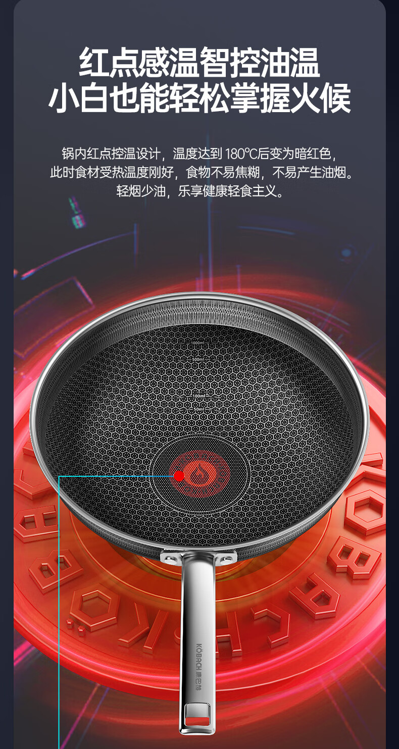 康巴赫第六代炒锅不粘锅抗菌不锈钢炒菜锅双蜂窝锅红点32cm电磁炉燃气灶
