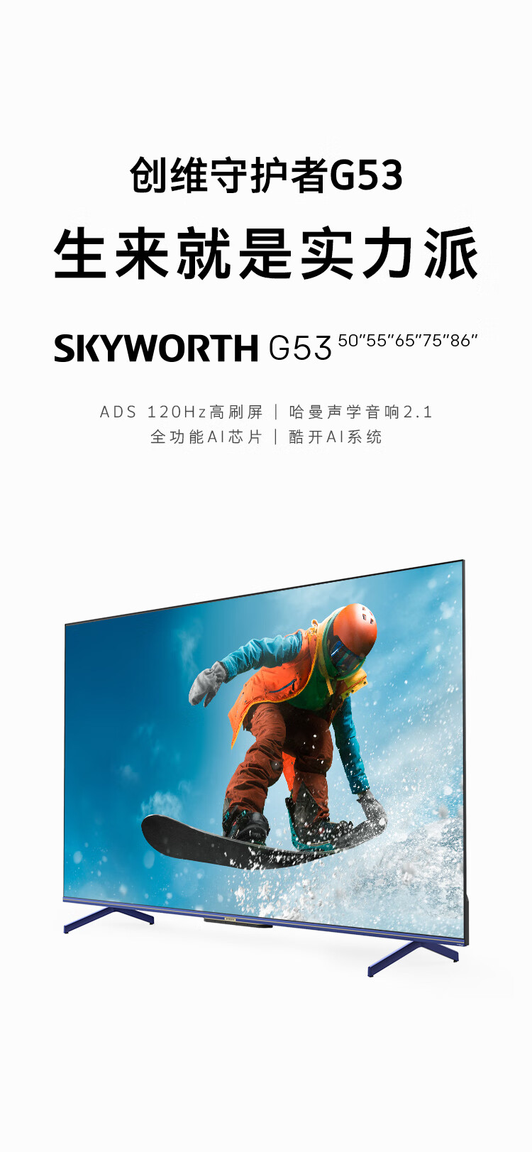 创维Skyworth 65G53 65英寸 4K 超高清 ADS 120Hz高刷屏 哈曼声学音响 第三代全功能AI芯片 守护者.