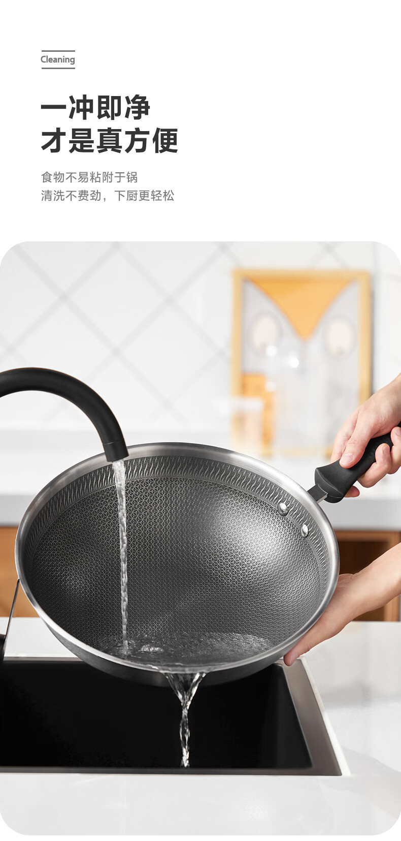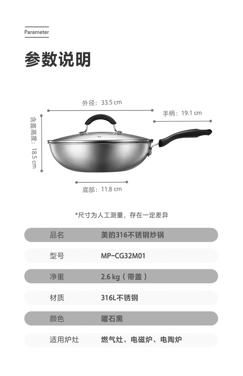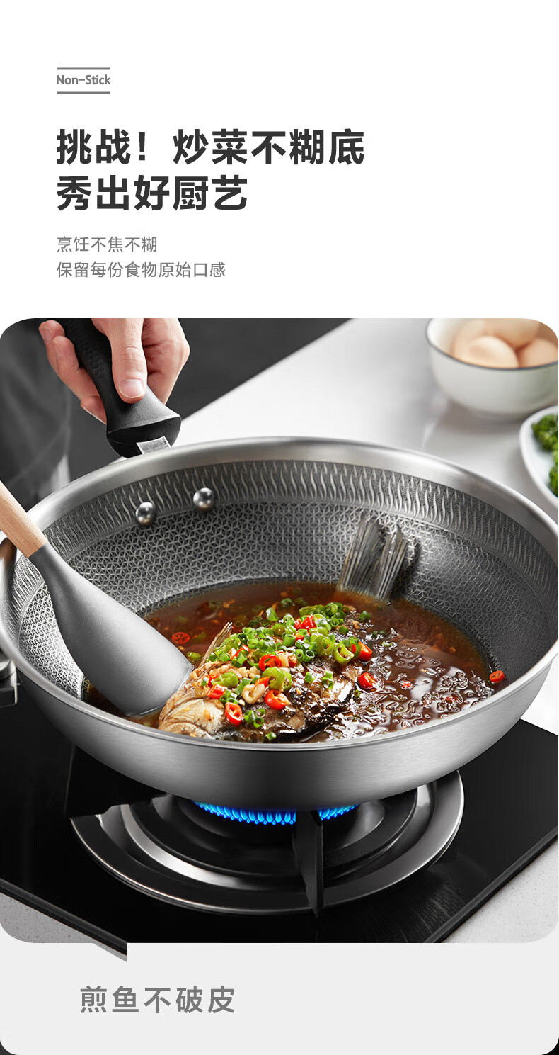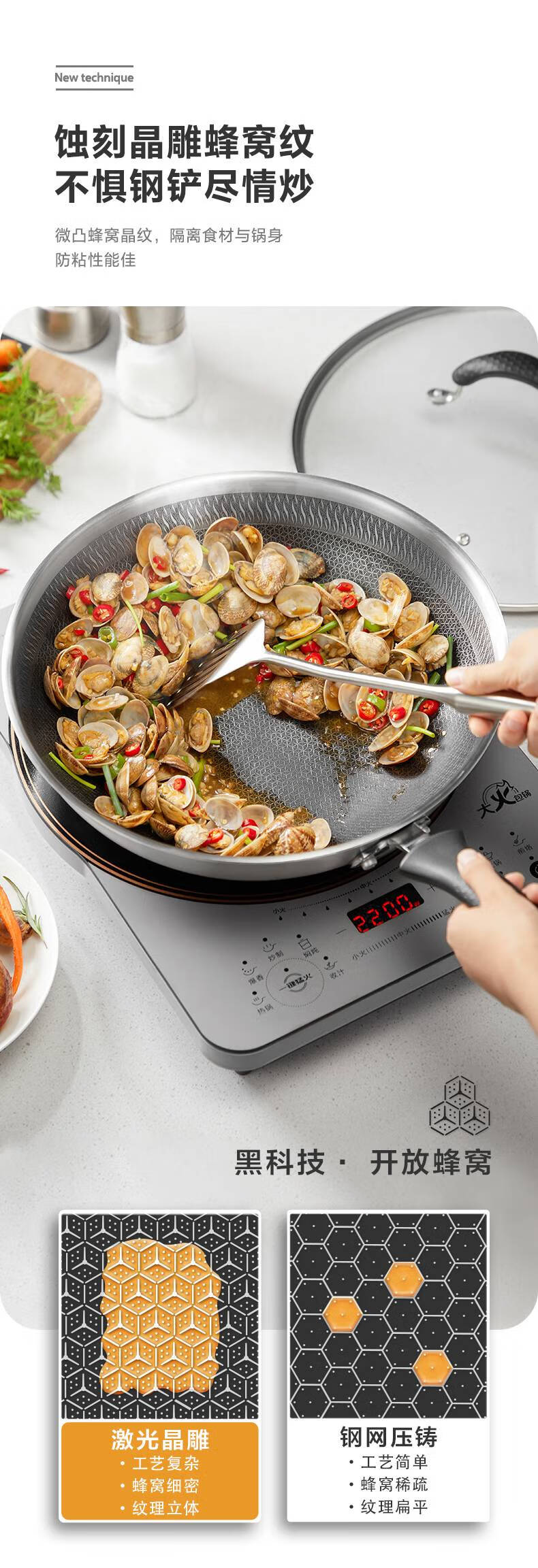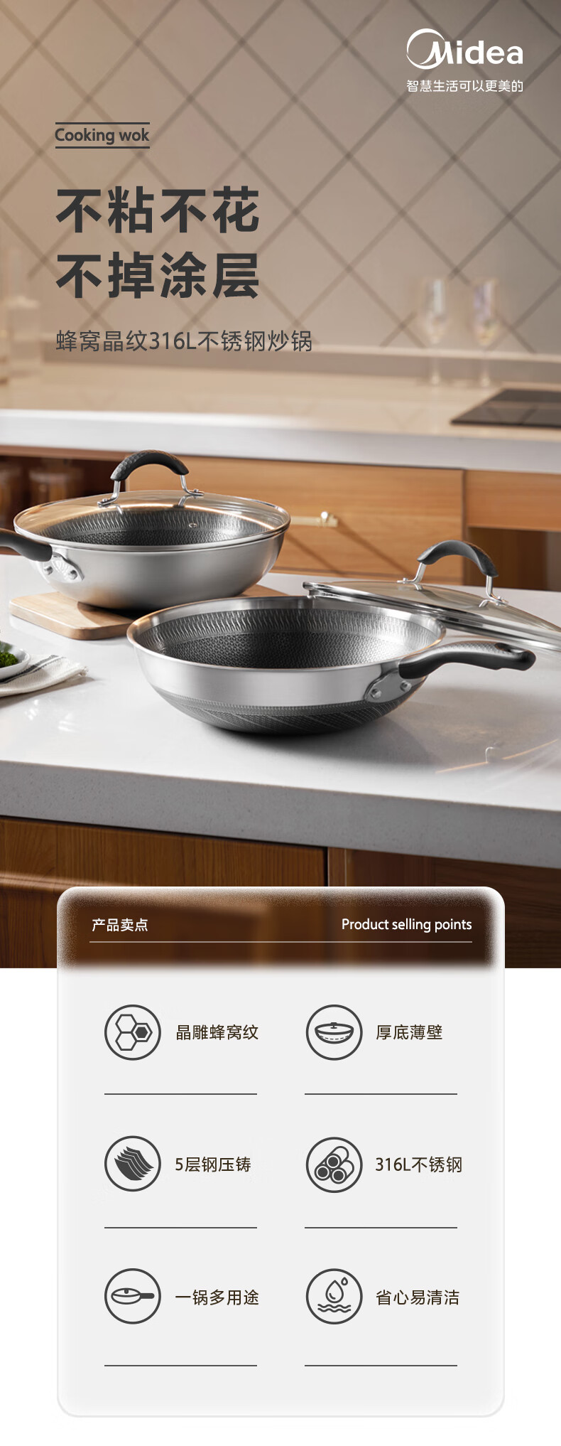 美的(Midea)炒锅不粘锅316L不锈钢32cm少油烟单面蜂窝平底煎炒锅CG32M01S