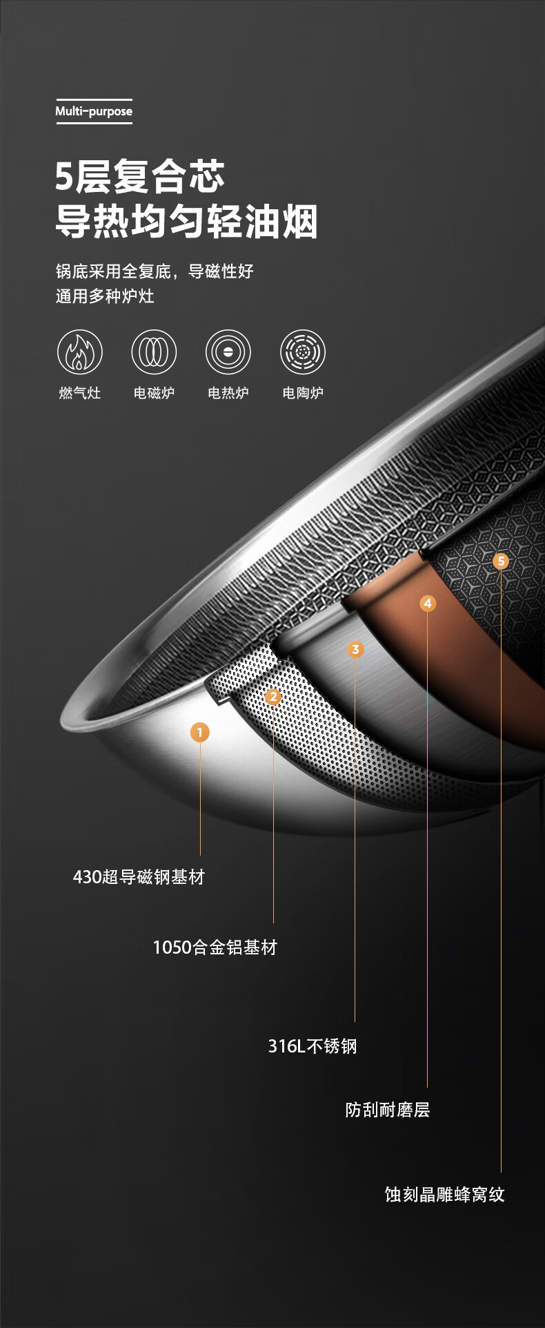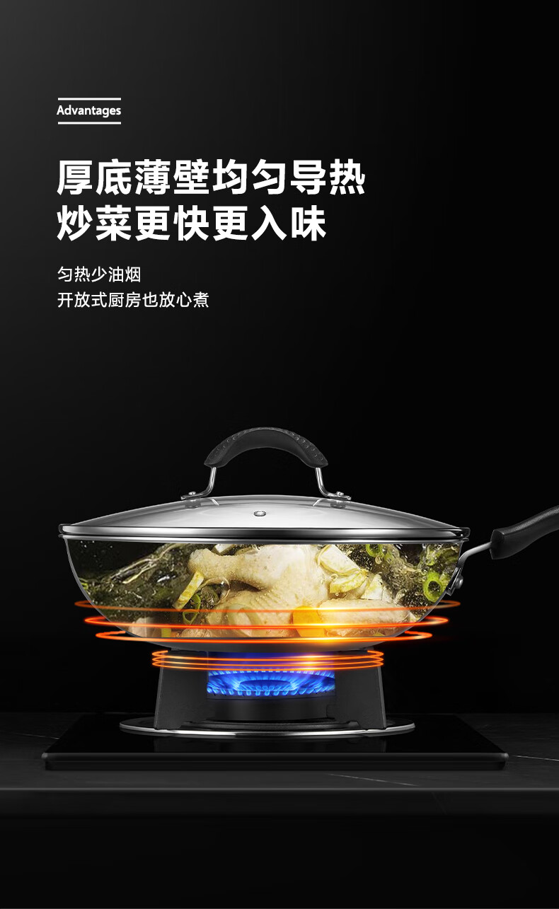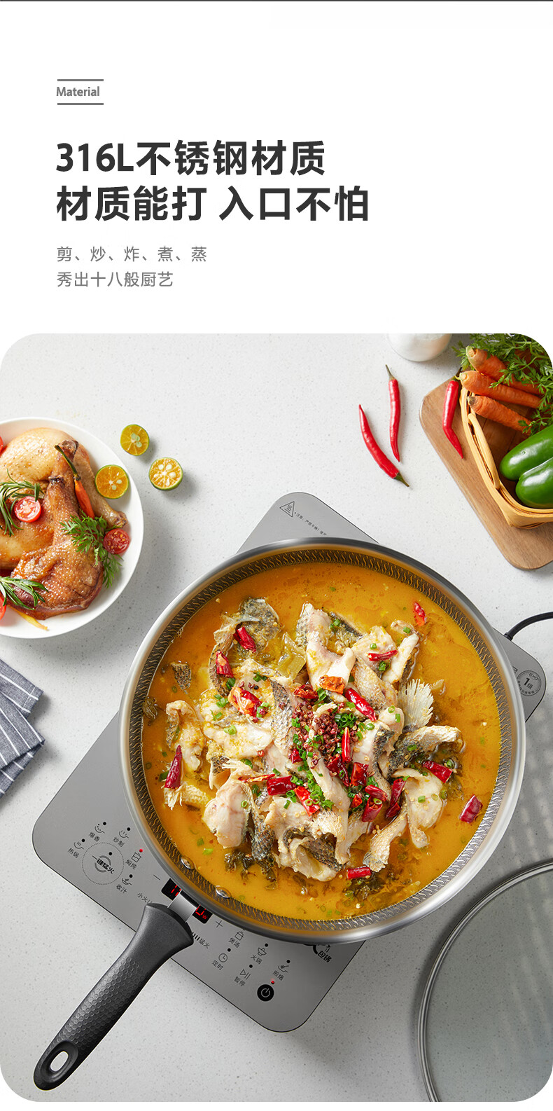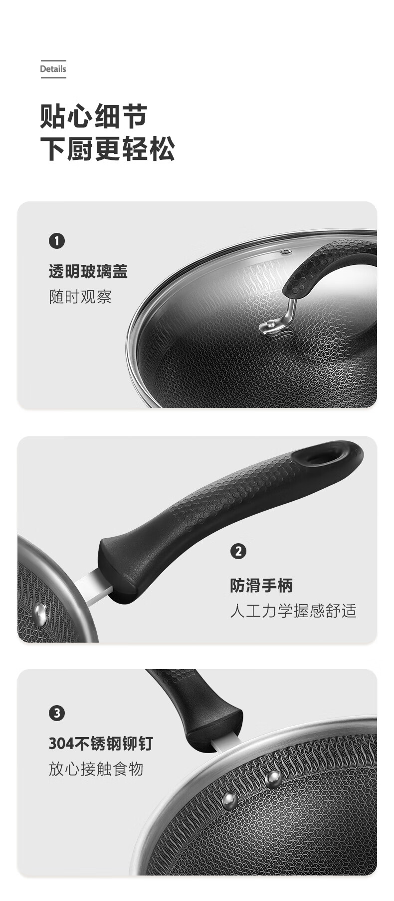 美的(Midea)炒锅不粘锅316L不锈钢32cm少油烟单面蜂窝平底煎炒锅CG32M01S