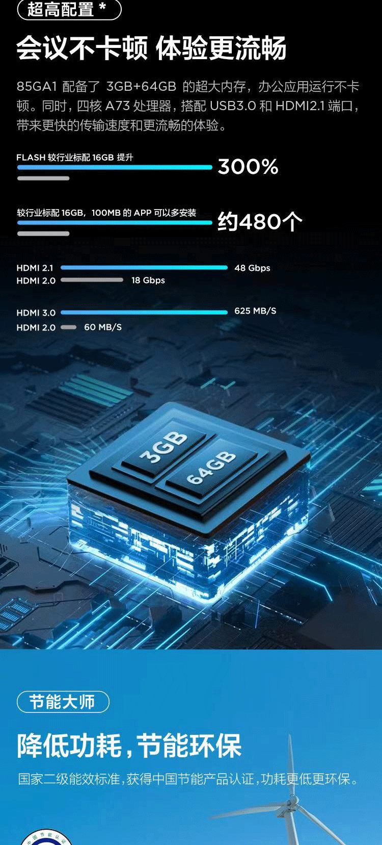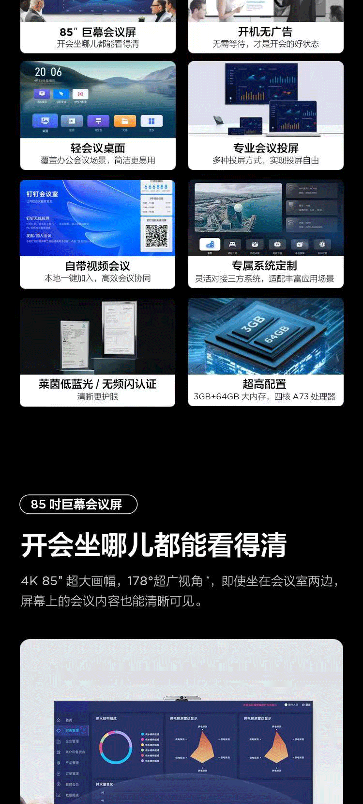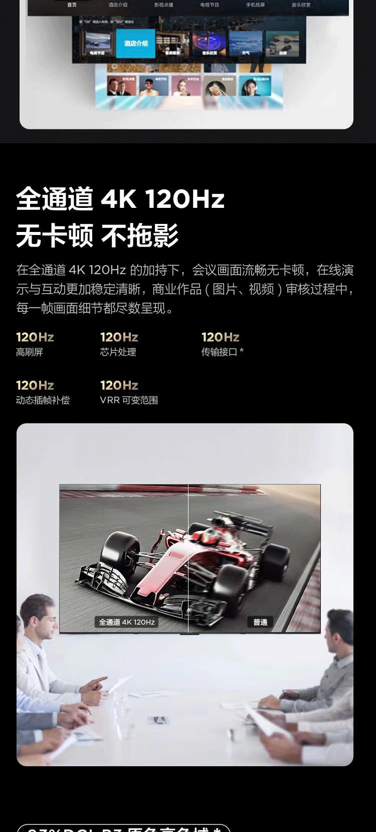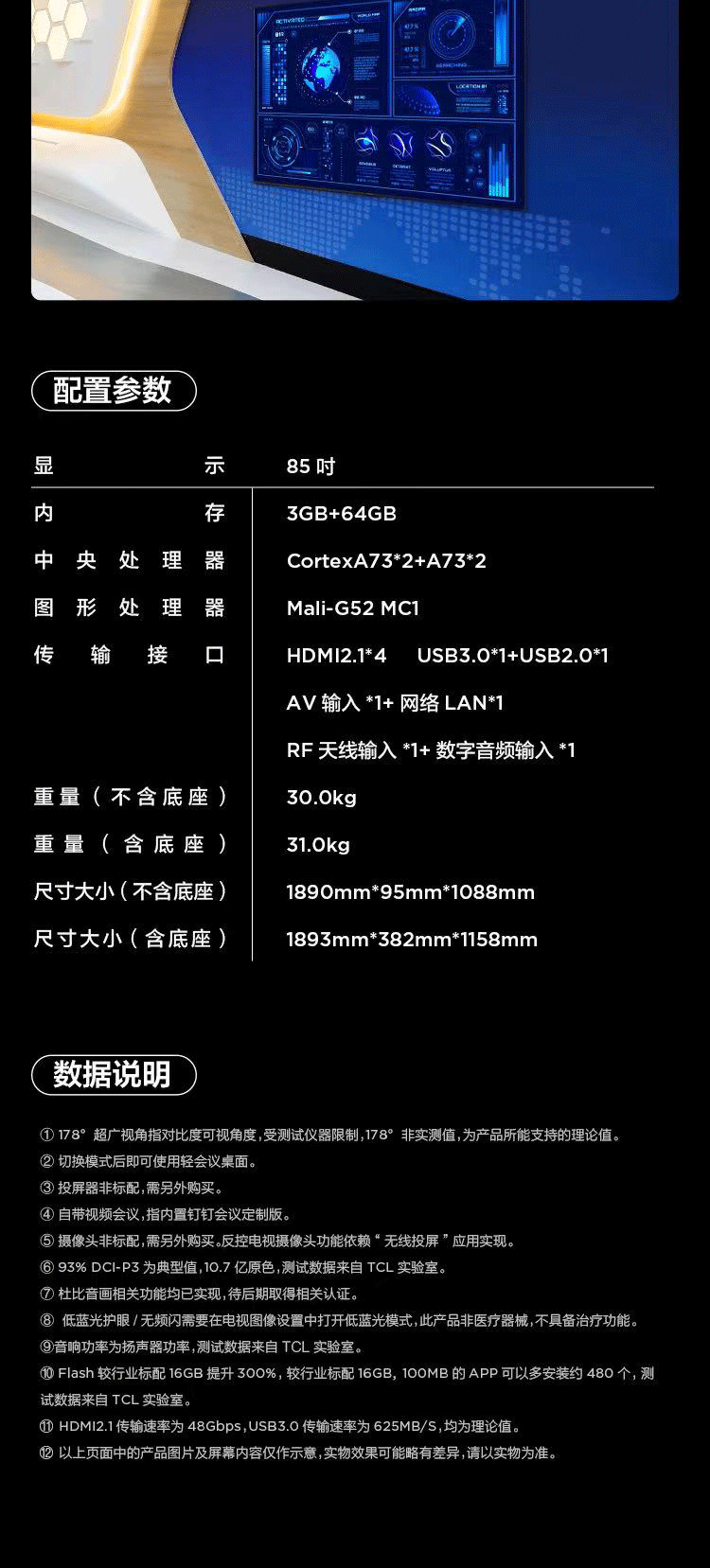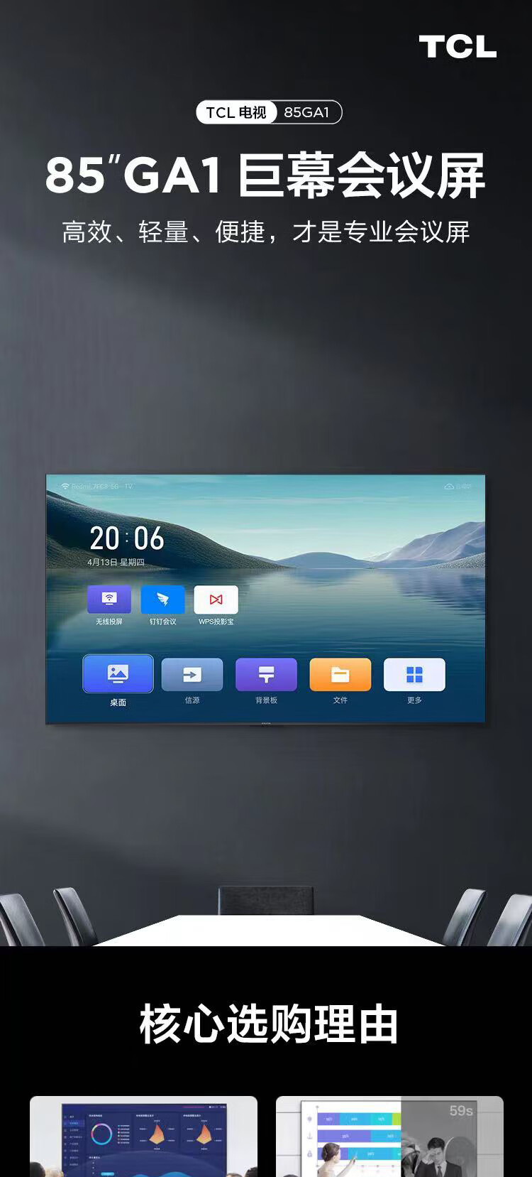 TCL 85GA1 85英寸 120Hz高刷巨幕莱茵护眼会议投屏专属系统定制 4K全面屏3+64G 双频WiFi家用商用电视