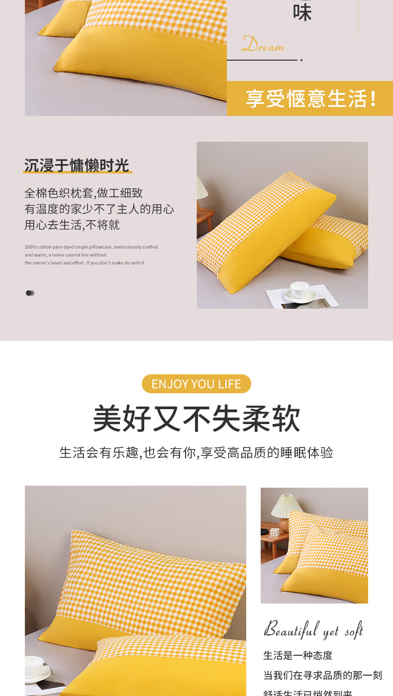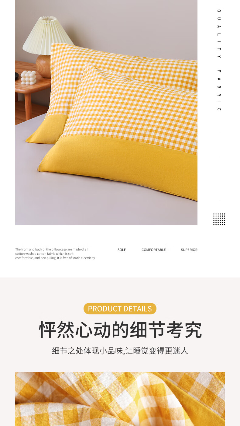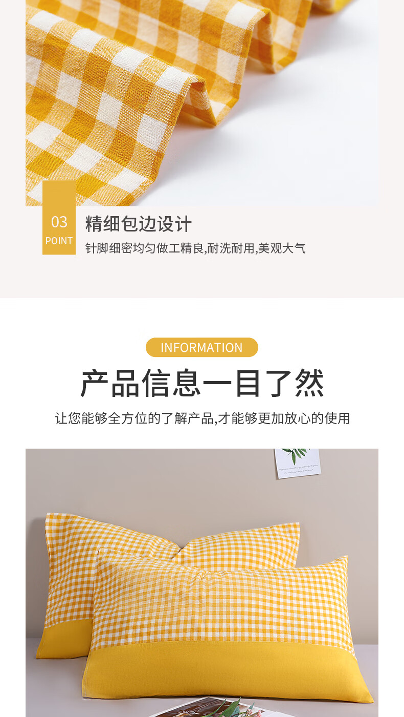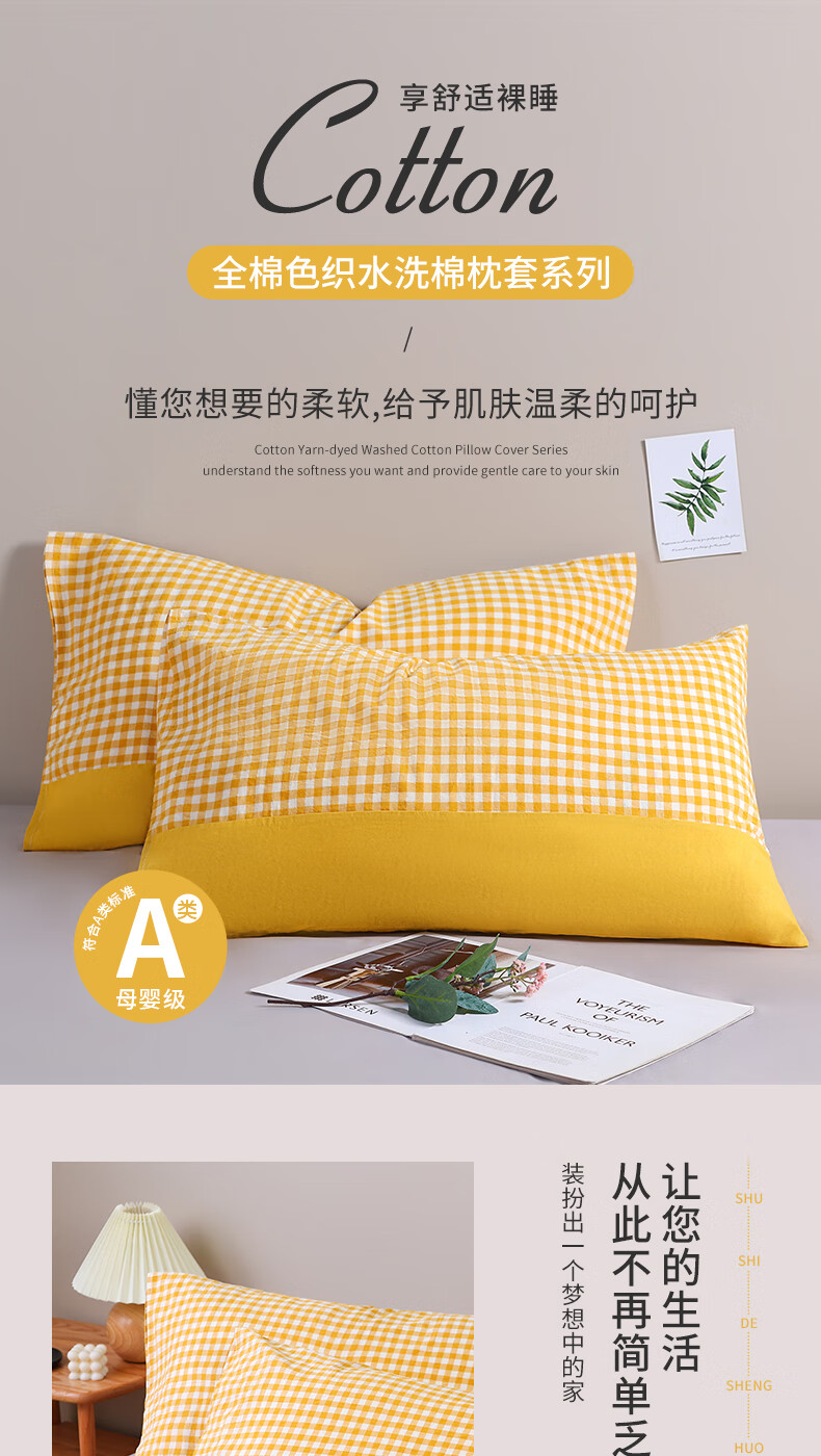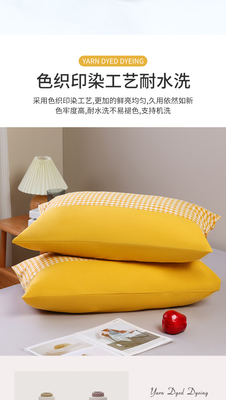 洁丽雅(Grace)全棉枕套一对装A类纯棉色织水洗棉枕头套宿舍枕芯套48*74cm 蕉黄