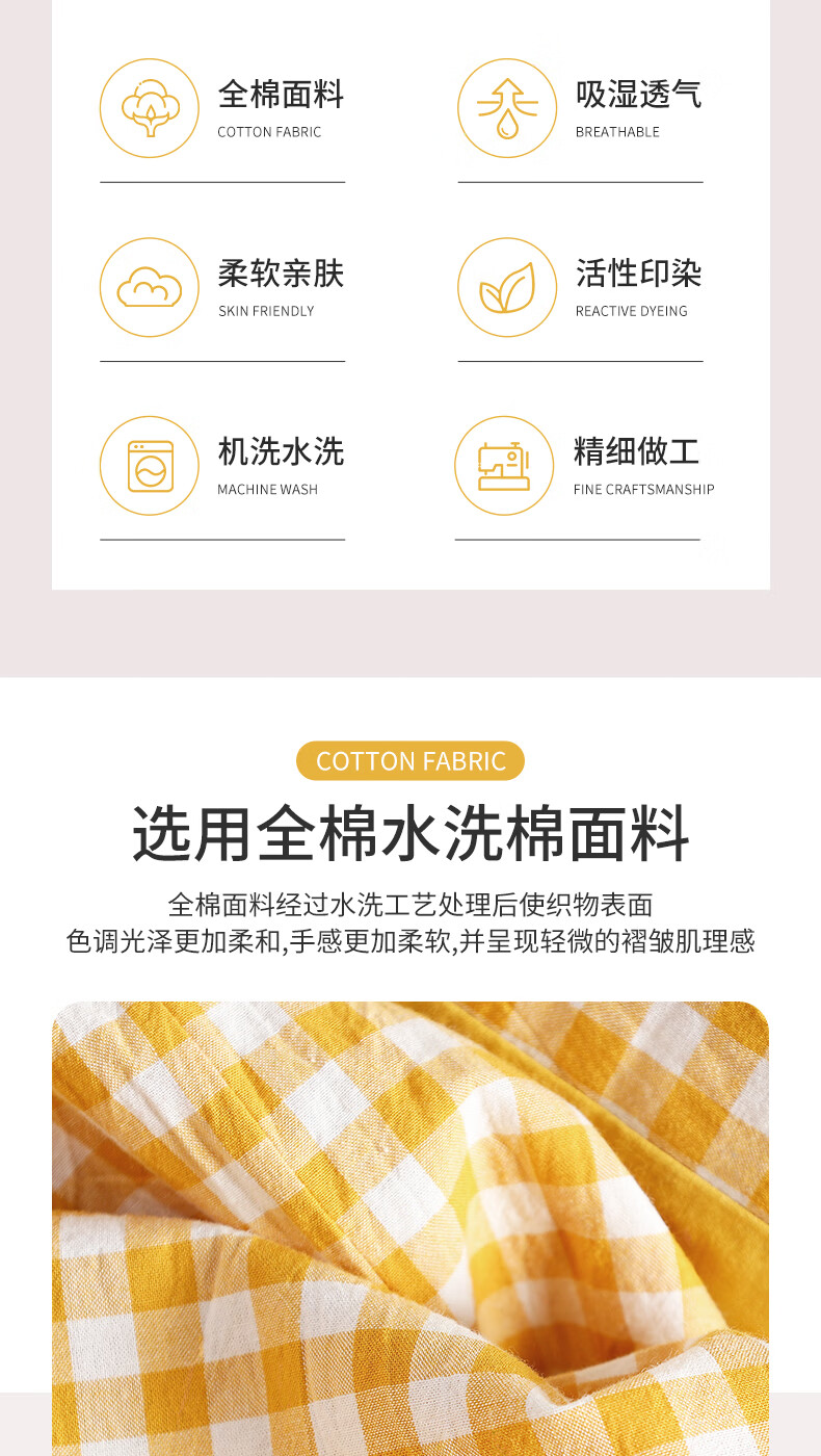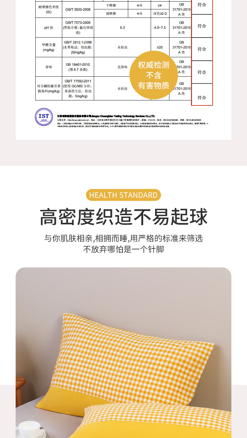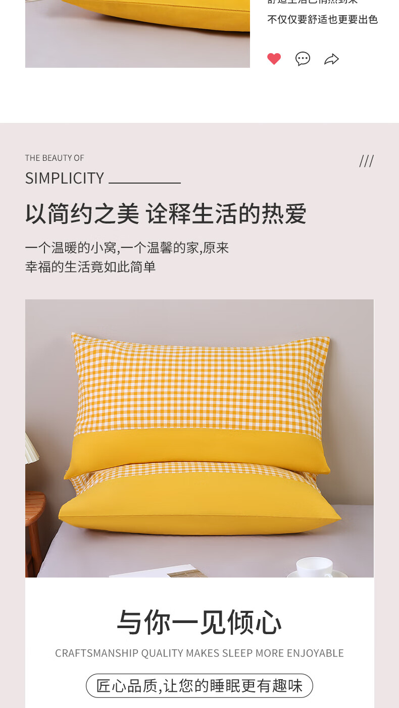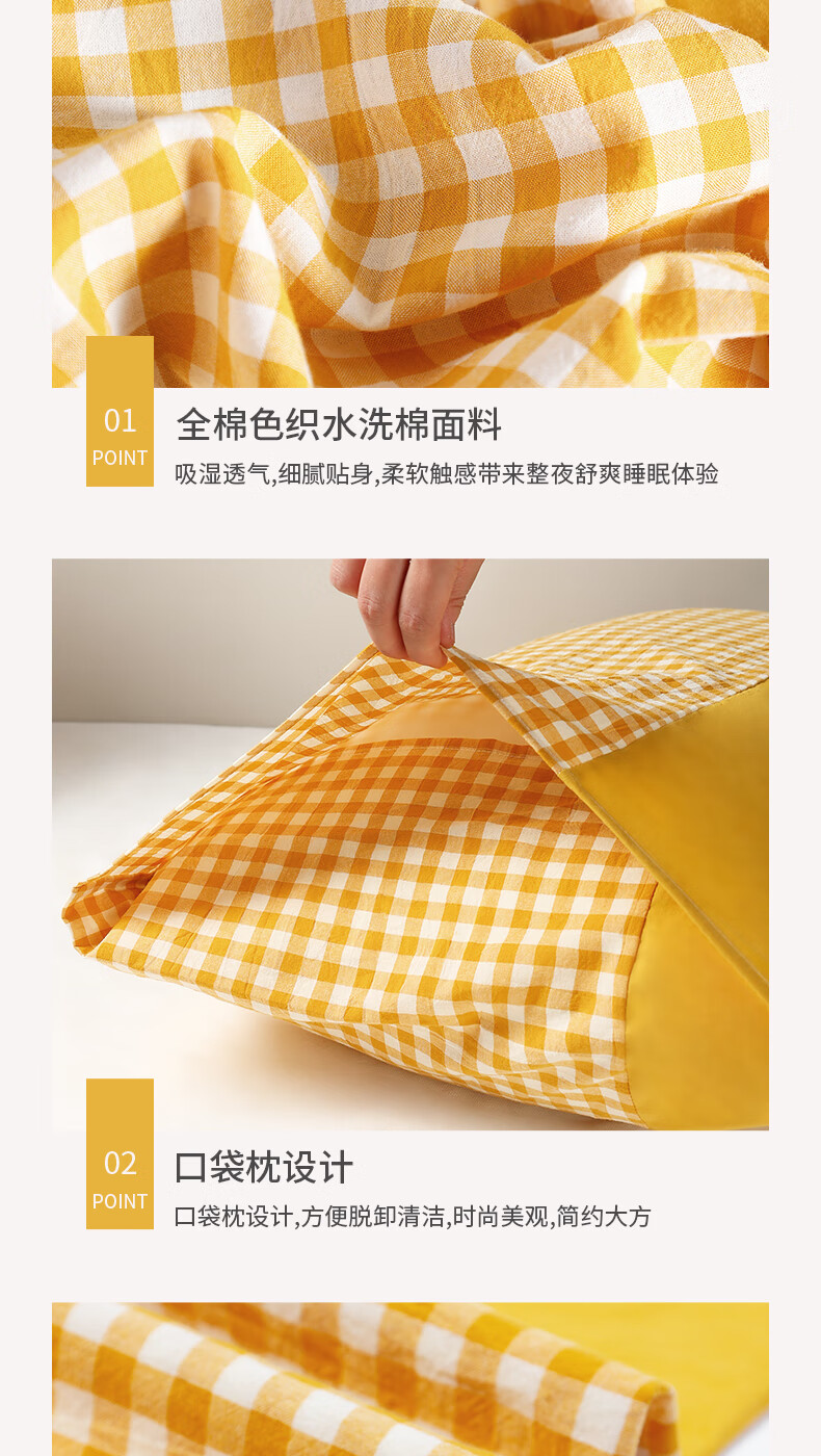 洁丽雅(Grace)全棉枕套一对装A类纯棉色织水洗棉枕头套宿舍枕芯套48*74cm 蕉黄