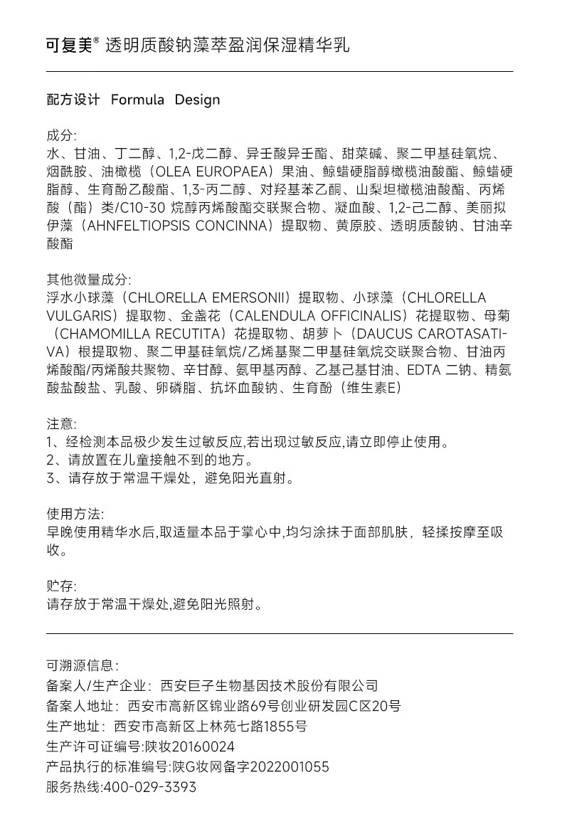 可复美透明质酸钠藻萃盈润保湿精华乳80ml/瓶/盒 改善皮肤无光 深层沁润 长效保湿 可复美吨吨乳