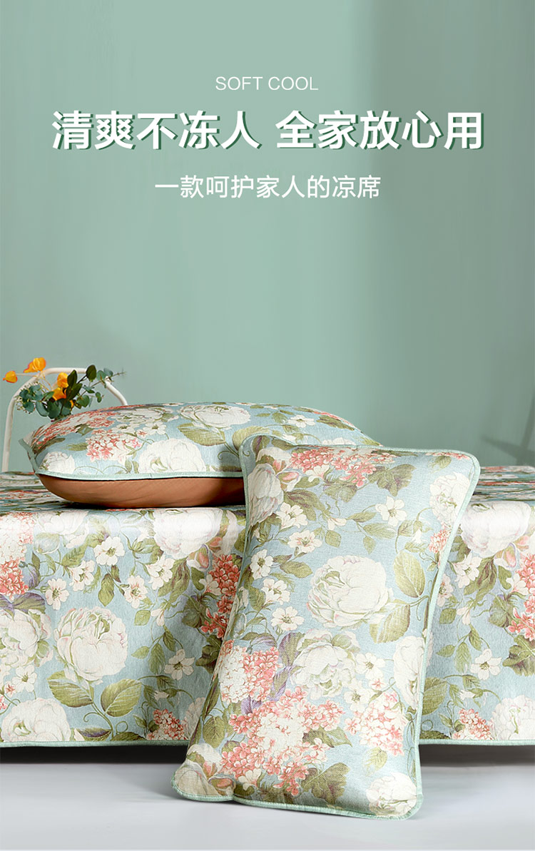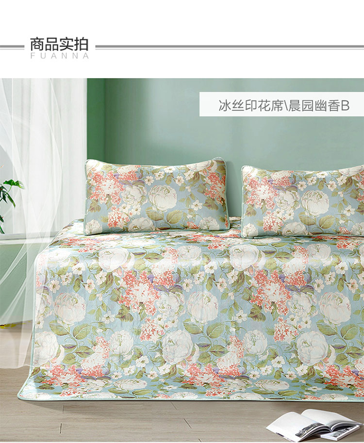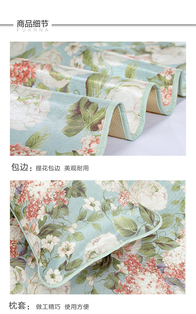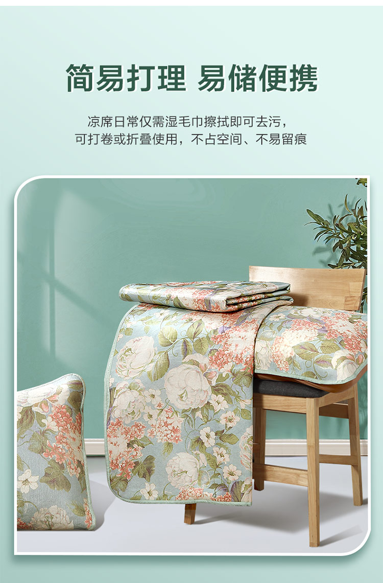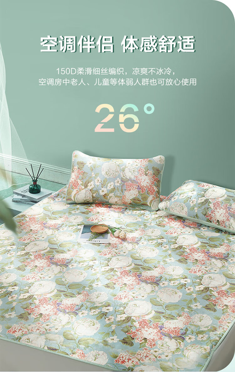 富安娜家纺凉席冰丝席子空调席三件套夏季双人防滑绑带印花席1米8床