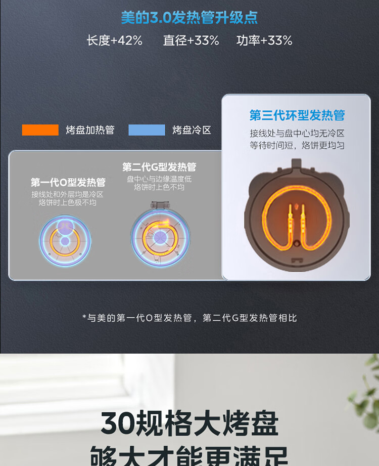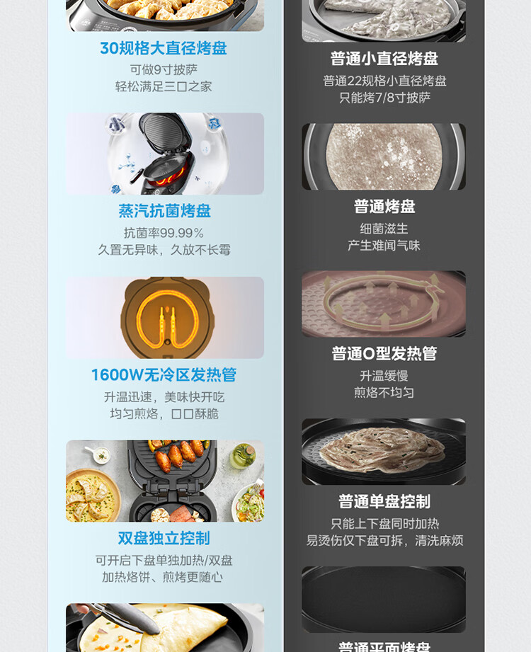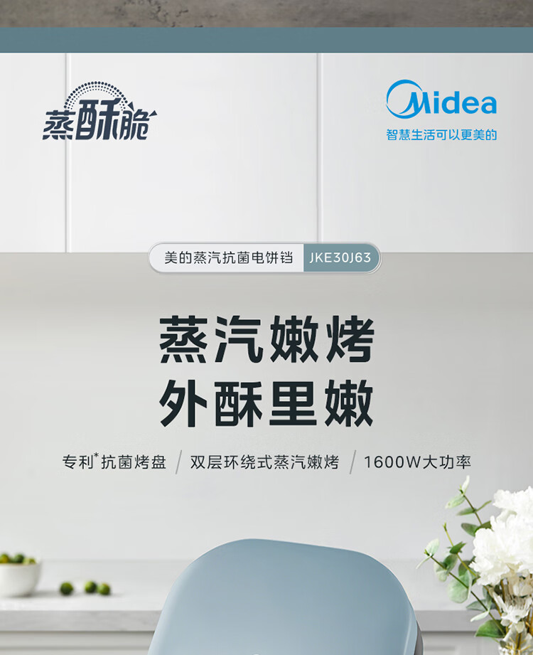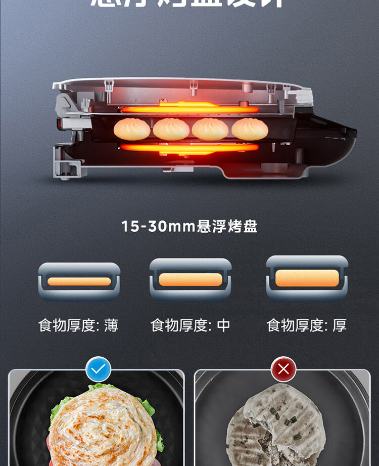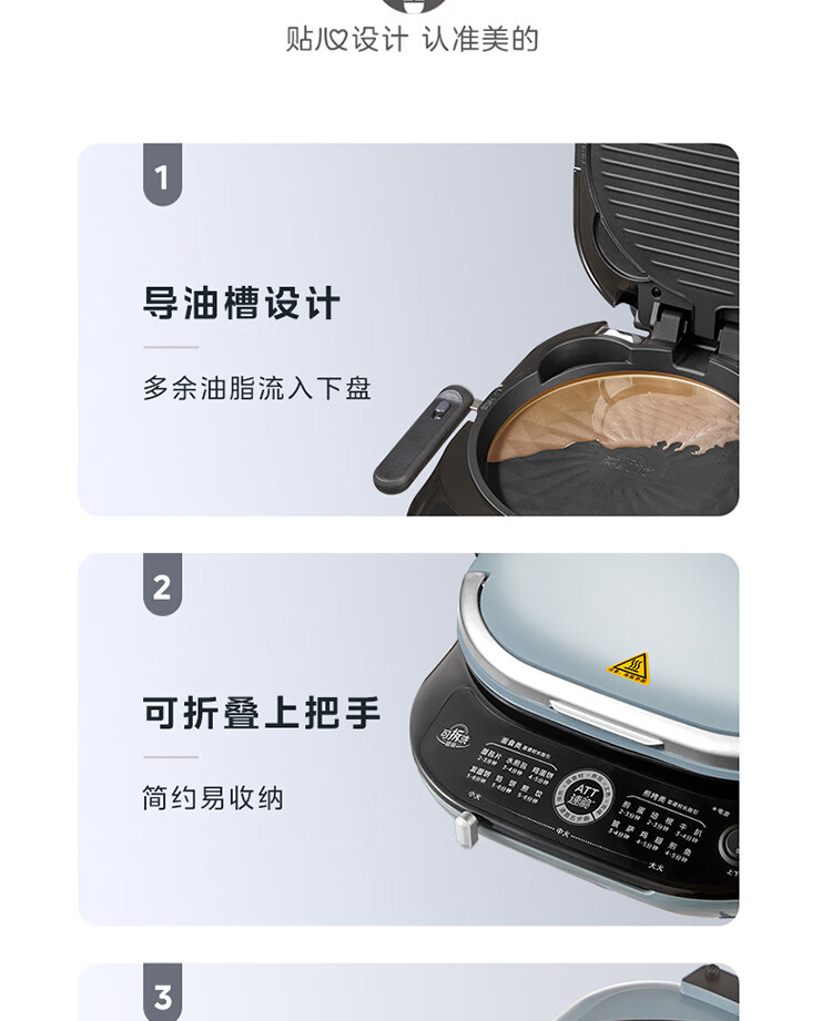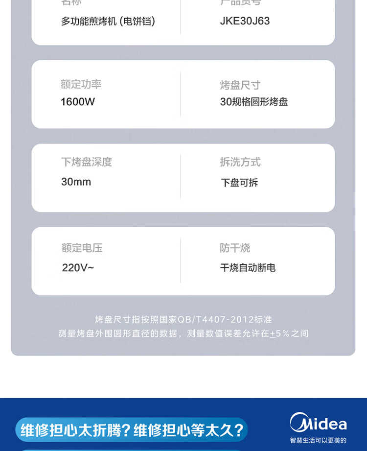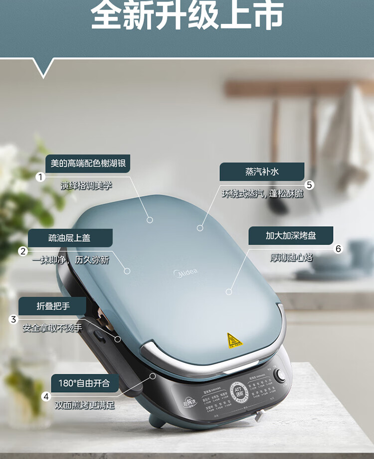 美的(Midea)电饼铛家用双面加热可拆洗煎饼铛煎烤机烙饼锅早餐机30mm加深烤盘滑控火力JKE30J63