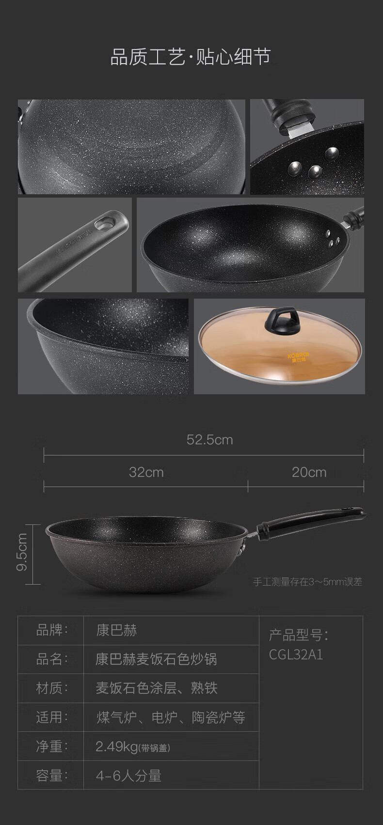 康巴赫炒锅麦饭石色炒锅煎炒两用家用不粘锅煎锅不挑炉具CGL32A1