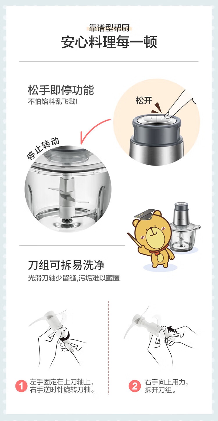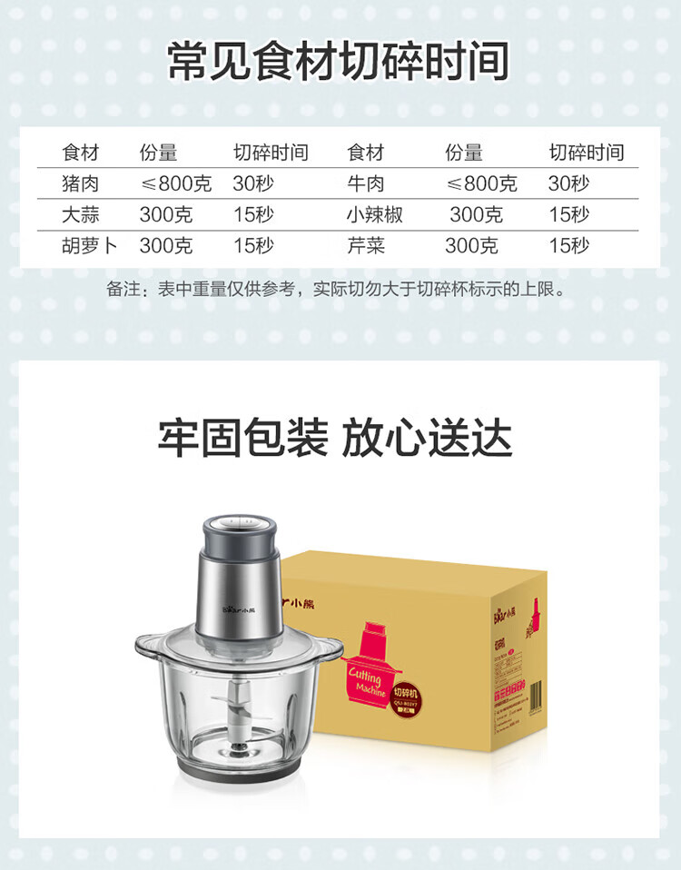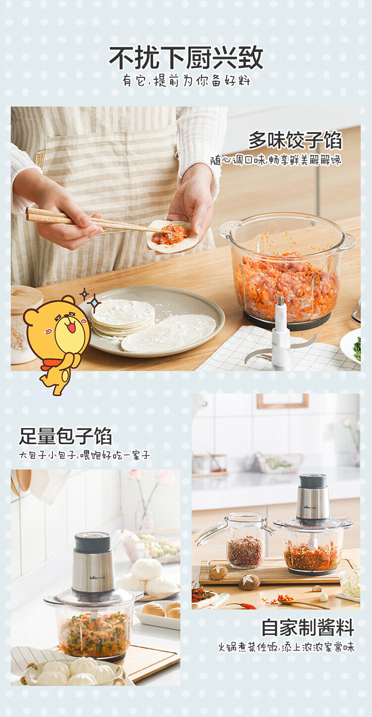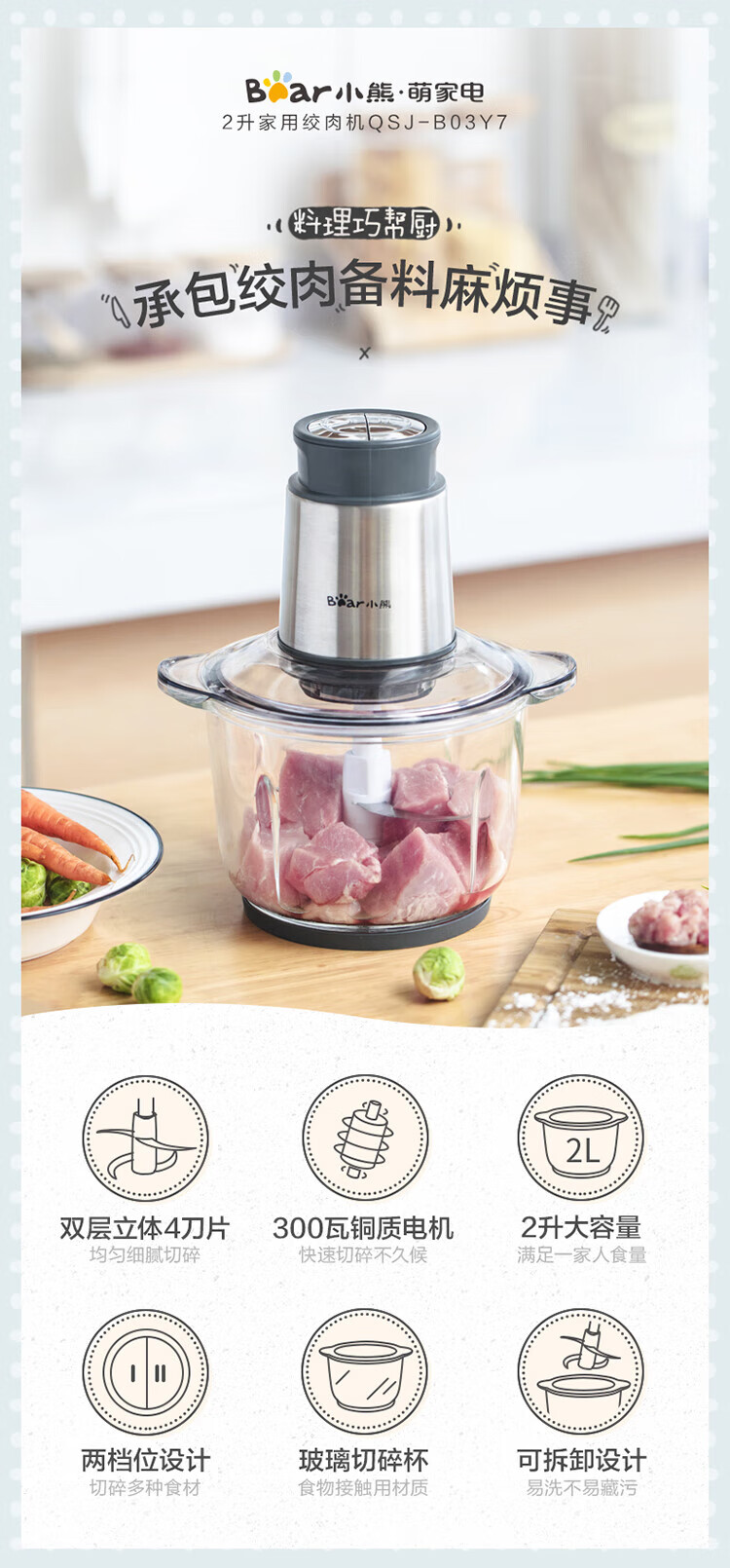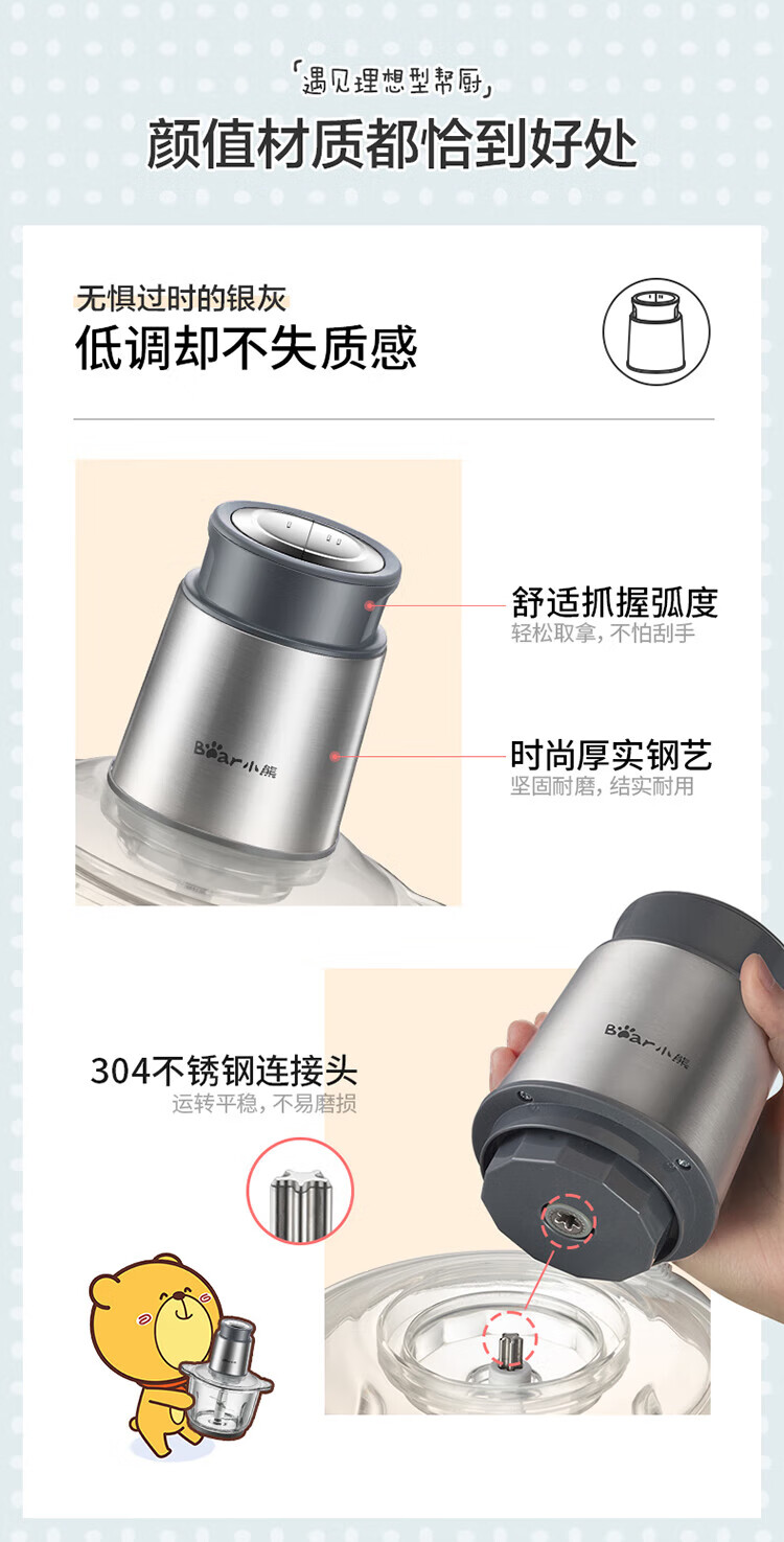 小熊(Bear) 家用电动不锈钢搅拌机绞馅机切碎肉机辅食料理机绞菜打蒜机QSJ-B03Y7 灰色
