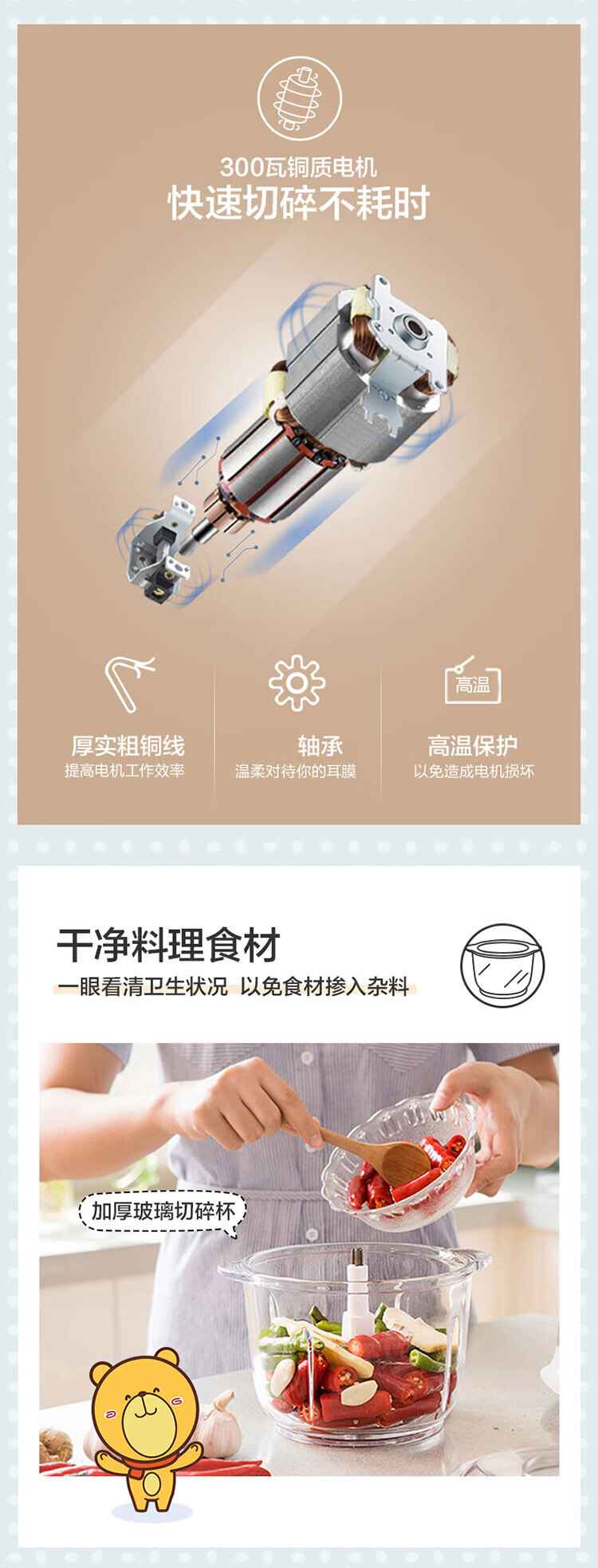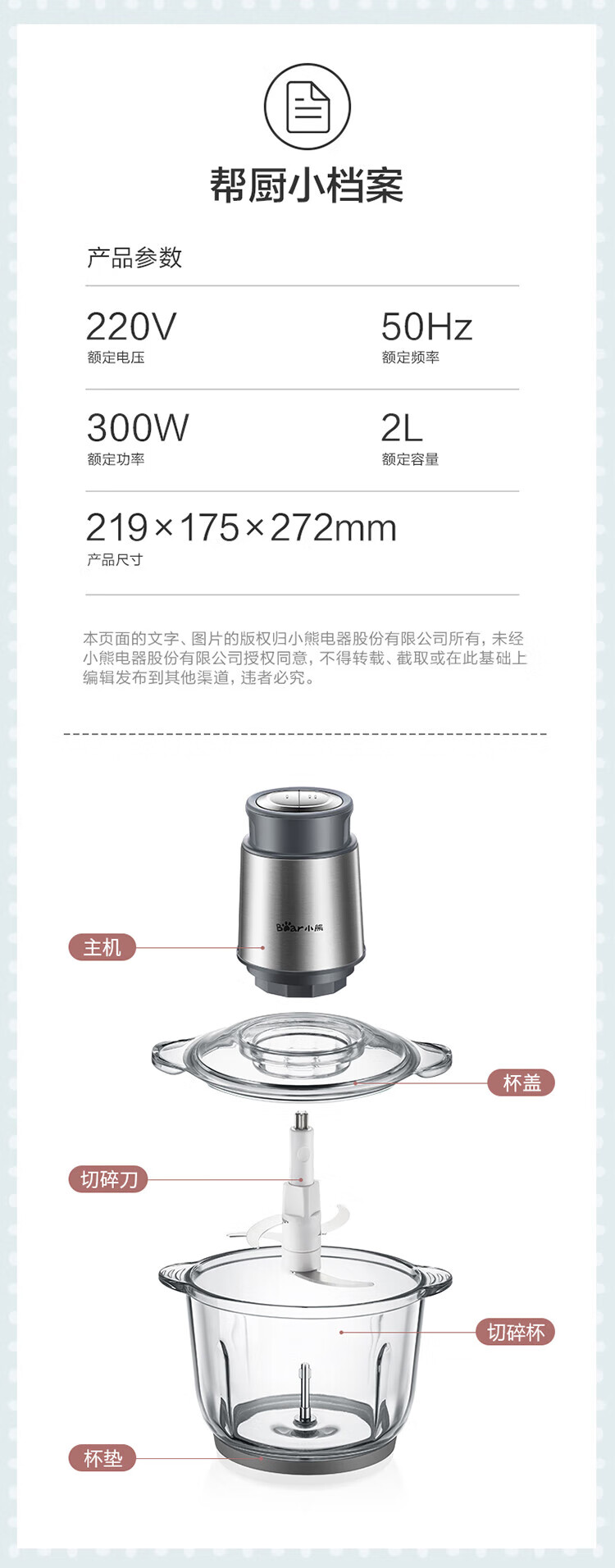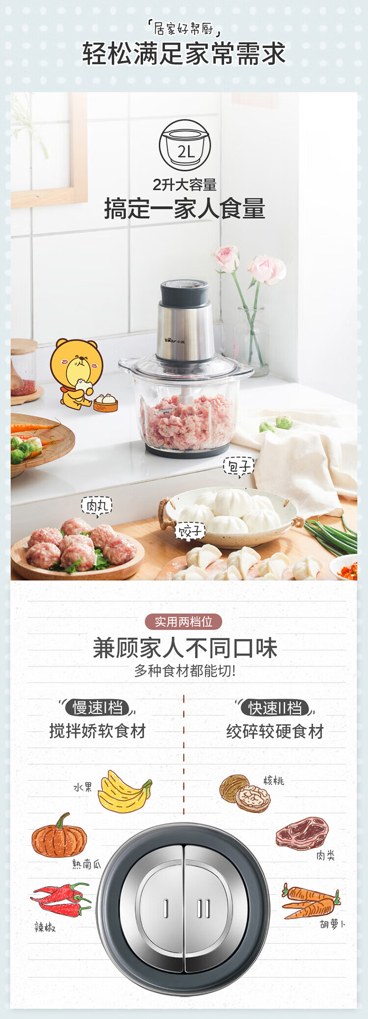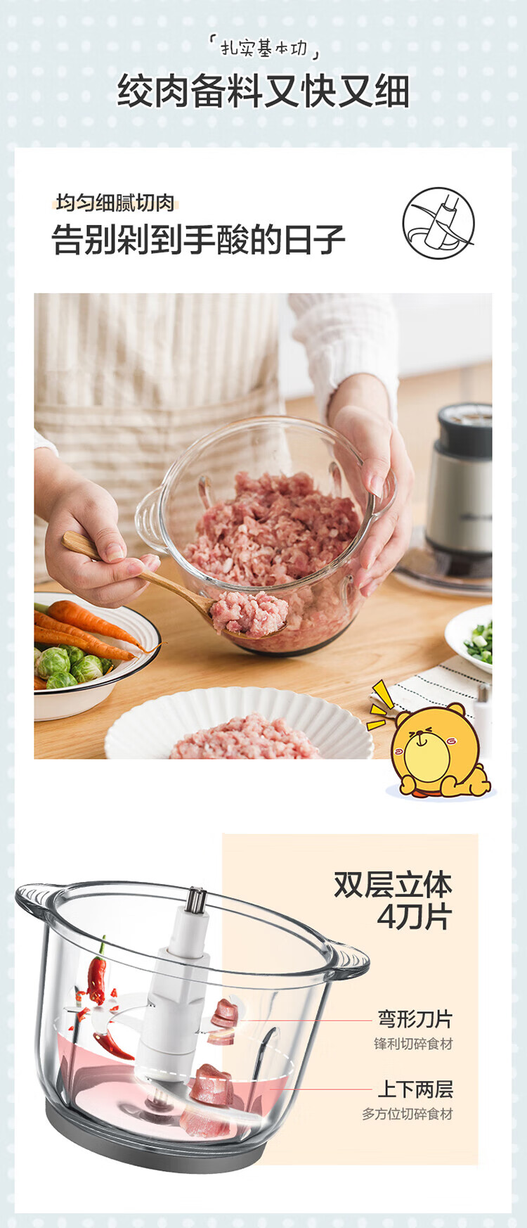 小熊(Bear) 家用电动不锈钢搅拌机绞馅机切碎肉机辅食料理机绞菜打蒜机QSJ-B03Y7 灰色