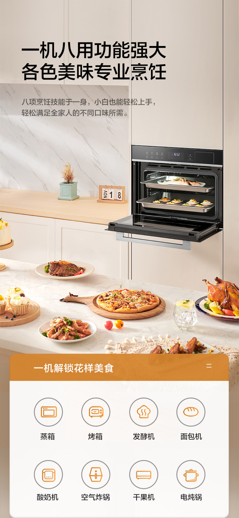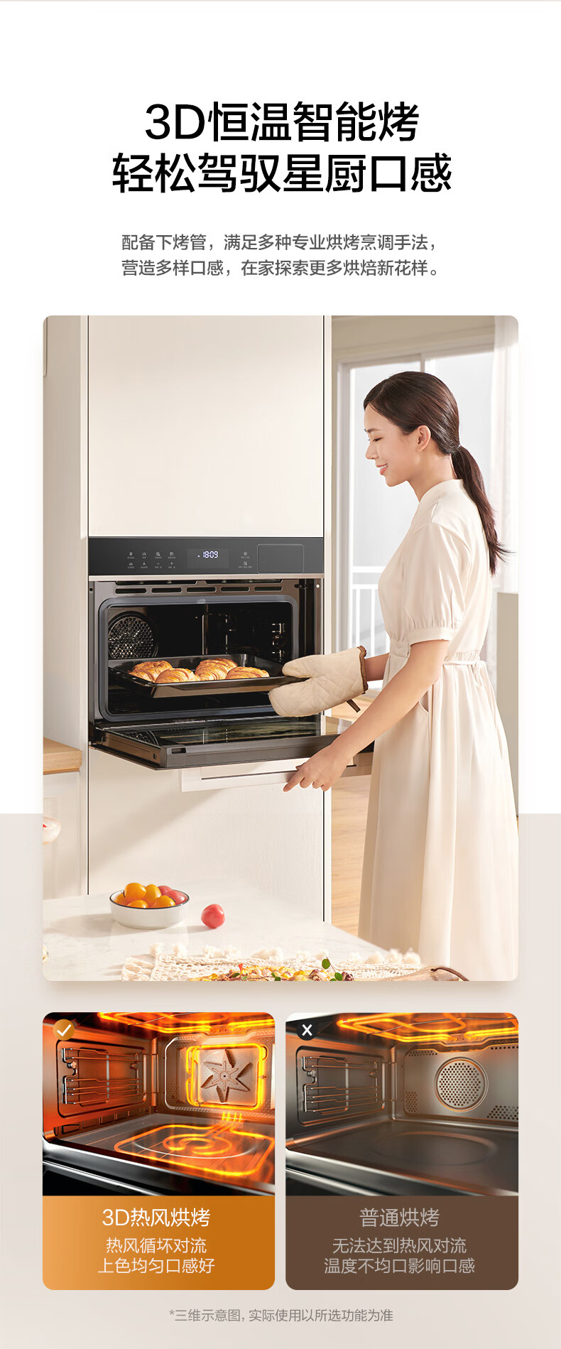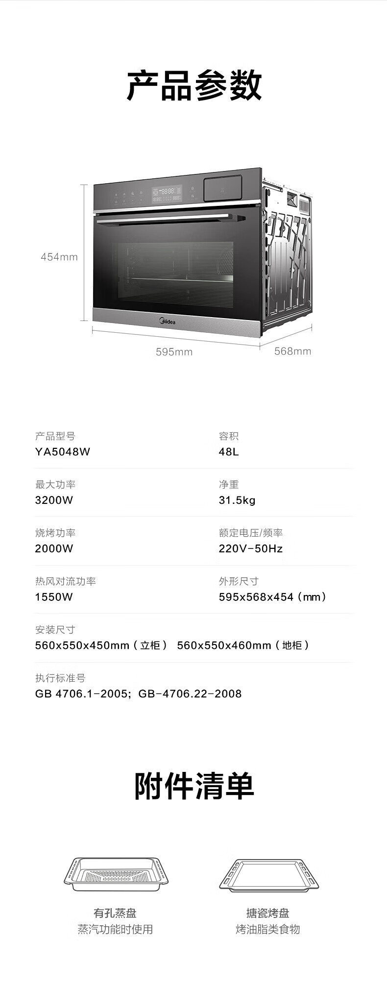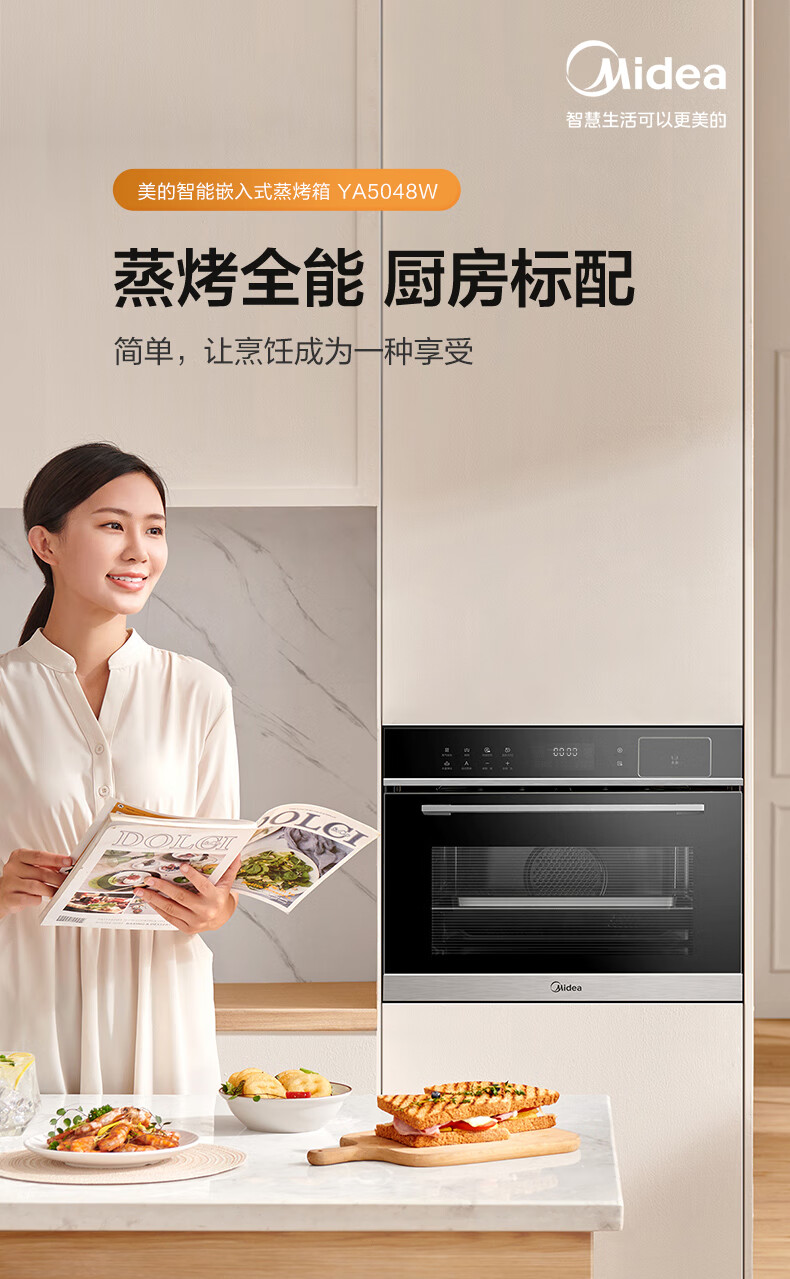 美的(Midea)嵌入式蒸烤箱一体机YA5048W(A50) 家用50L大容量多功能蒸箱烤箱二合一 搪瓷内胆 京东小家APP操控