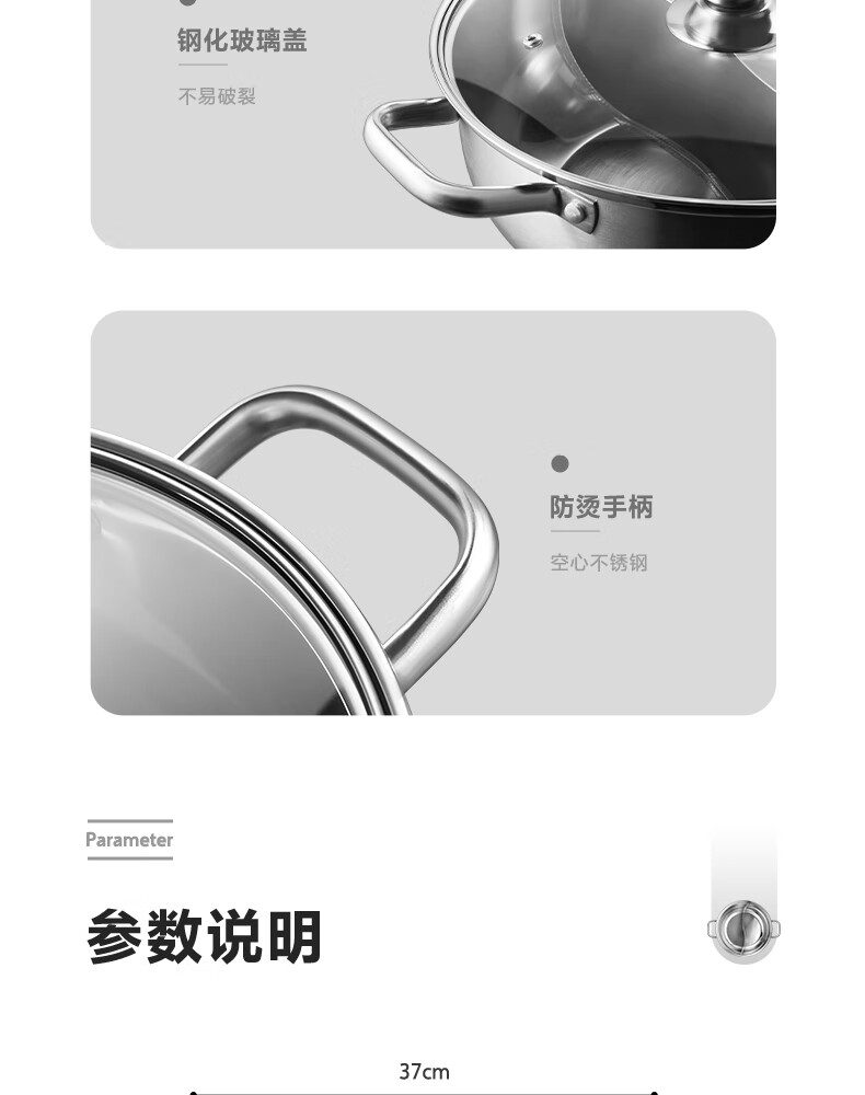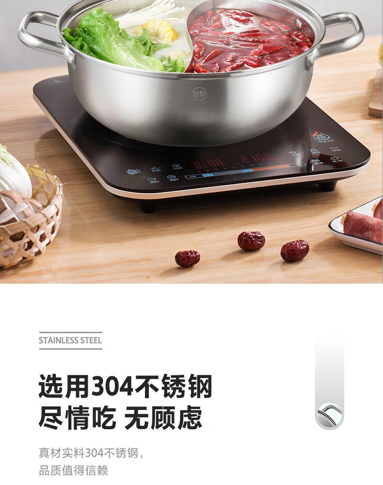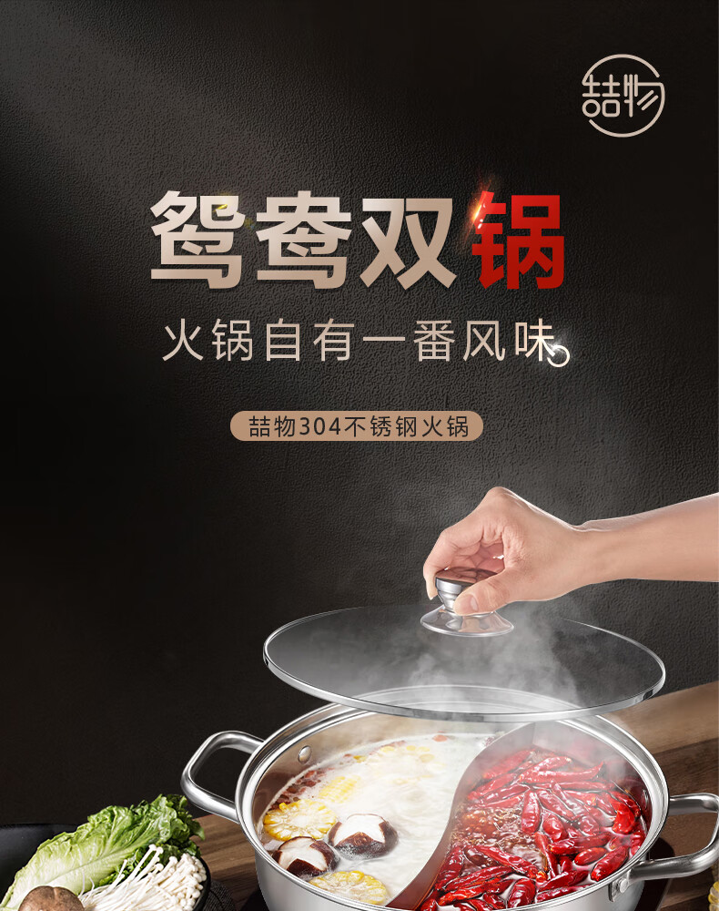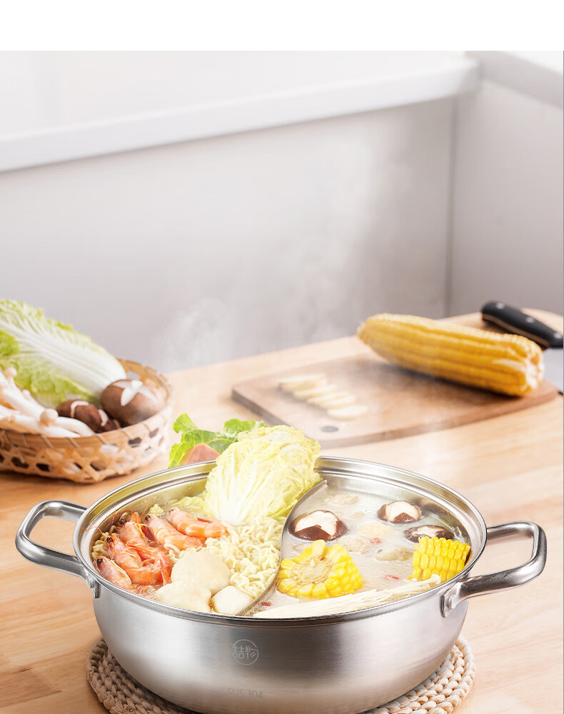 美的(Midea)火锅304不锈钢鸳鸯锅30CM火锅盆汤锅加厚锅具电磁炉通用TG30Z09Y