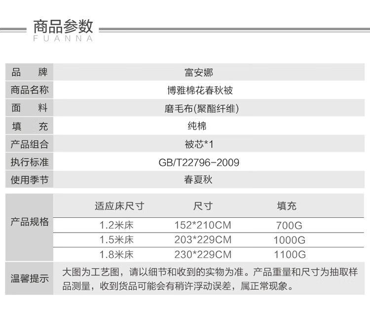 富安娜家纺被芯 春秋棉花被空调被升级单双人盖被1.5米床(203*229cm)