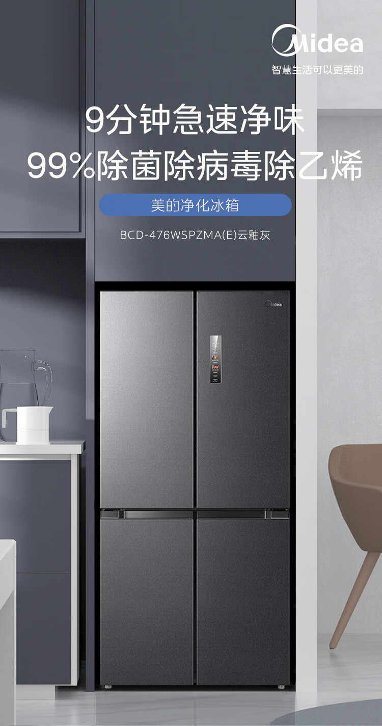 美的(Midea)476升十字对开门冰箱变频一级能效家用家用电冰箱超薄风冷无霜BCD-476WSPZMA(E)云釉灰