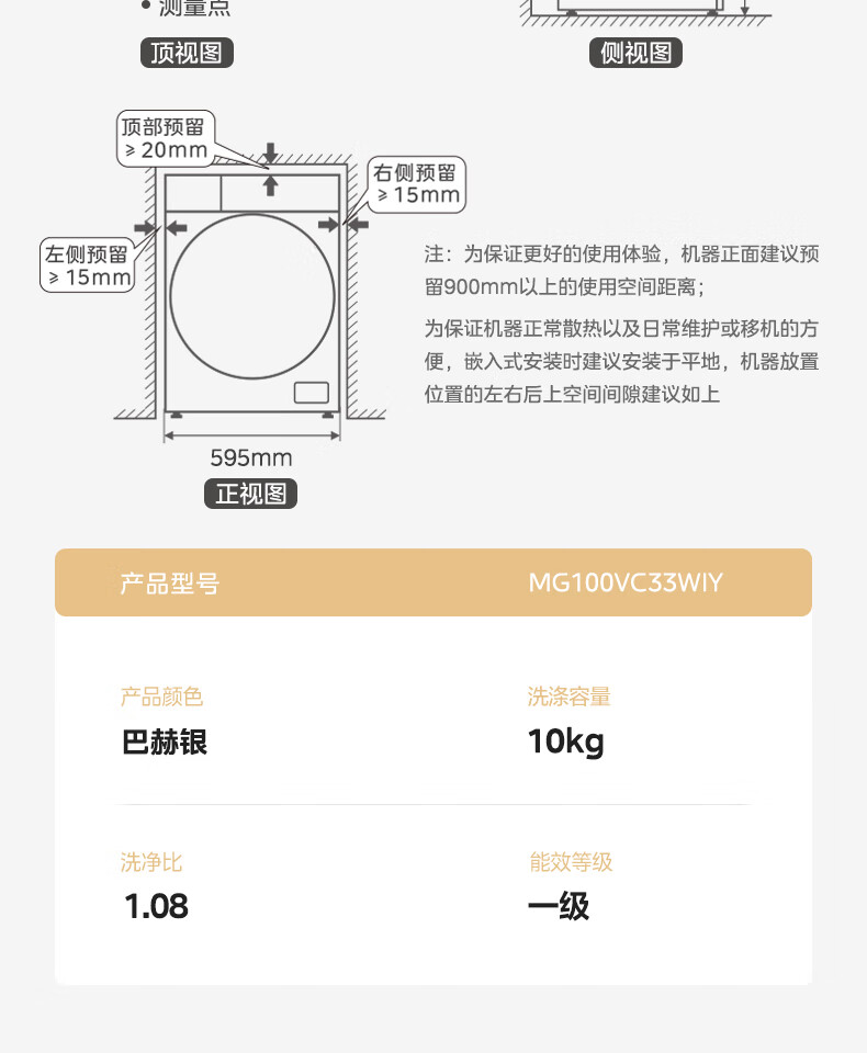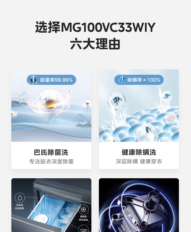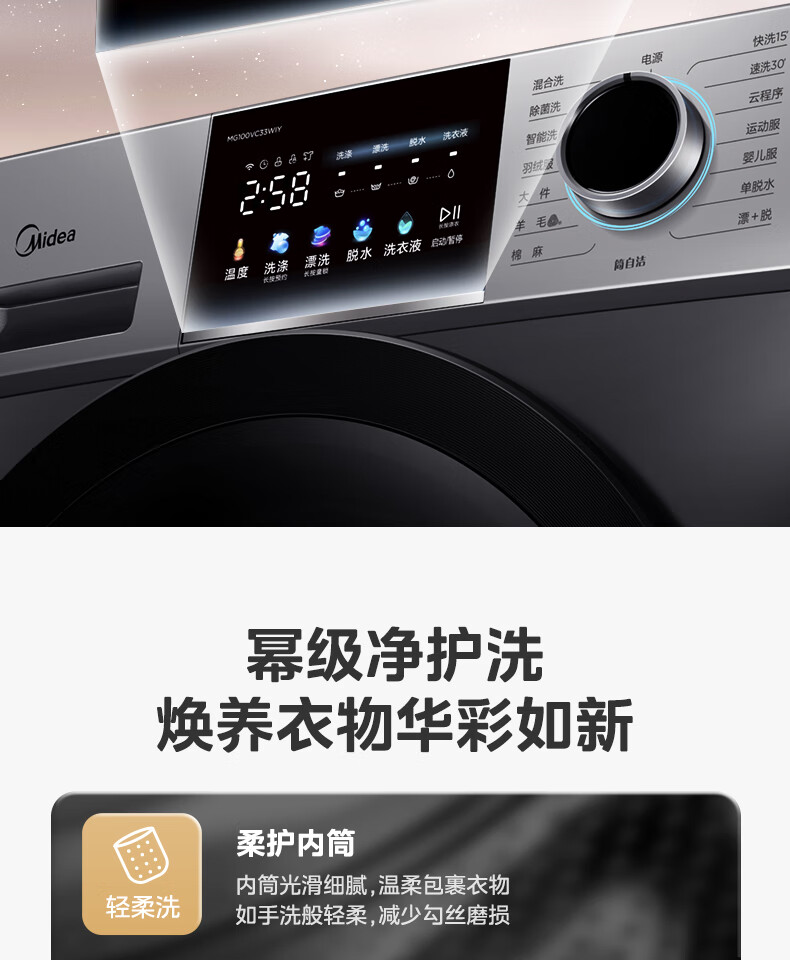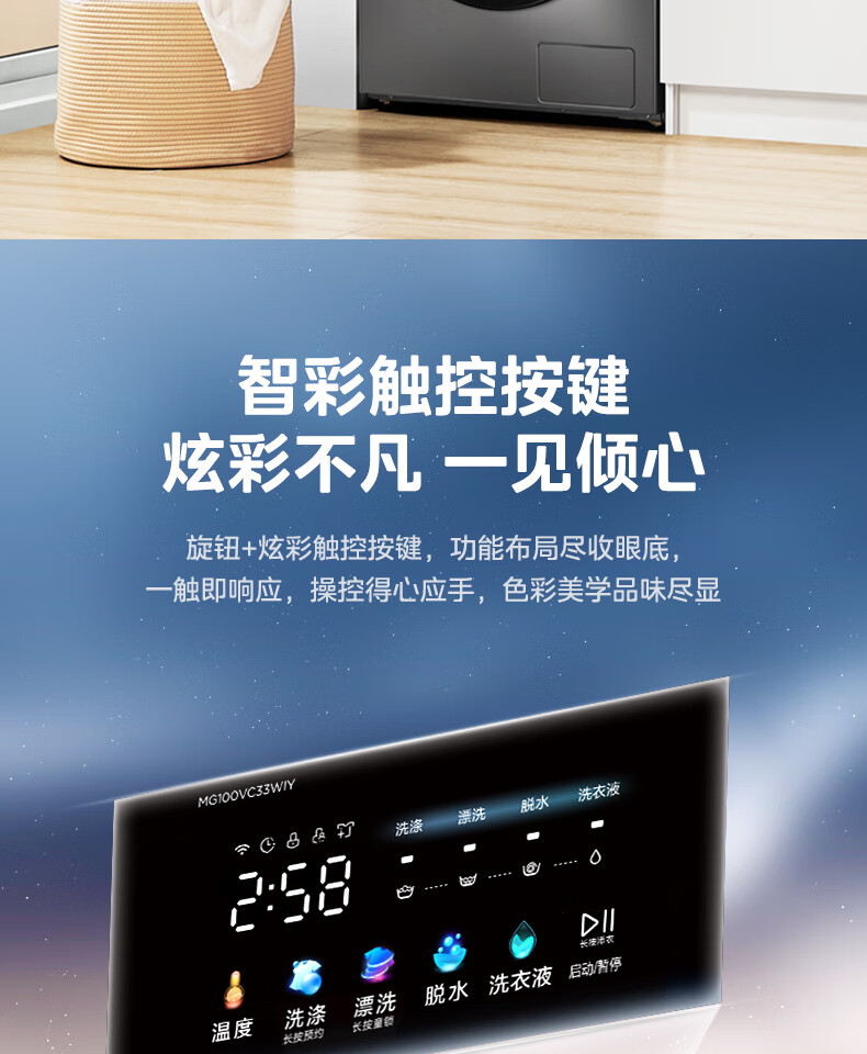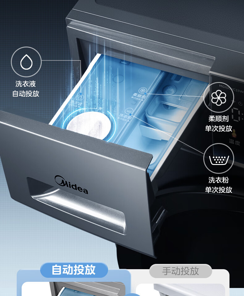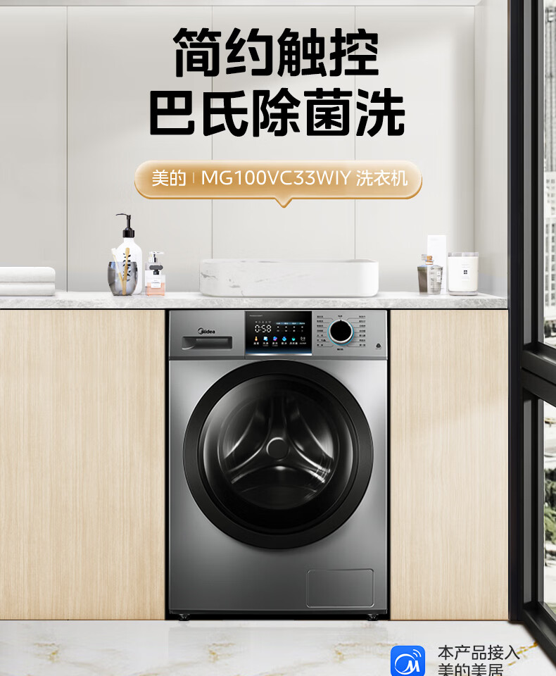 美的(Midea)滚筒洗衣机全自动 VC33 炫彩 智能投放 除螨除菌洗 高温筒自洁 简尚系列 10公斤 MG100VC33WIY