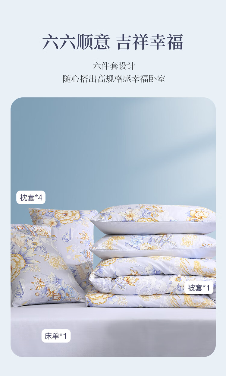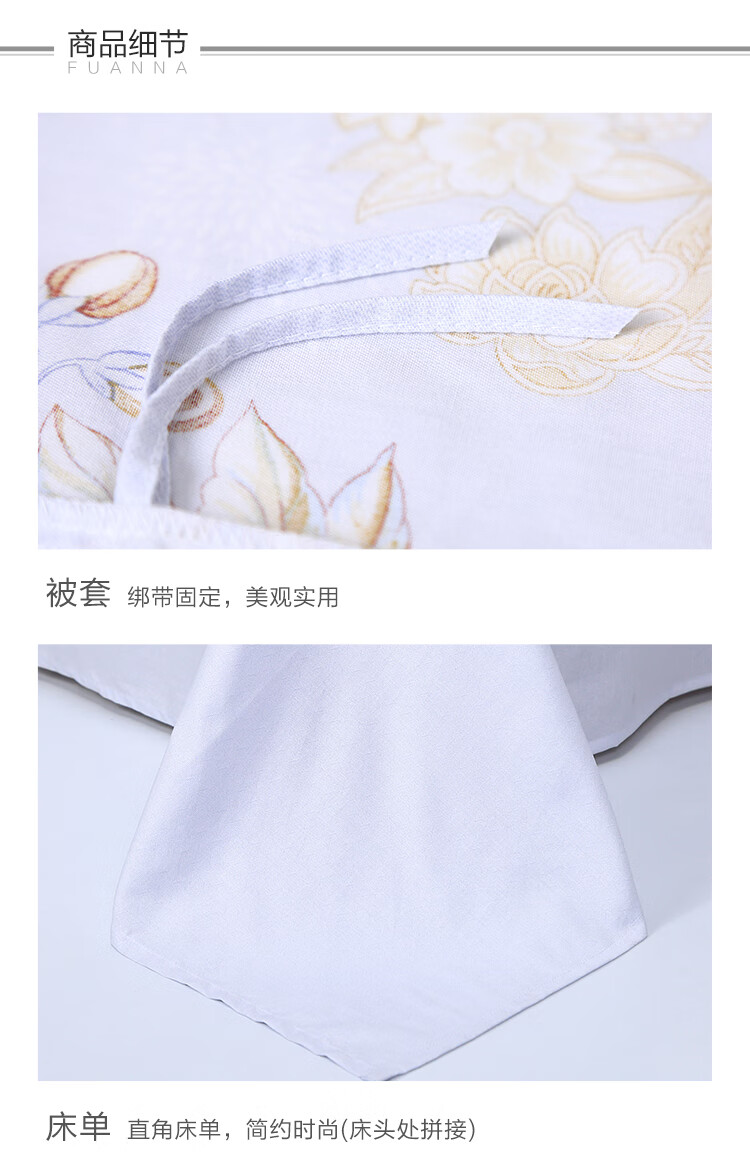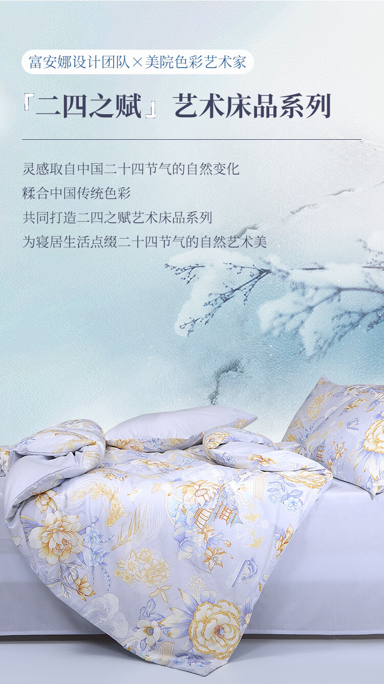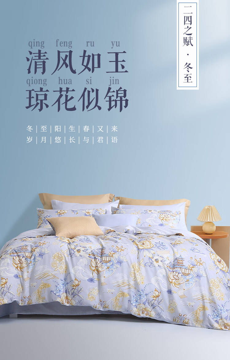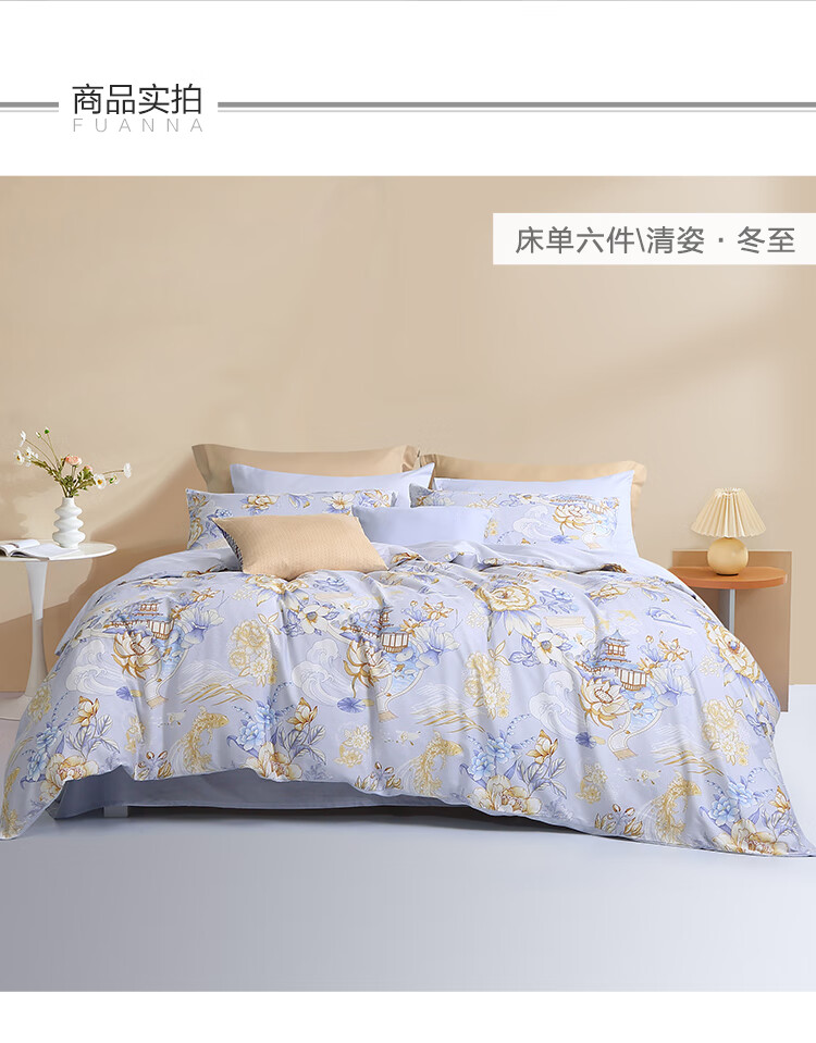 富安娜家纺床上六件套纯棉 100%全棉印花床单被套 单人学生宿舍套件 清姿·冬至 0.9米1.2米床(152*210cm)