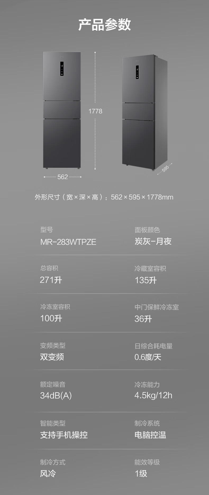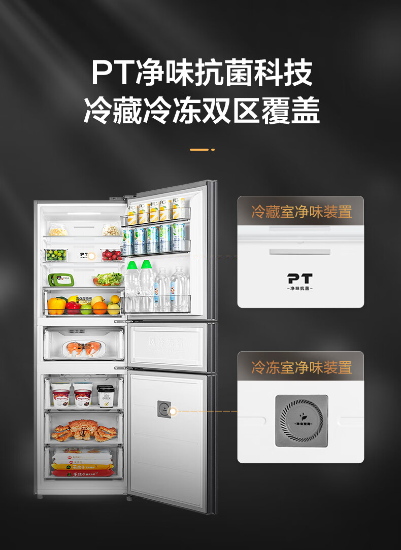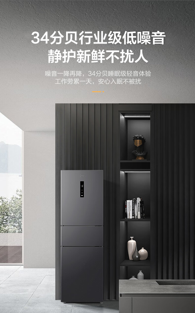 美的(Midea)三门大容量智能家用电冰箱小型三开门一级风冷无霜变频底噪34db双净味租房宿舍小冰箱MR-283WTPZE
