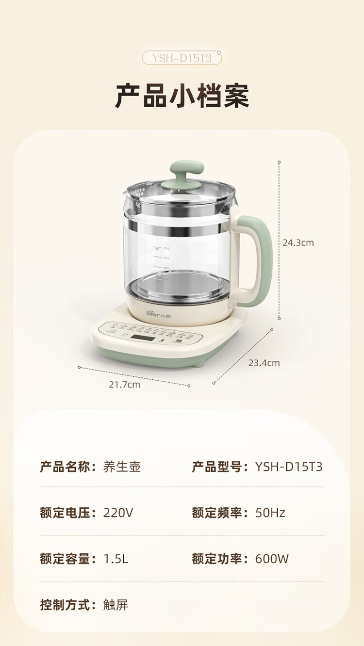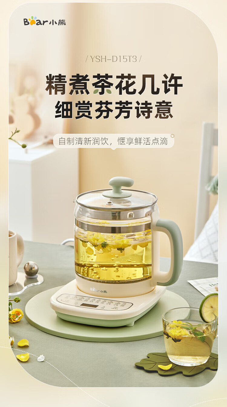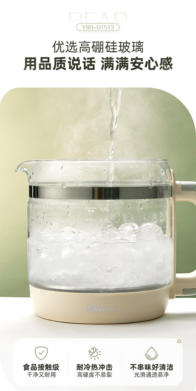 小熊养生壶电水壶烧水壶多功能煮茶器玻璃花茶壶 智能保温1.5L YSH-D15T3