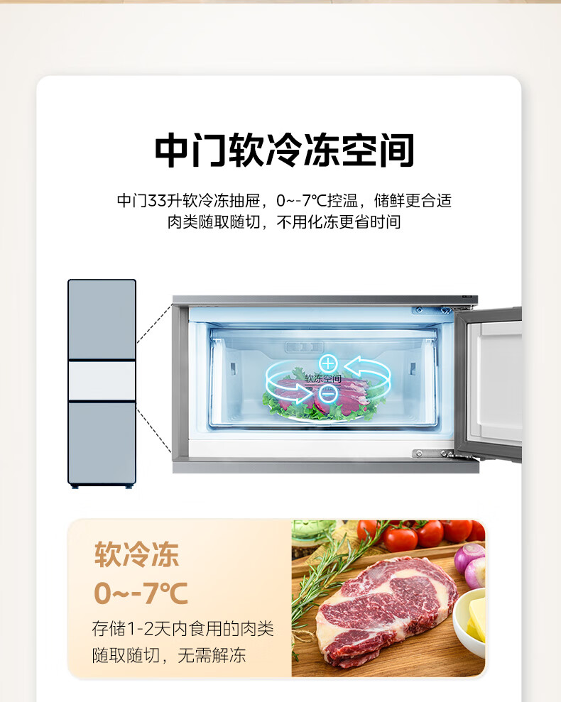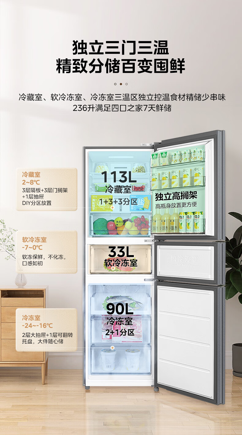 美的(Midea)236升三门家用电冰箱三开门小型冰箱风冷无霜节能省电净味保鲜租房小冰箱BCD-236WTM(E)中门软冷冻