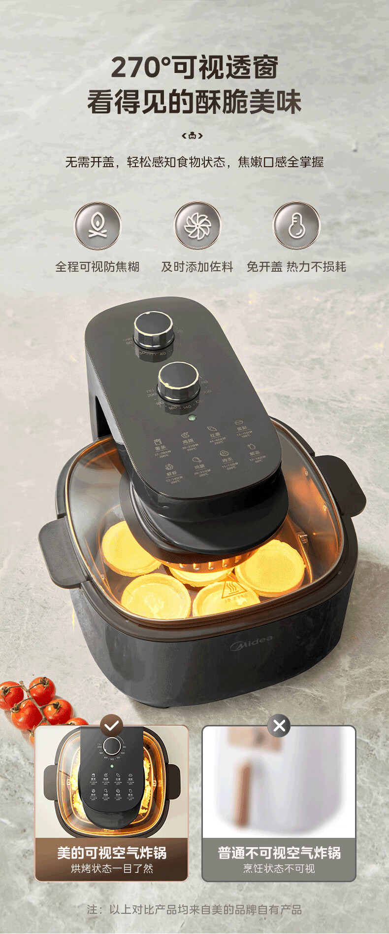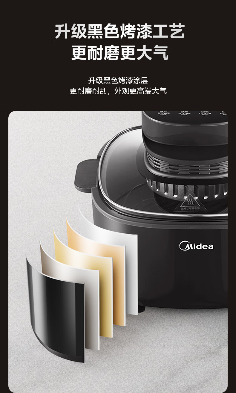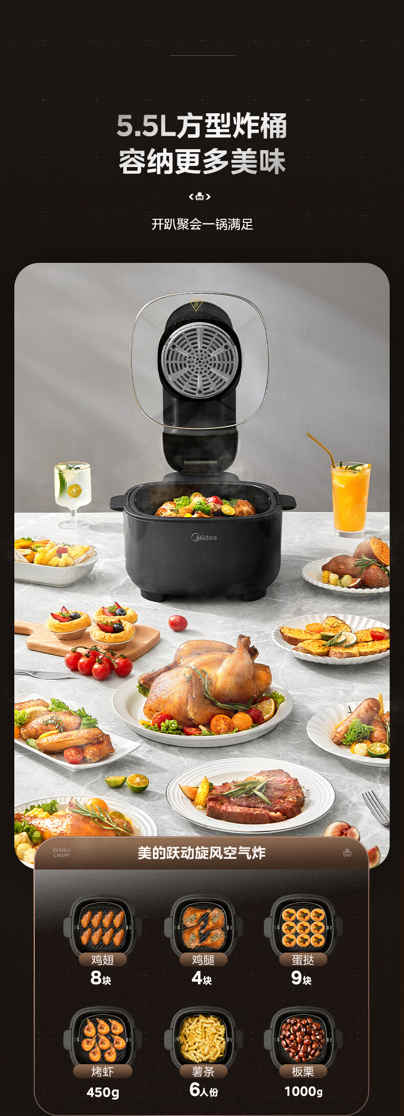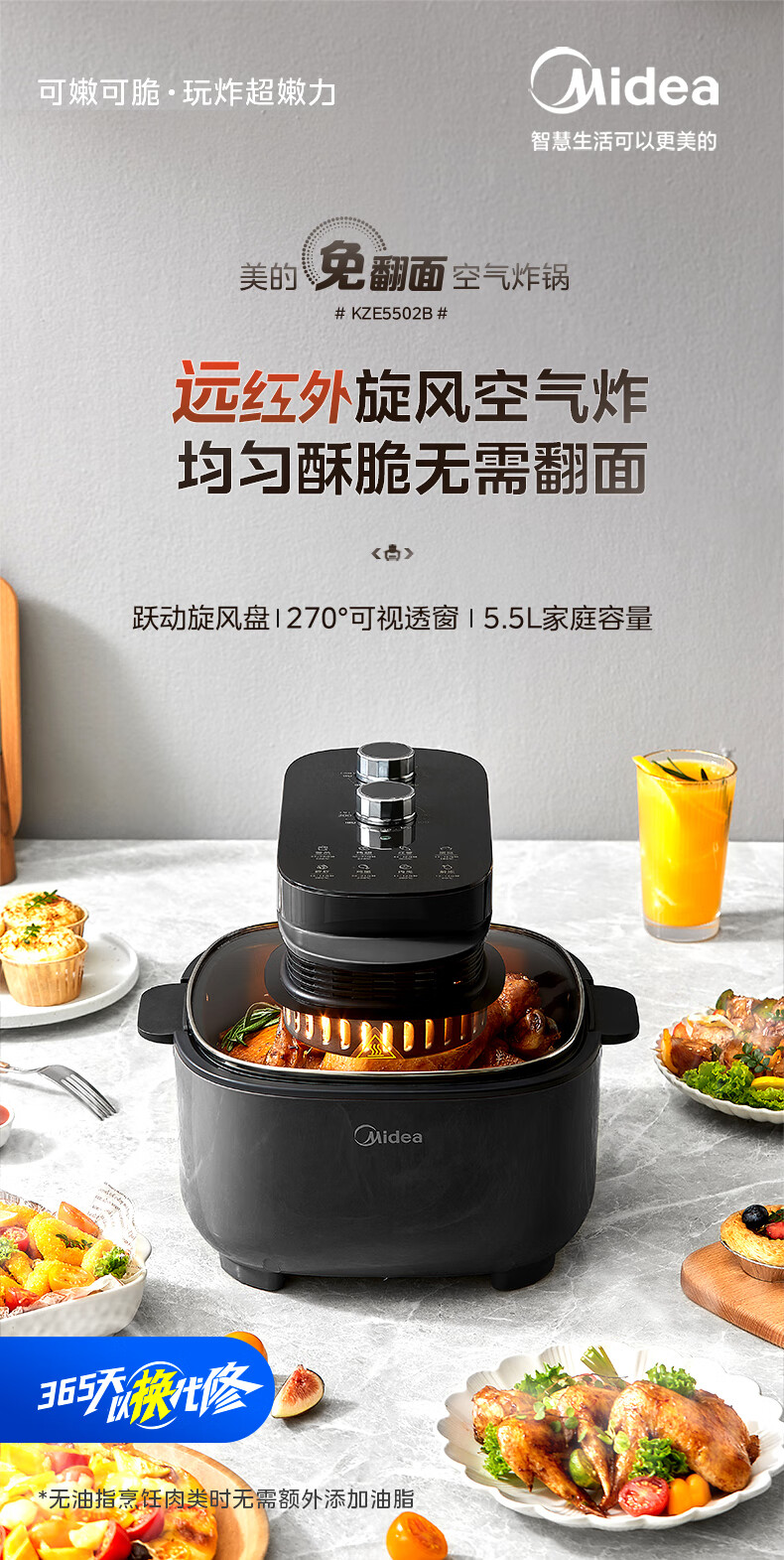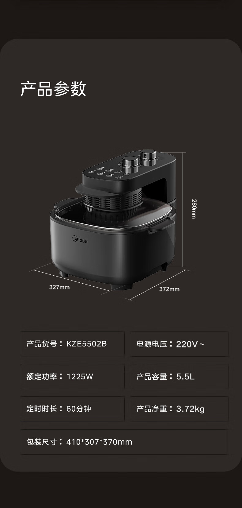 美的(Midea)不用翻面 空气炸锅 可视窗口 不沾易清洗 准确定时 轻脂 低油煎炸 5.5L大容量 MF-KZE5502B