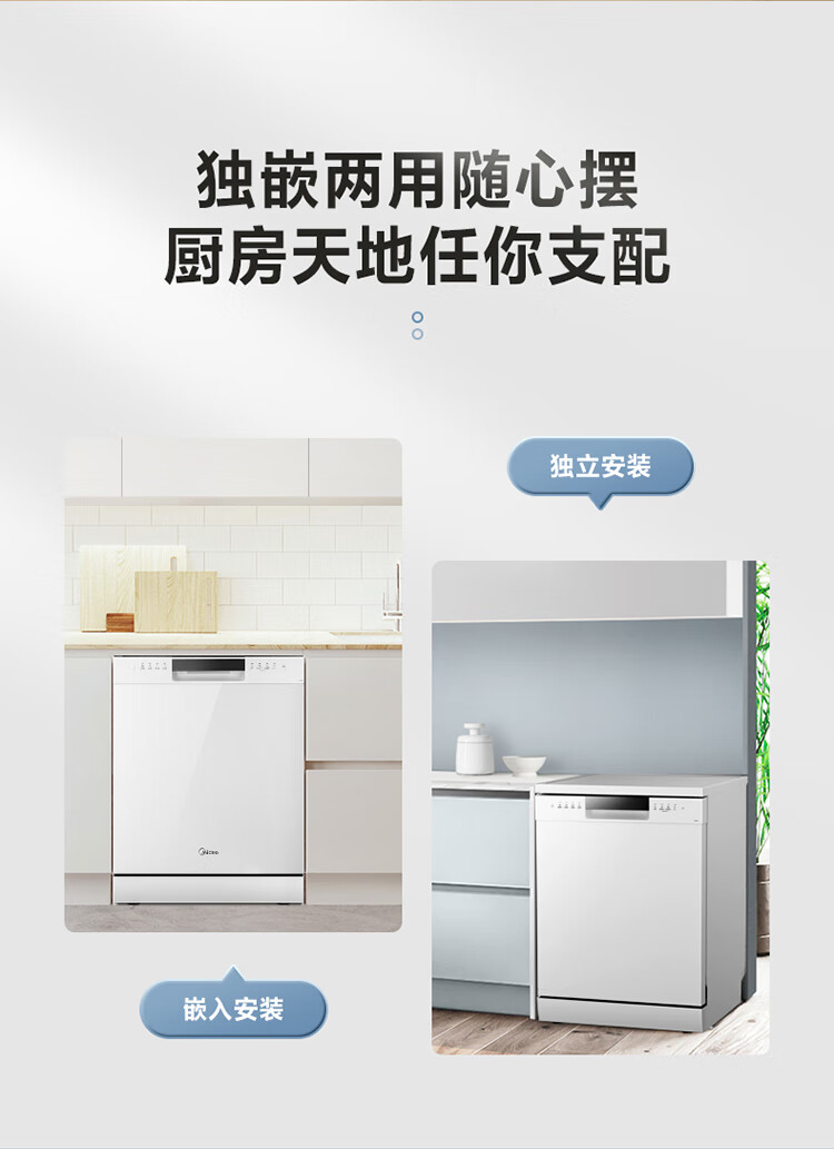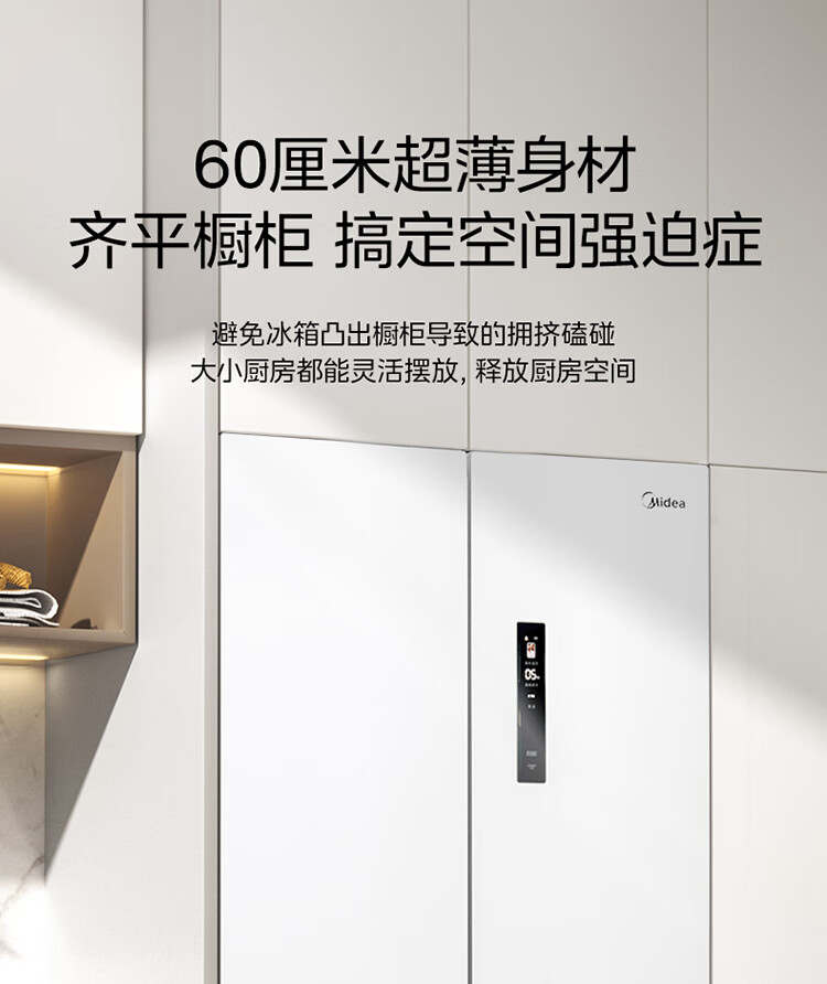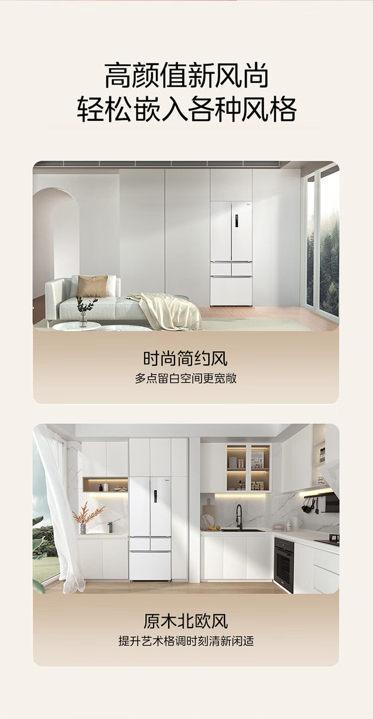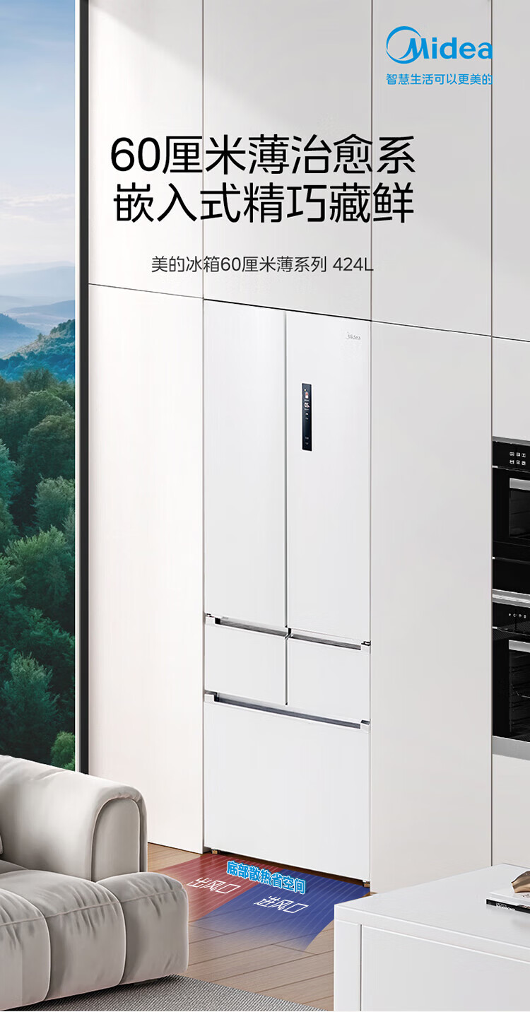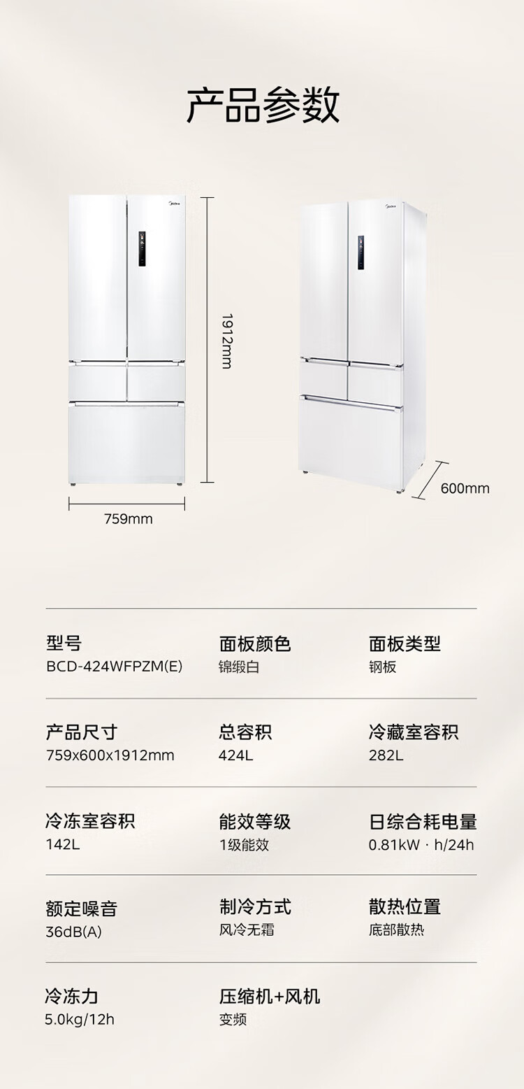 美的(Midea)厨房白色嵌入式套装 60厘米薄系列424升法式多门冰箱BCD-424WFPZM(E)+15套热风烘干洗碗机RX600-W
