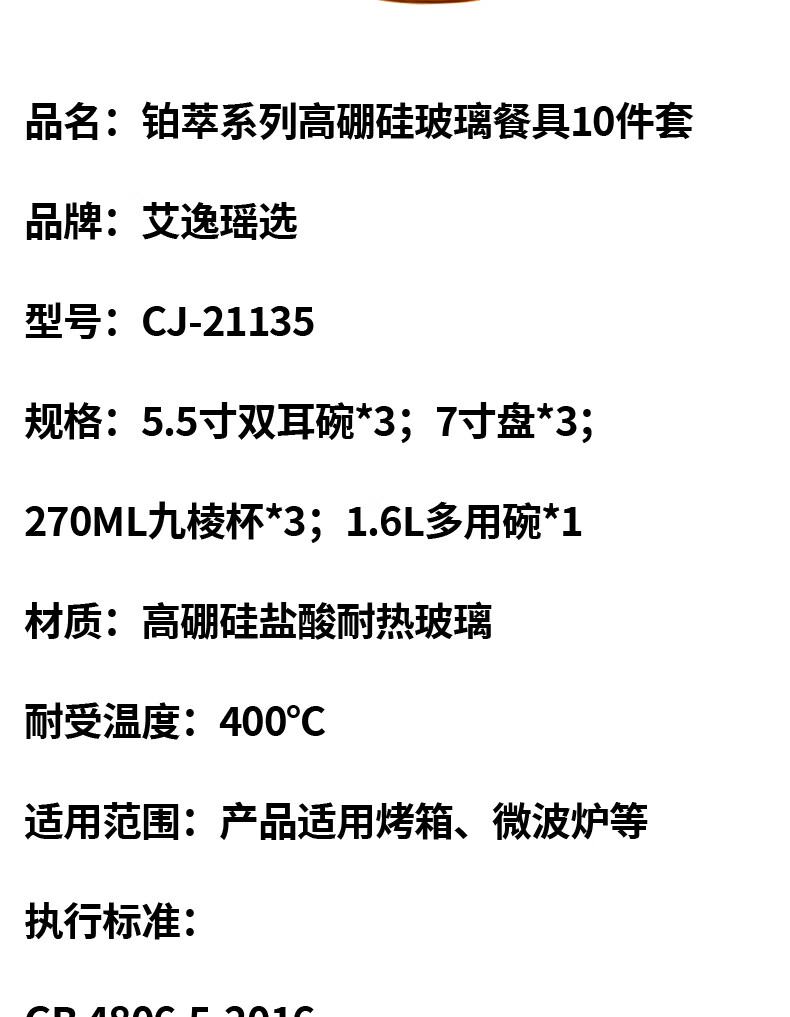 艾逸瑶选铂萃系列高硼硅玻璃餐具10件套CJ-21135