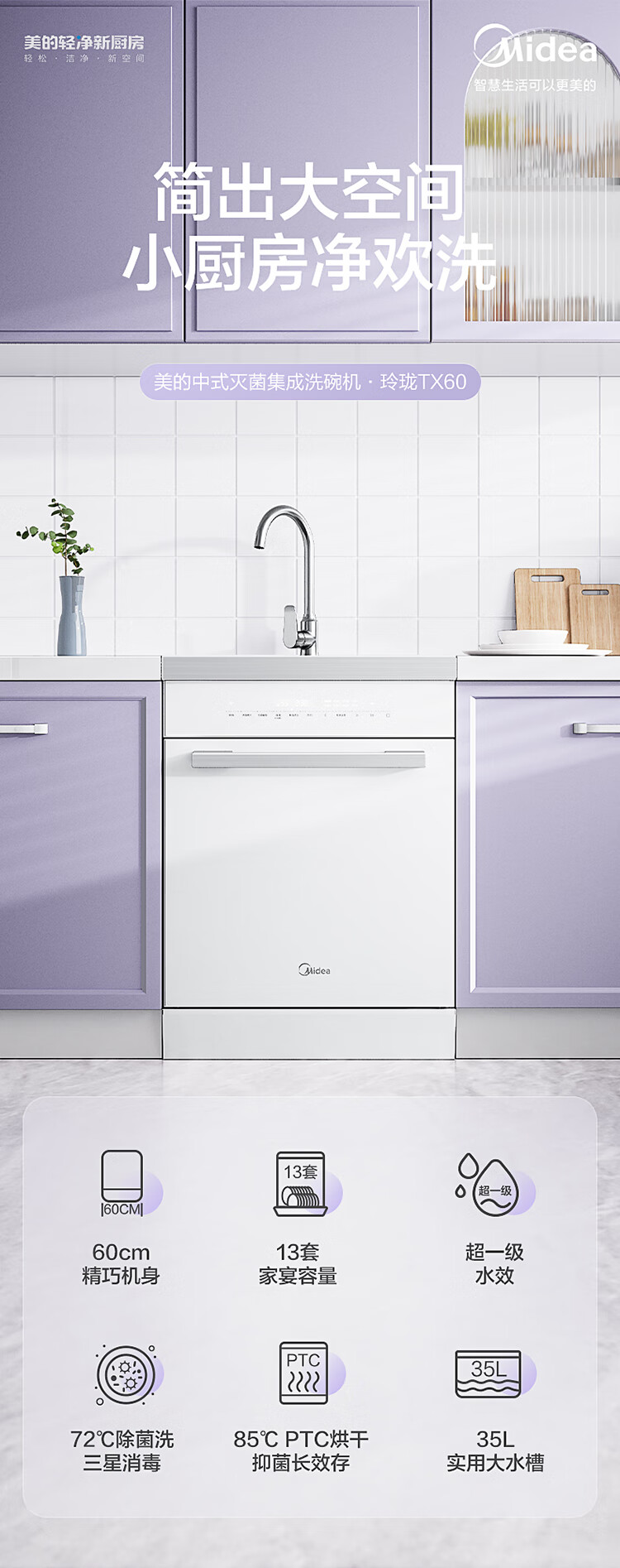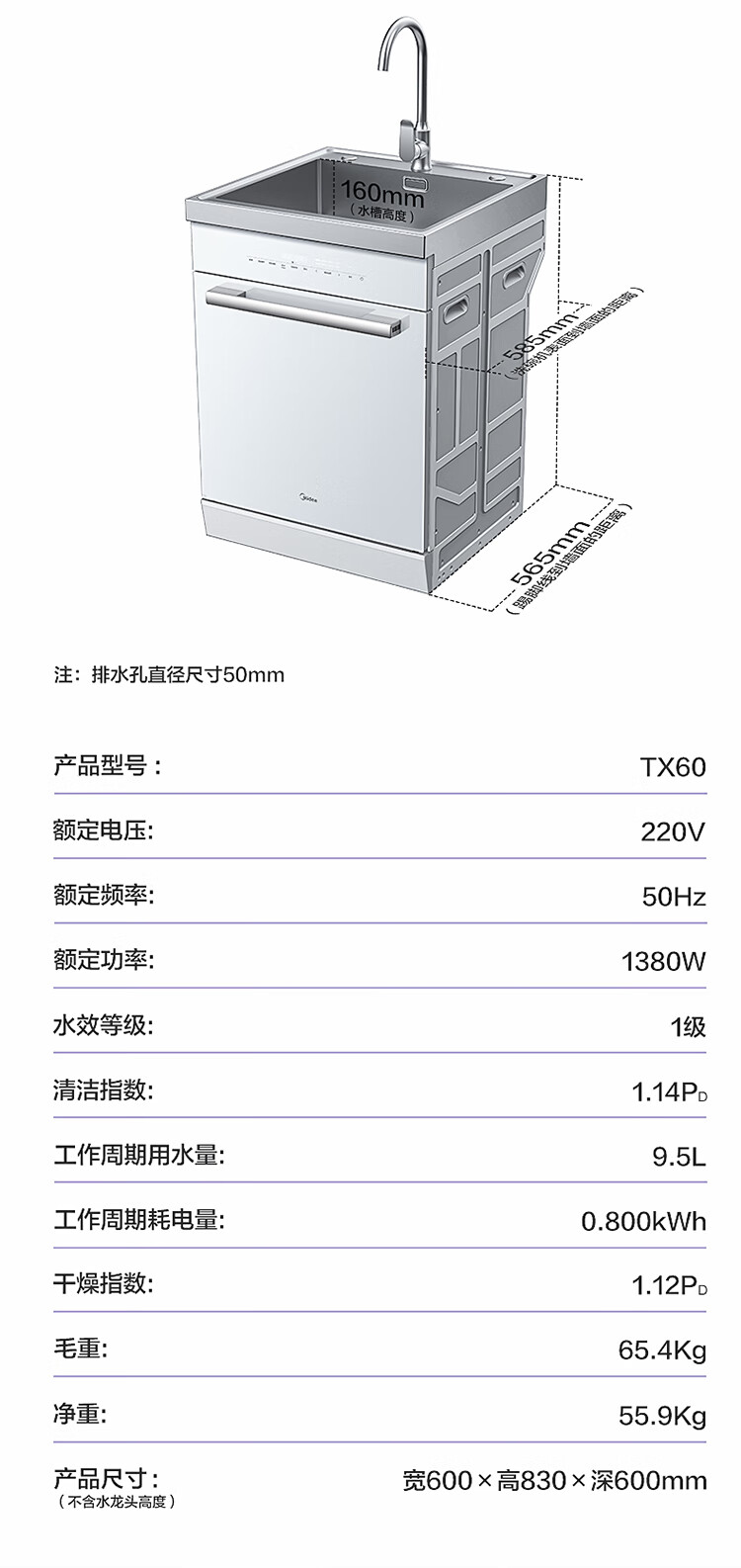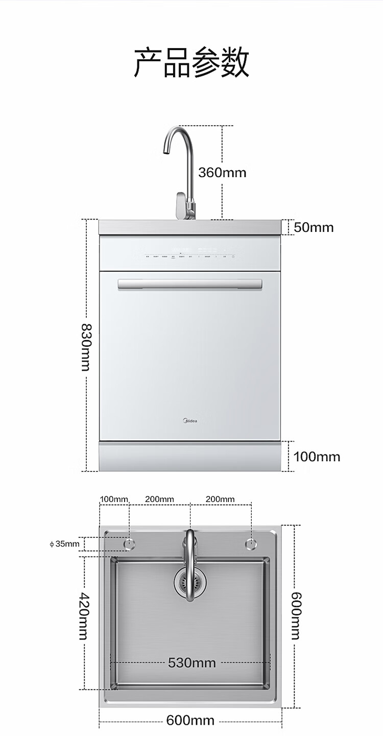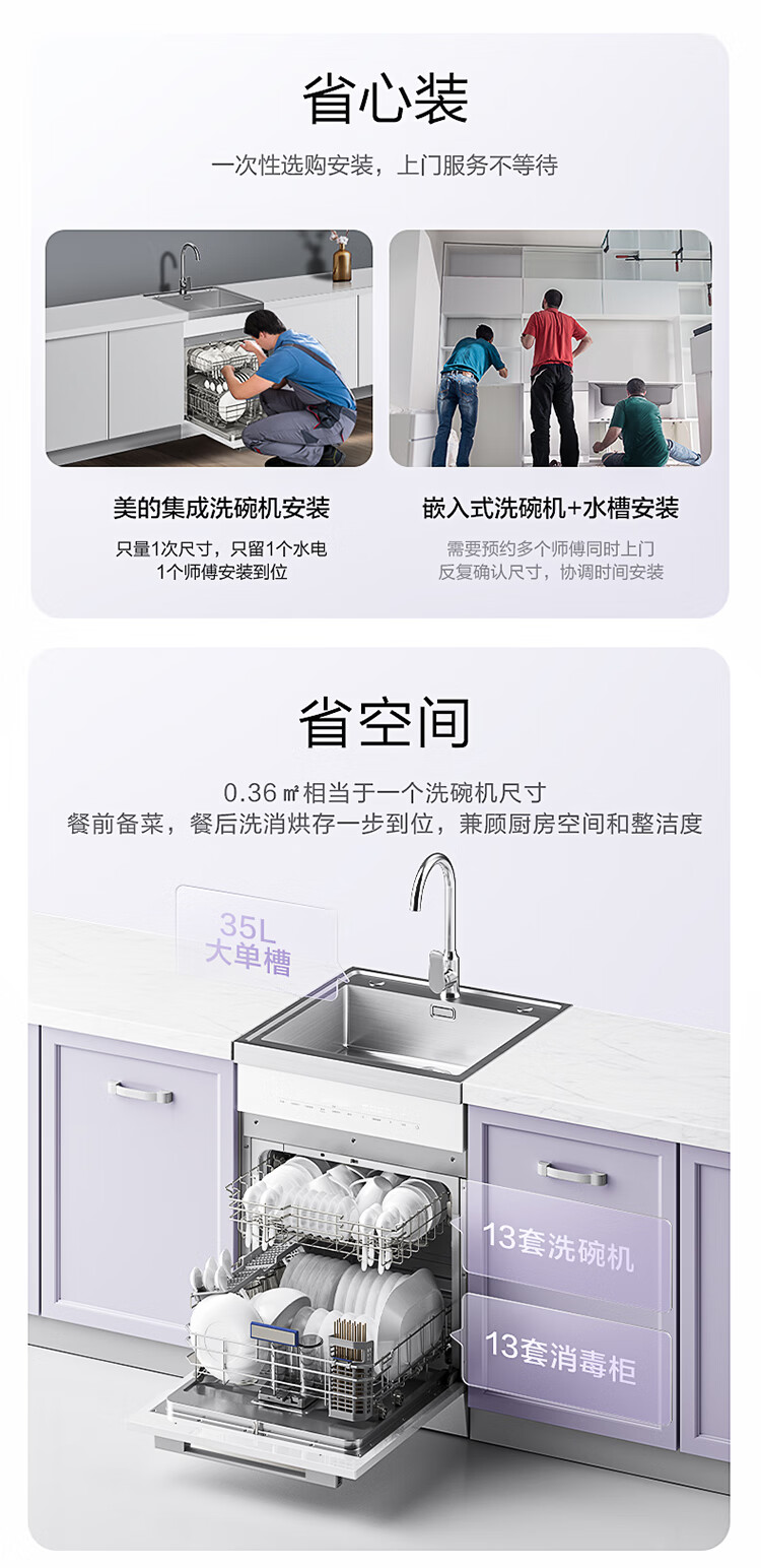 美的(Midea)13套集成水槽洗碗机TX60 一体式 大单槽 超一级水效 PTC热风烘干 99.99%灭菌率