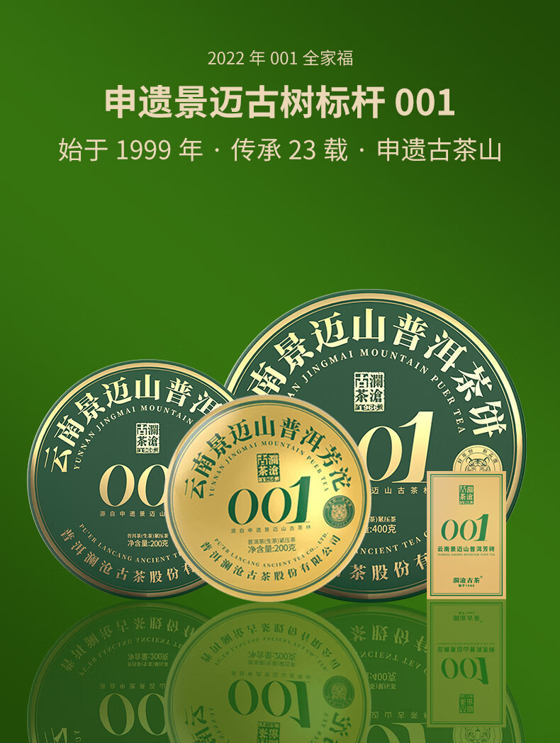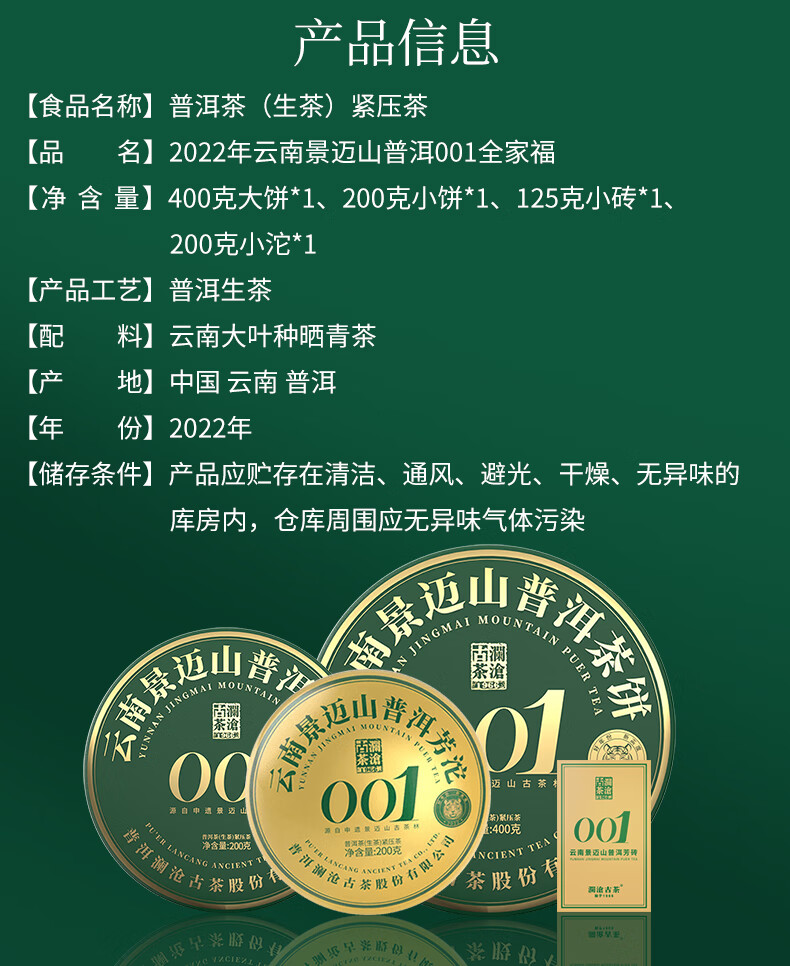 澜沧古茶叶普洱生茶 2022年云南普洱001全家福景迈古树茶茶叶925g