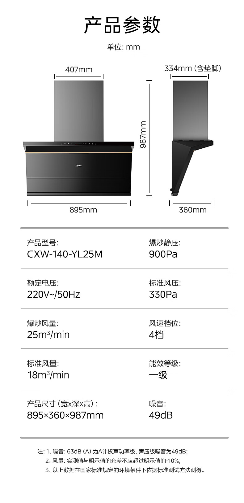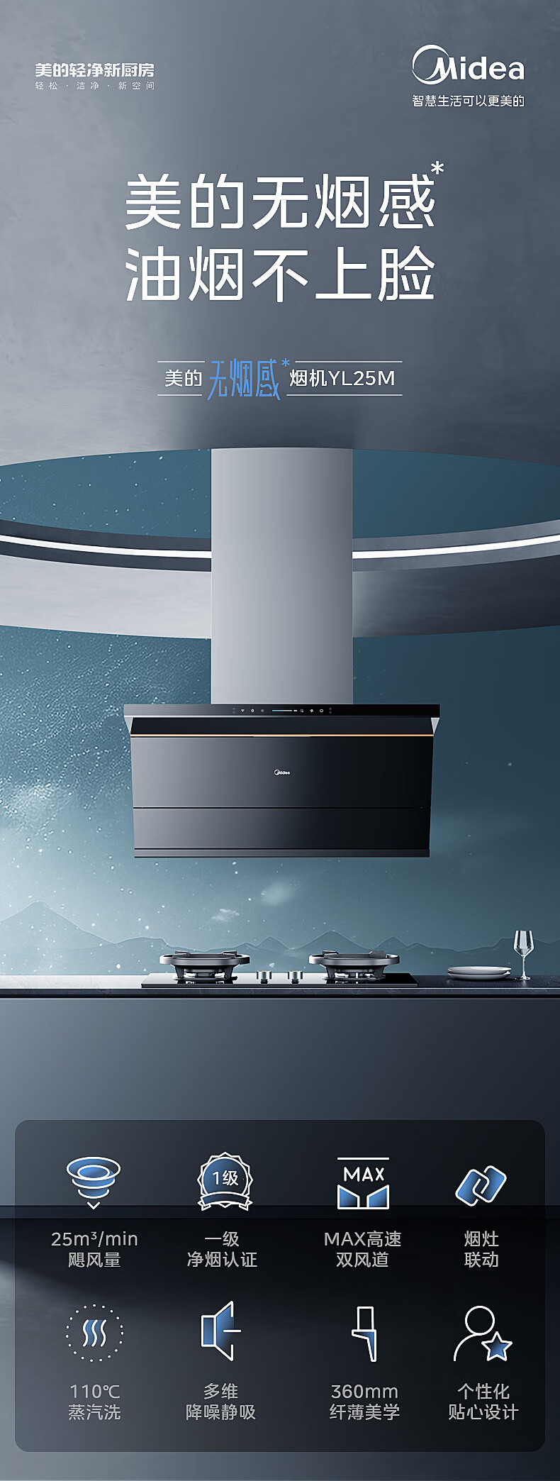 美的(Midea)抽油烟机 家用侧吸25风量大吸力 超薄近吸 无烟感7字型排油烟机 蒸汽洗烟机CXW-140-YL25M