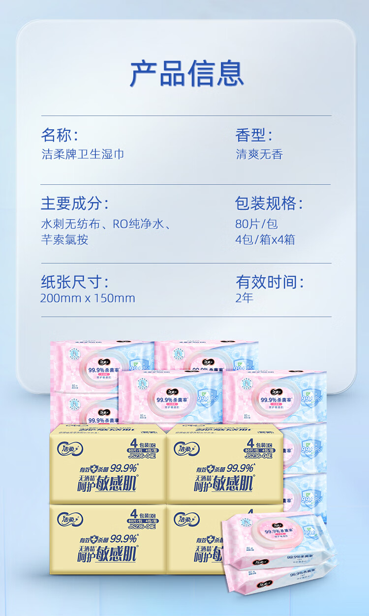 洁柔湿巾 加厚80片*16包 99.9%杀菌清洁 清爽不粘腻 呵护敏感肌肤