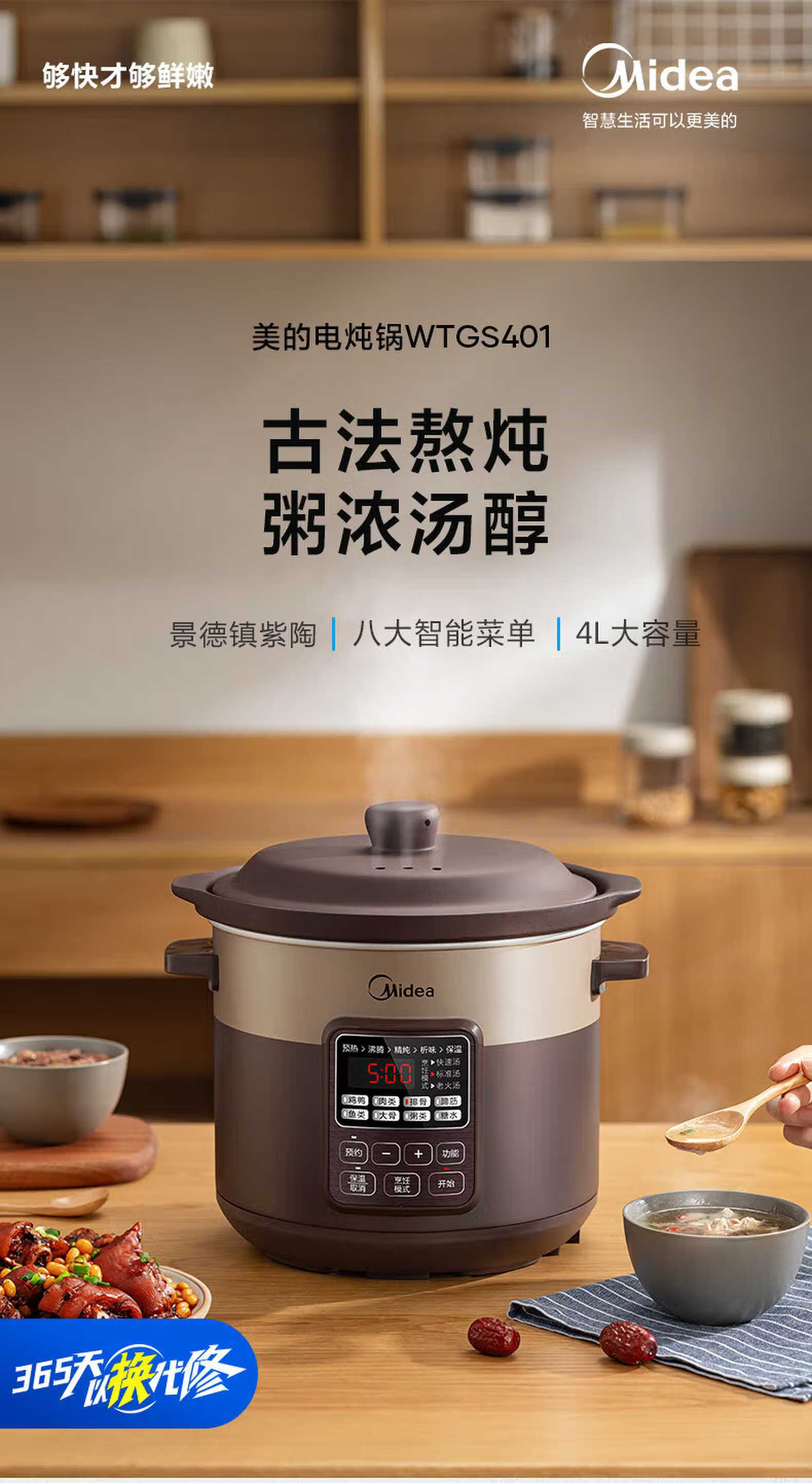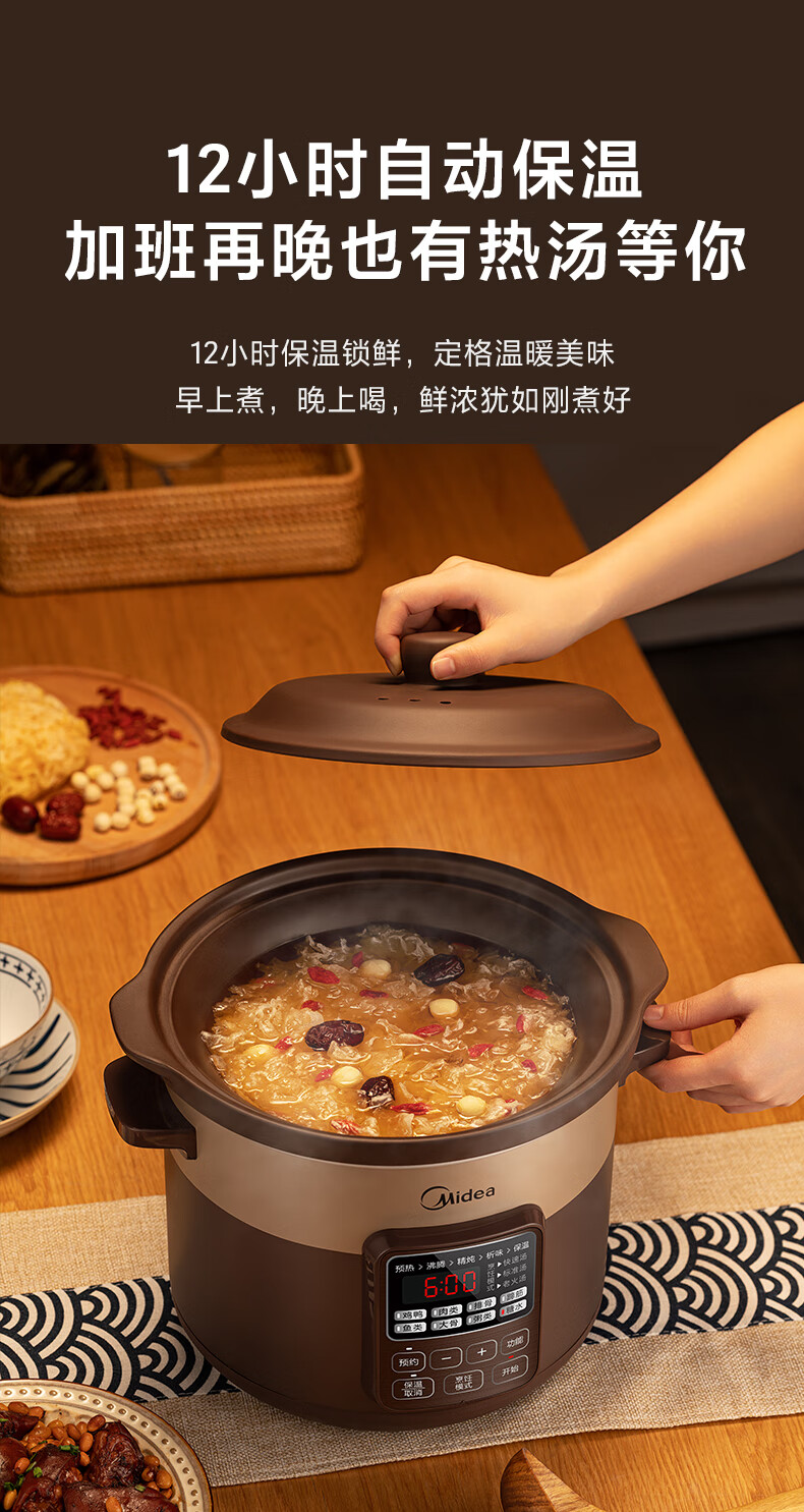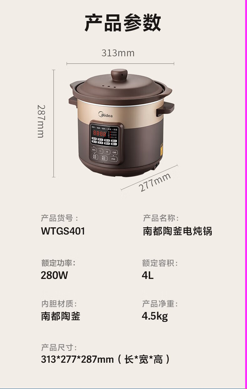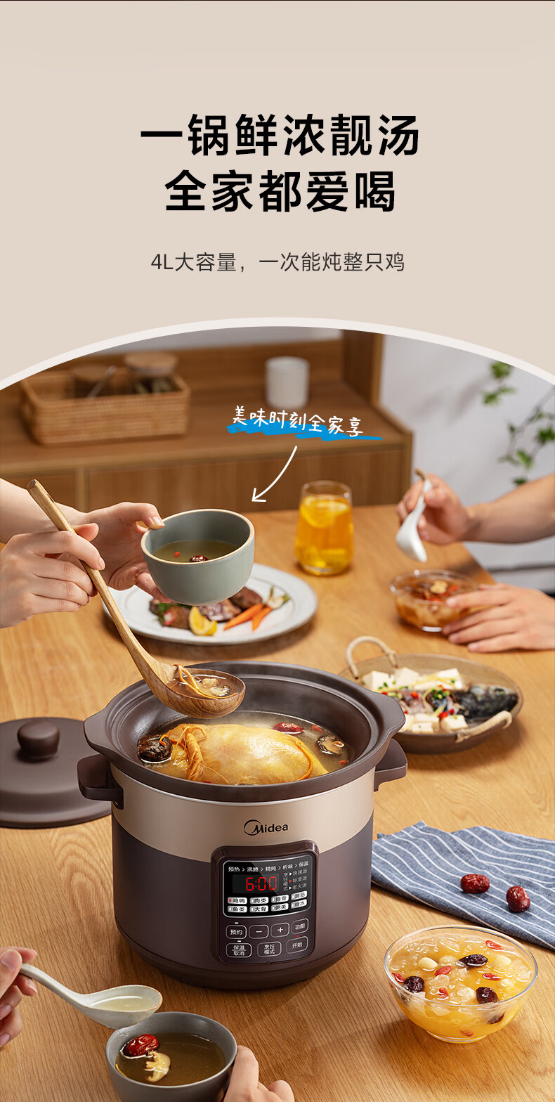 美的(Midea)电炖锅 电炖盅 煲汤锅炖汤锅 电砂锅 煮粥锅 紫砂内胆 4升煲汤电炖锅家用智能预约WTGS401