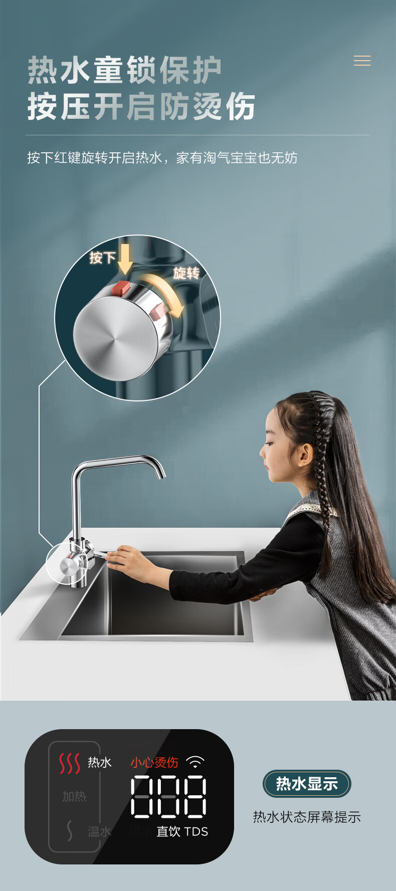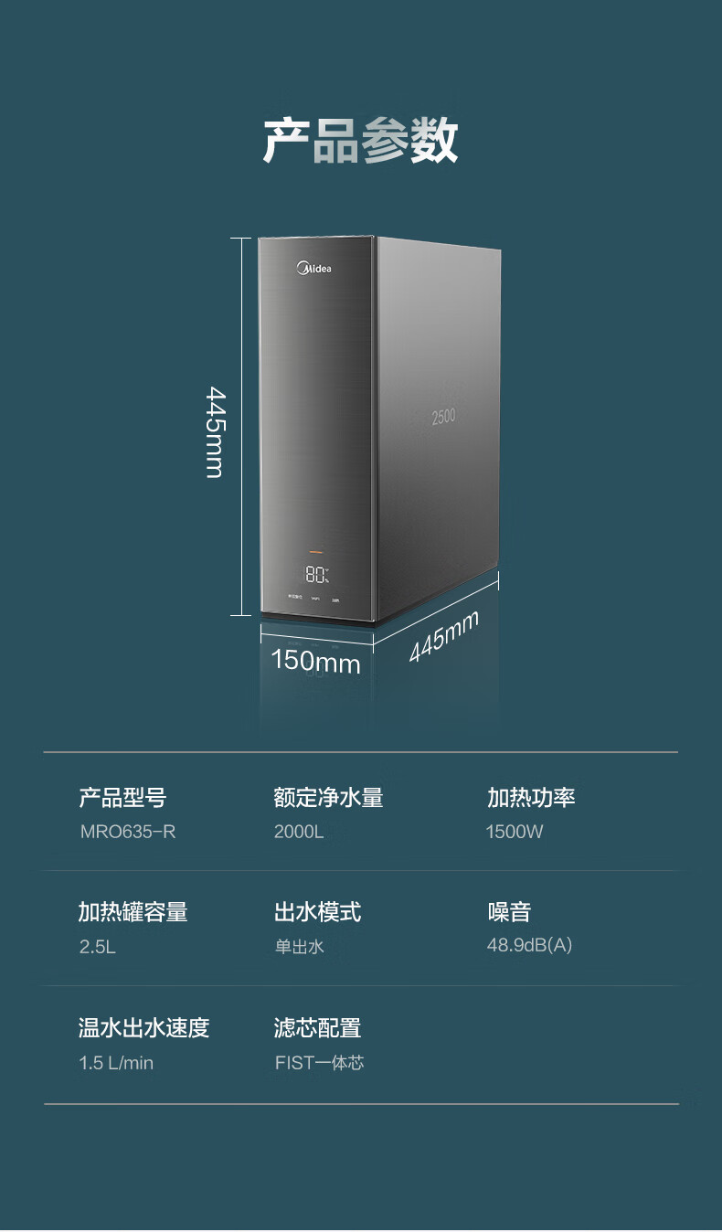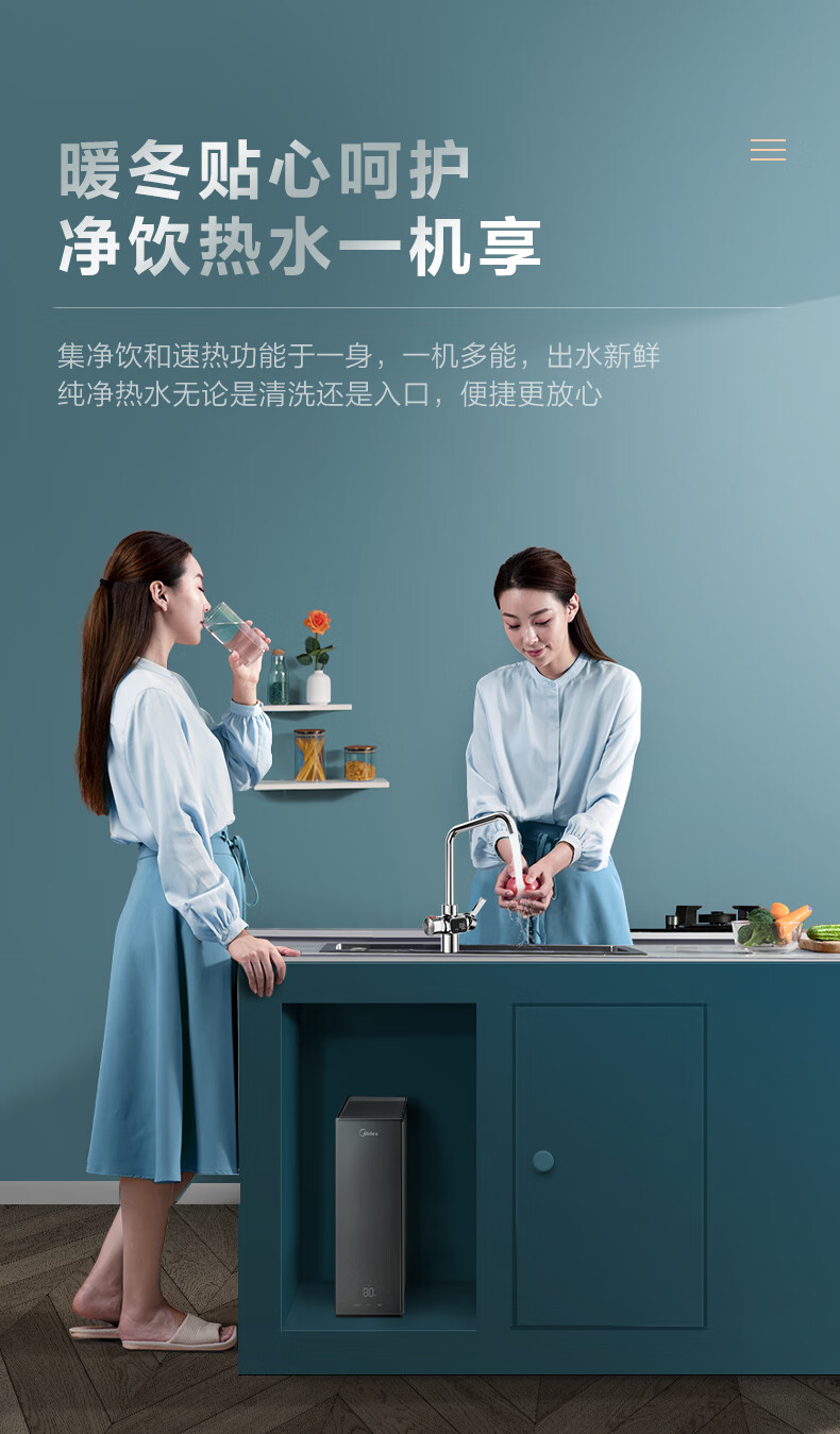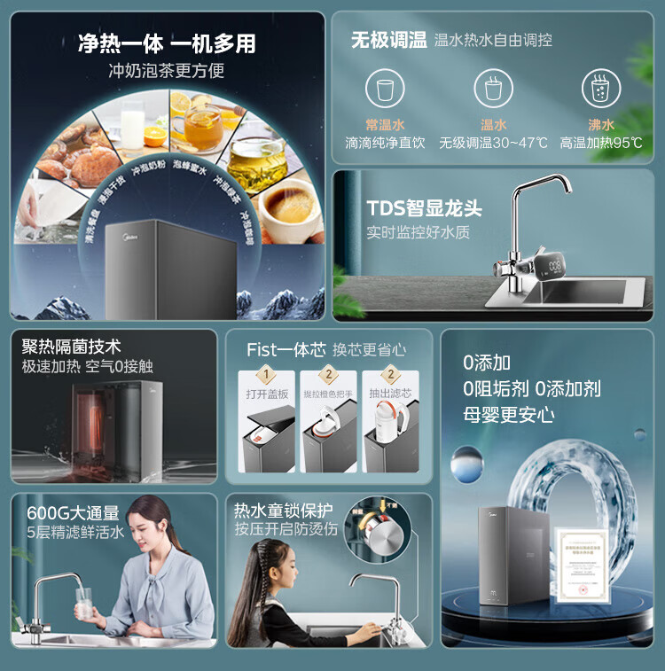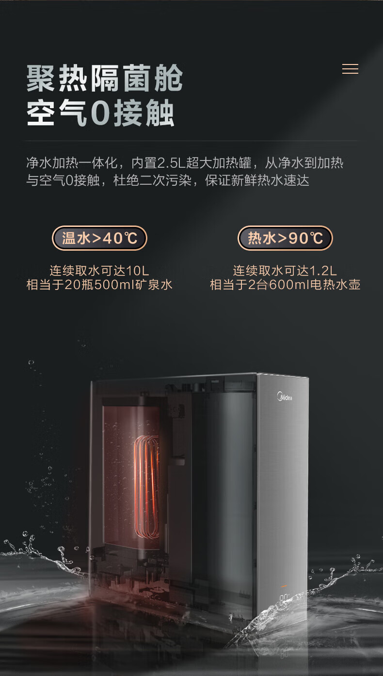 美的(Midea)白泽600G加热净水器 无级调温TDS数显 热水流速1.5L/min 家用直饮厨下即热净饮一体机 MRO635-R