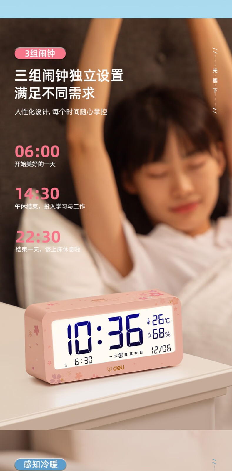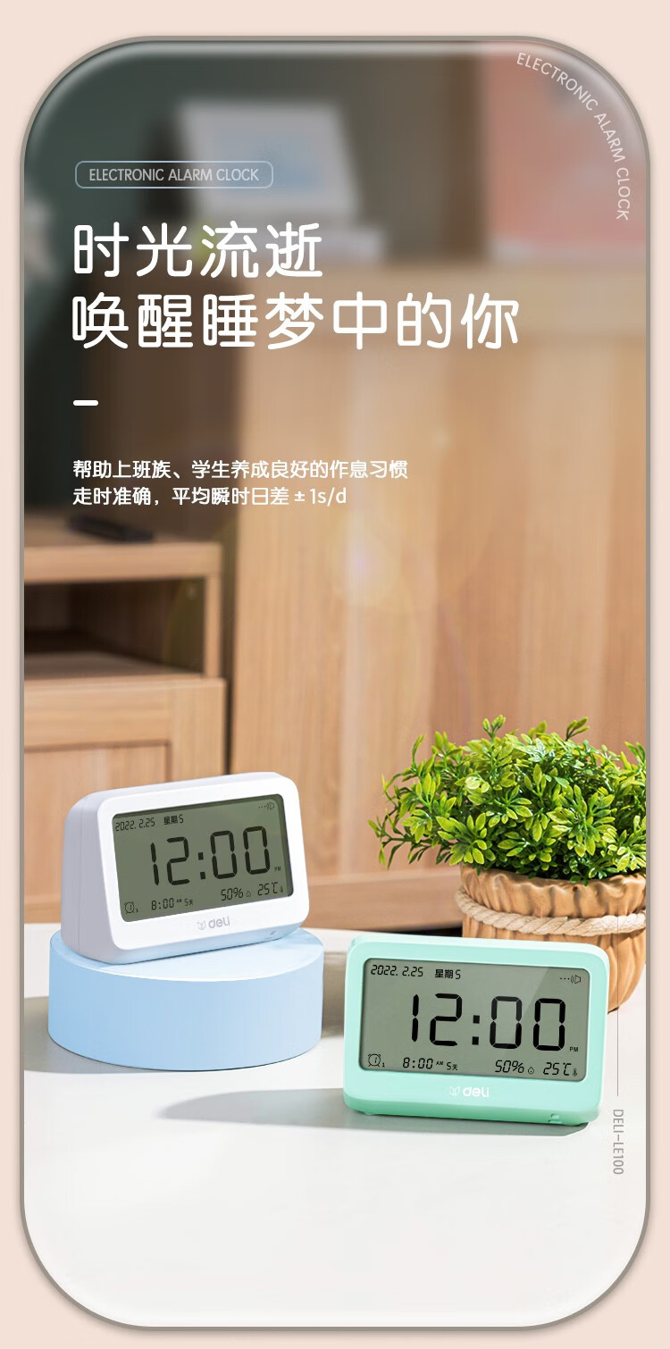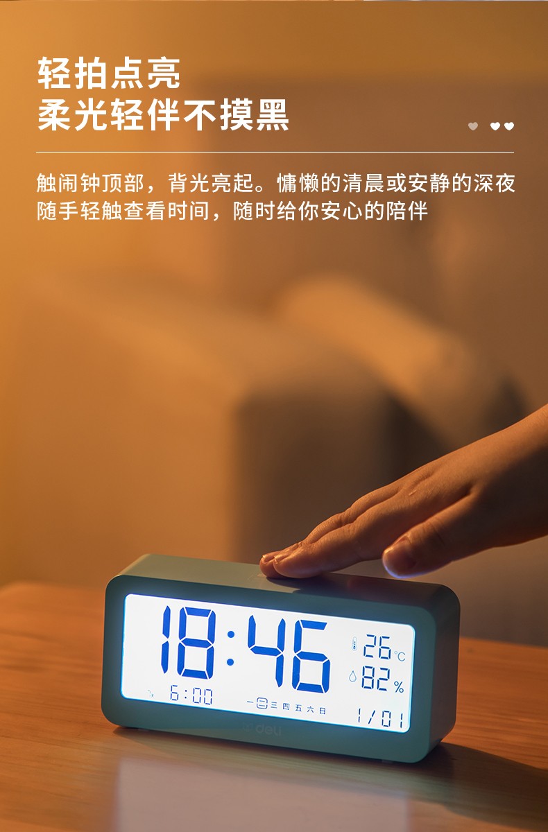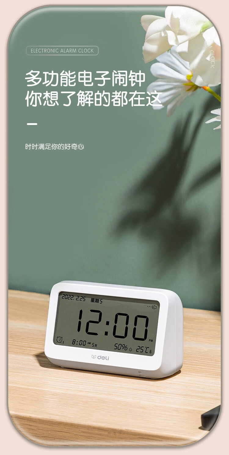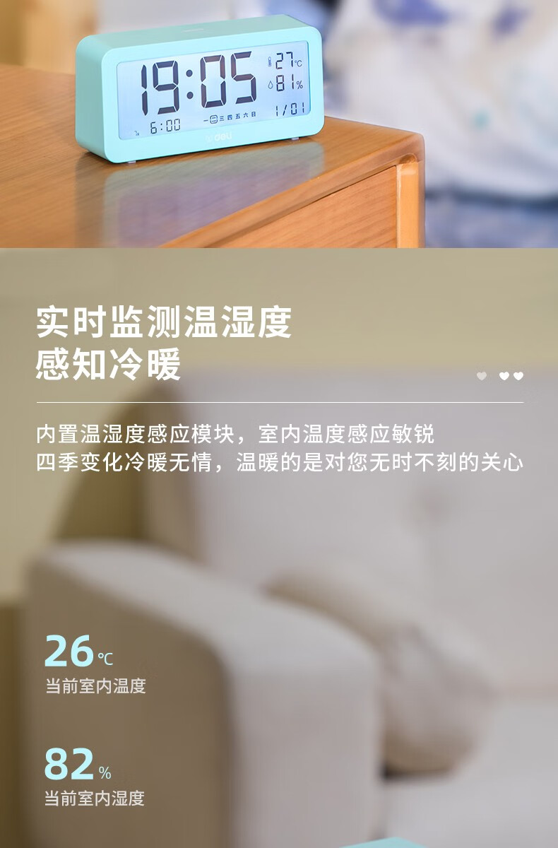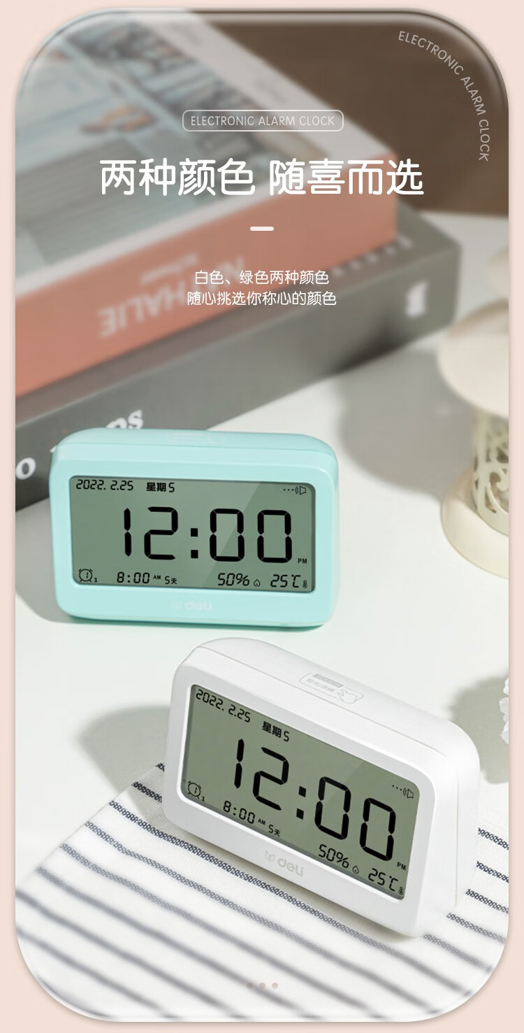 得力(deli)学生电子闹钟 智能背光电子时钟床头钟 温湿度计专用起床神器时间 【推荐】中号简洁白-起床神器