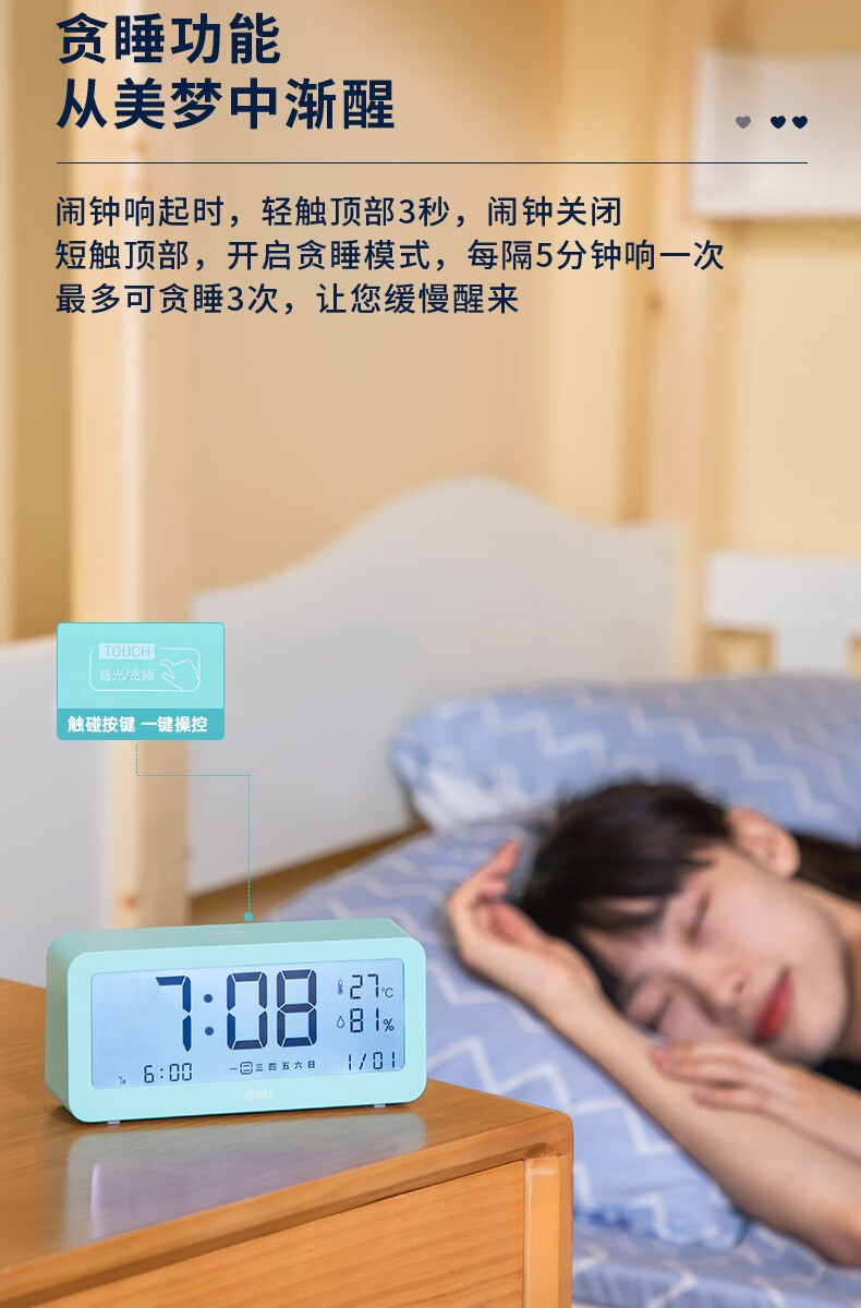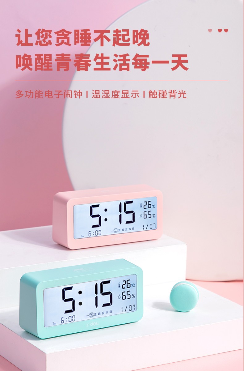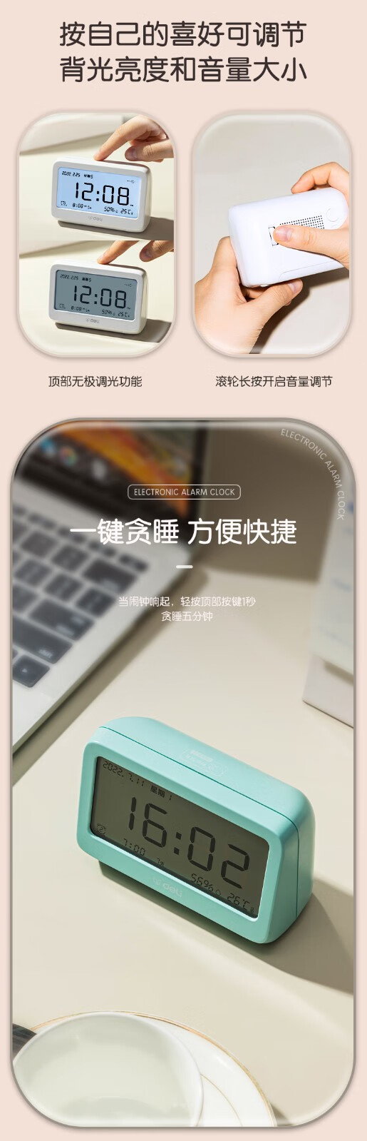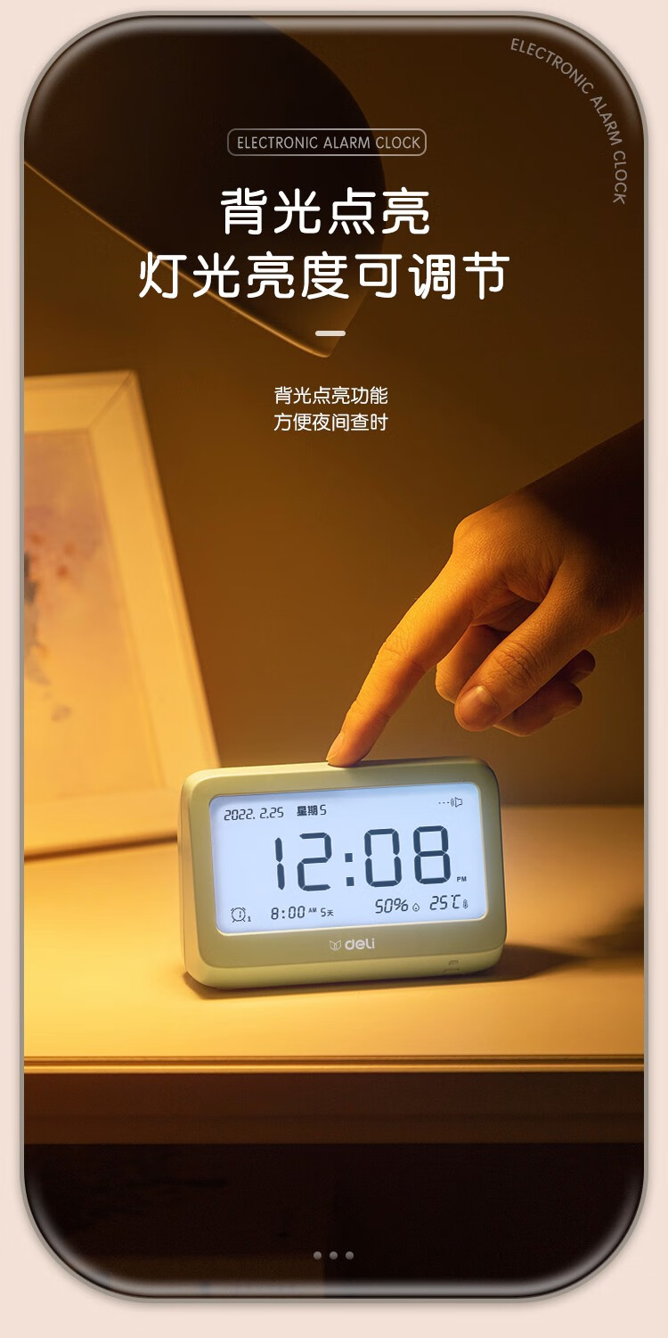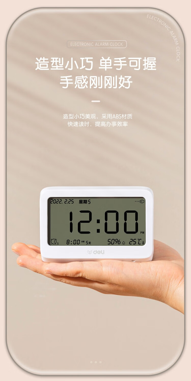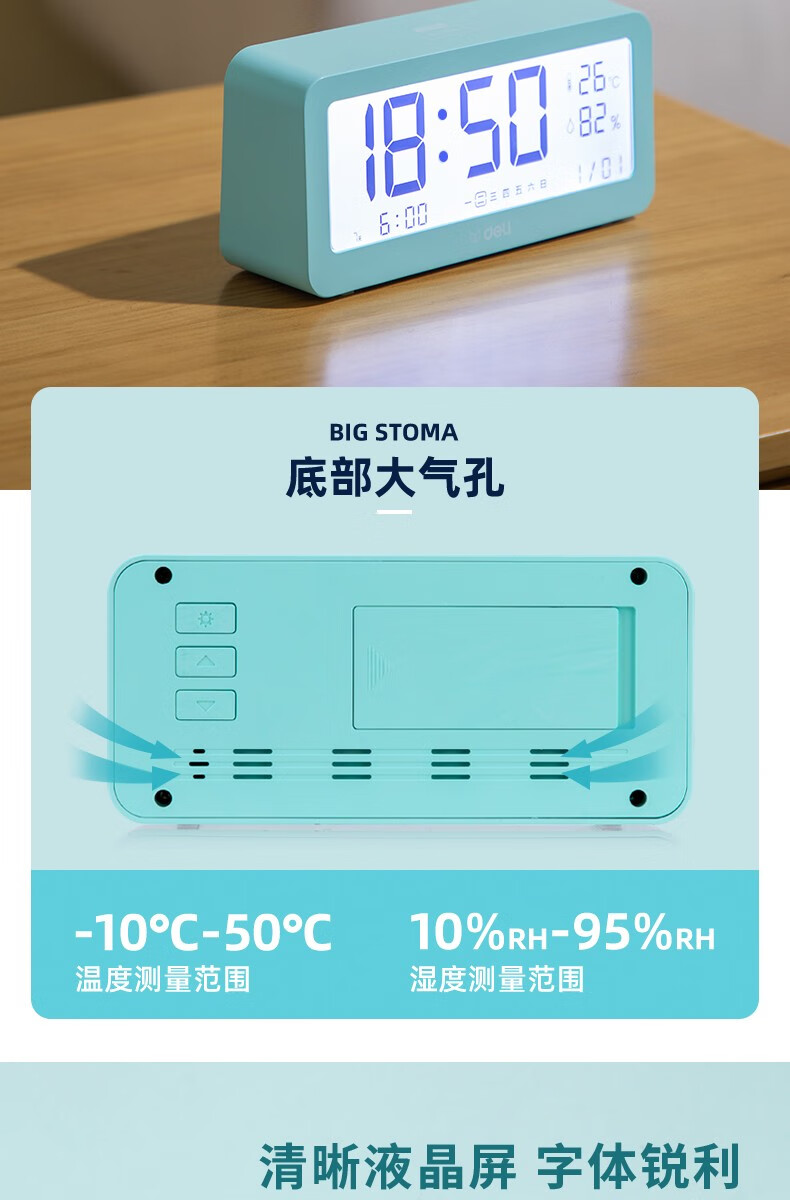 得力(deli)学生电子闹钟 智能背光电子时钟床头钟 温湿度计专用起床神器时间 【推荐】中号简洁白-起床神器