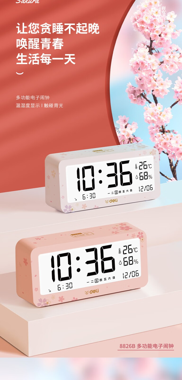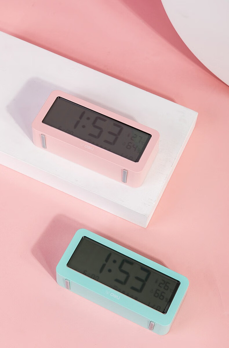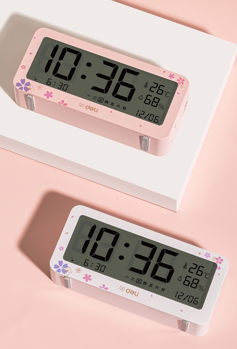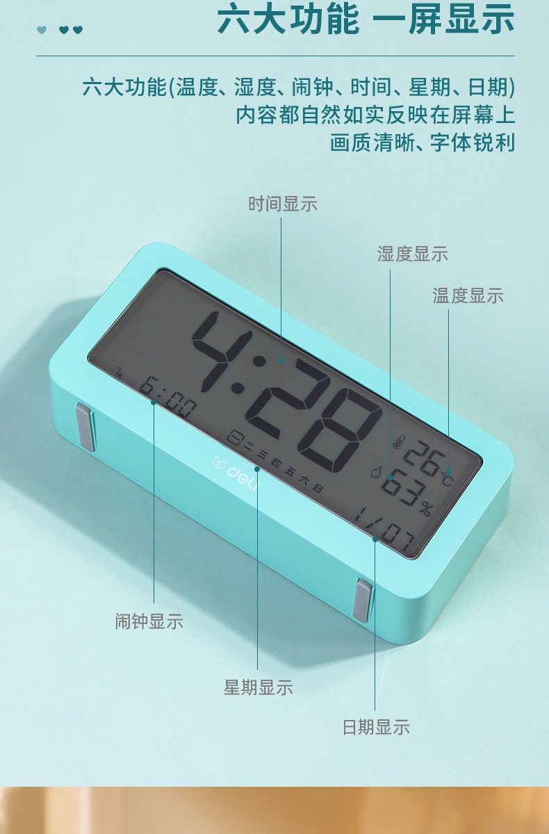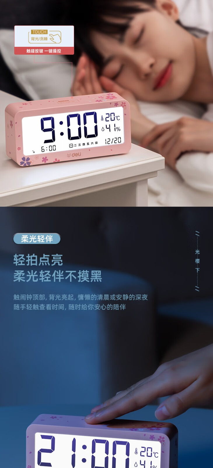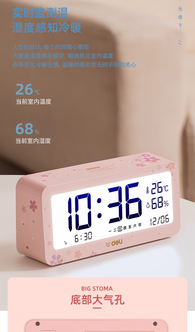 得力(deli)学生电子闹钟 智能背光电子时钟床头钟 温湿度计专用起床神器时间 【推荐】中号简洁白-起床神器